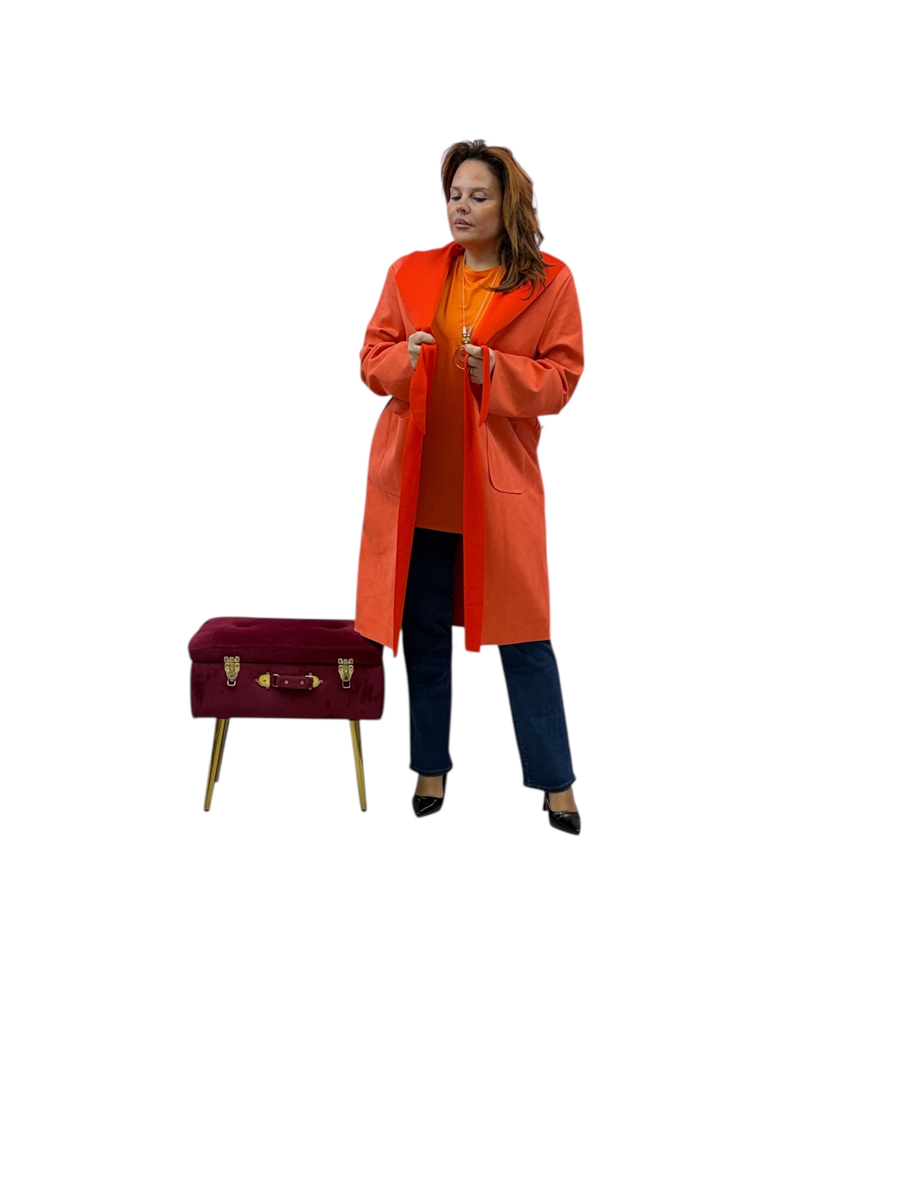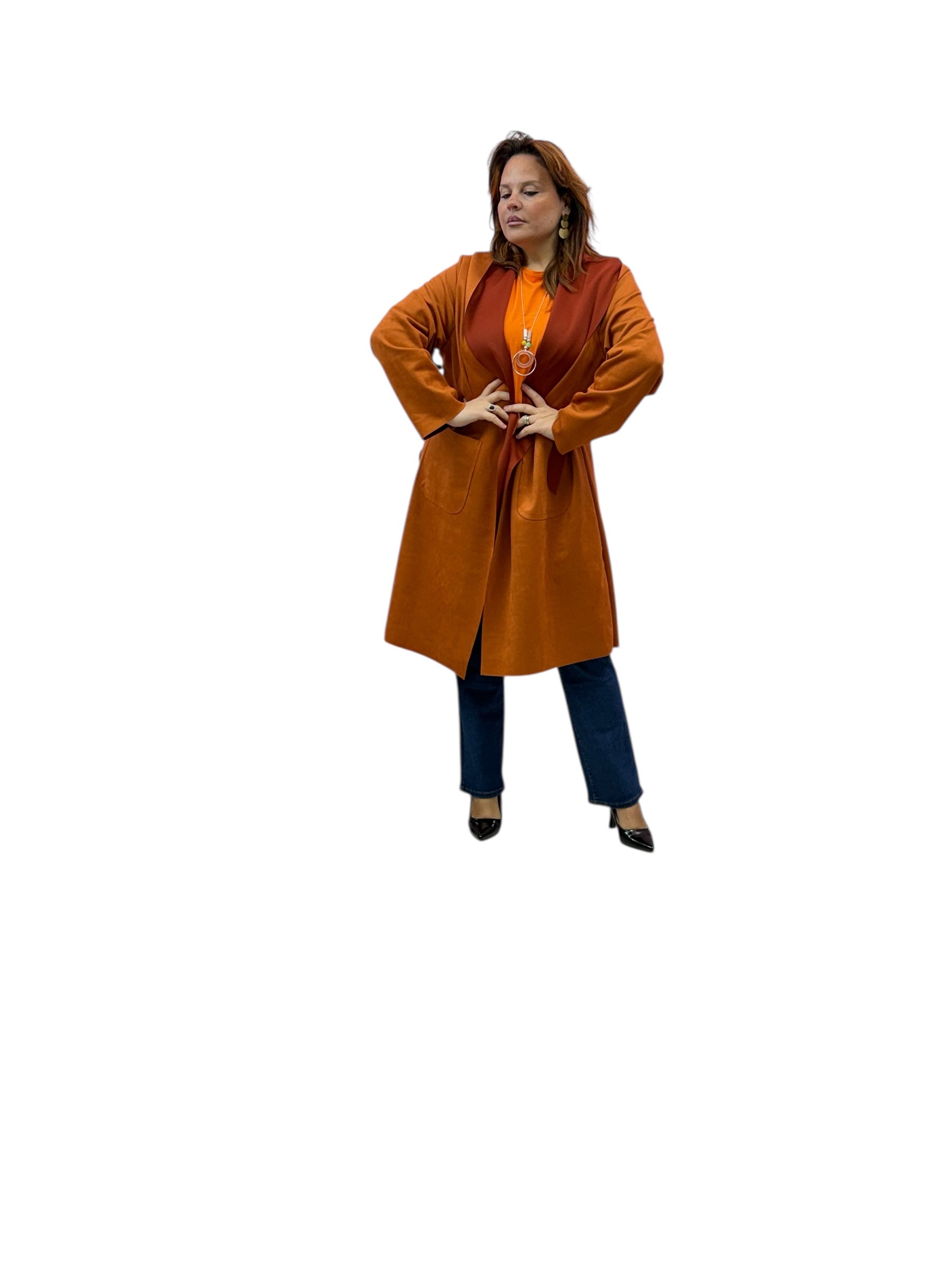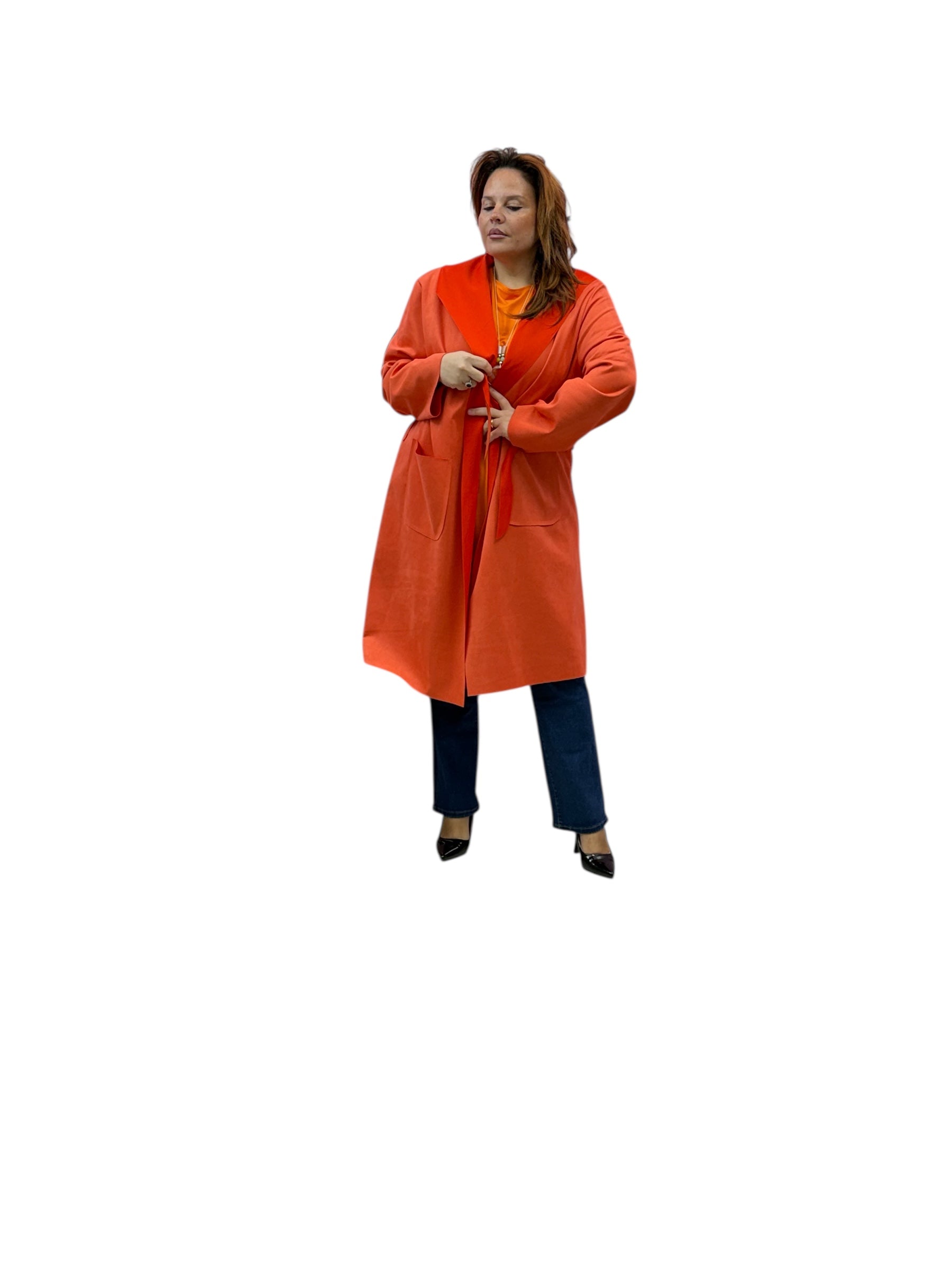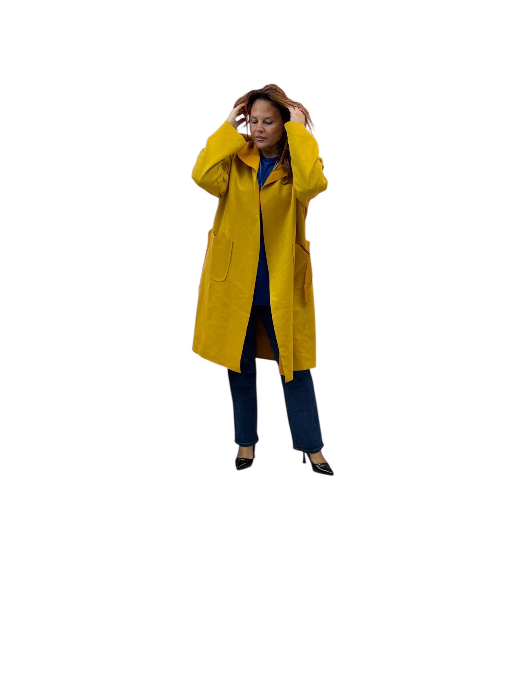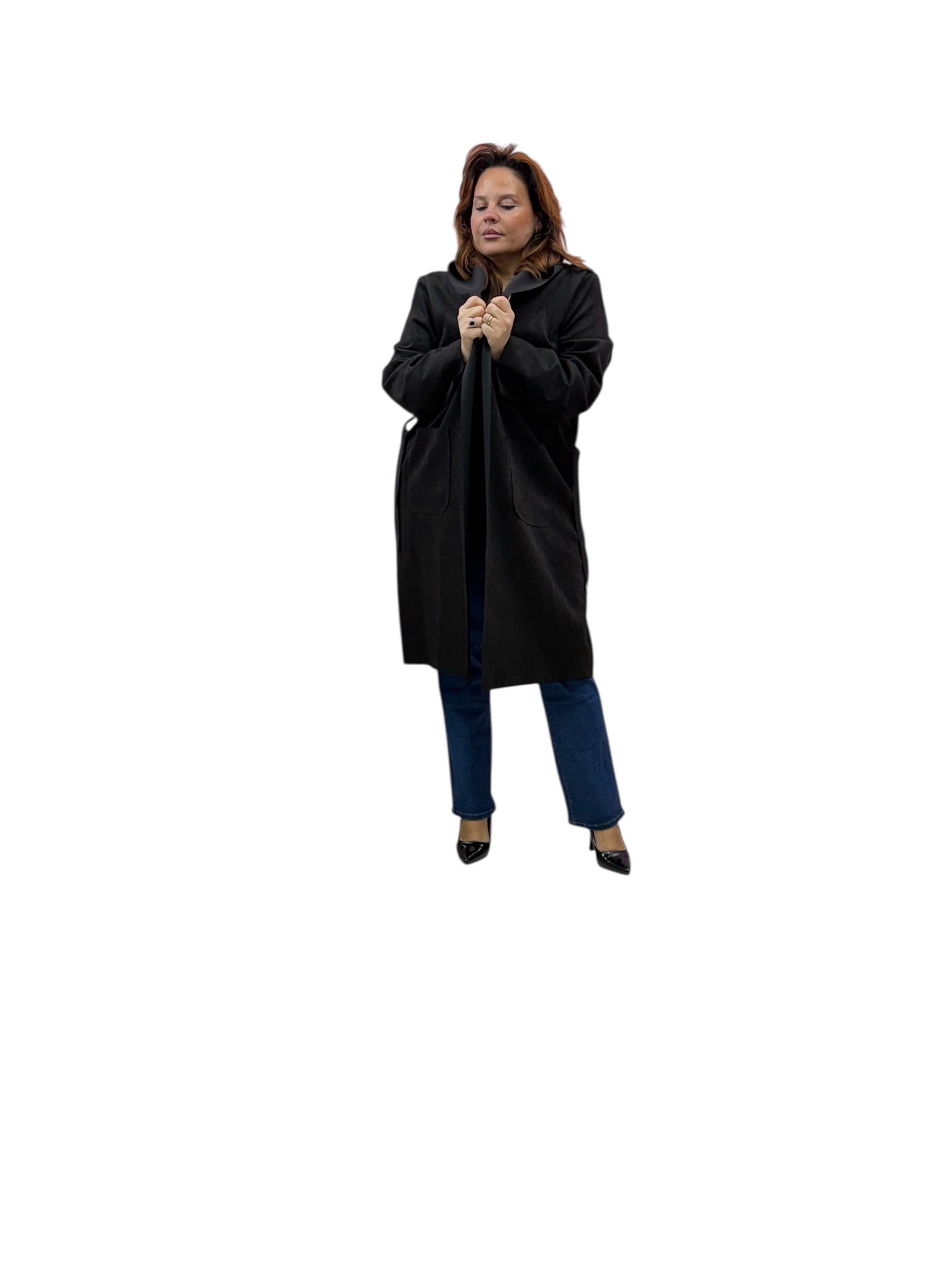 Spolverino lungo in ecodaino con cappuccio e cintura
