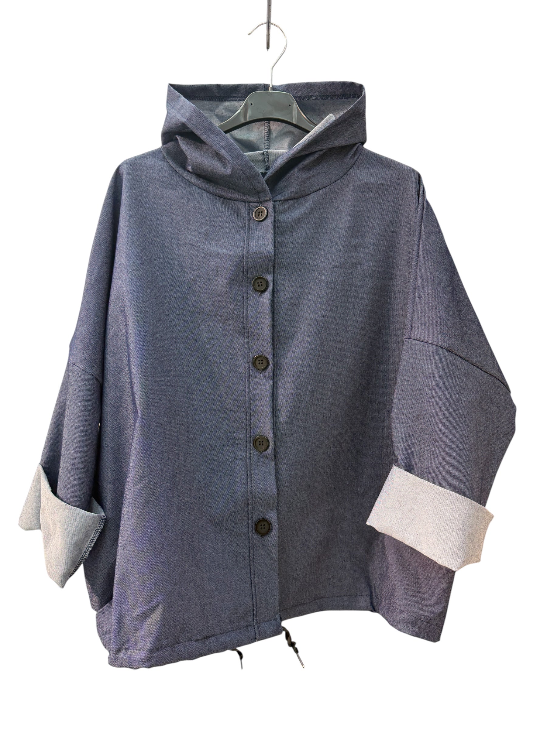 Spolverino in cotone jeans con cappuccio,bottoni e laccetto
