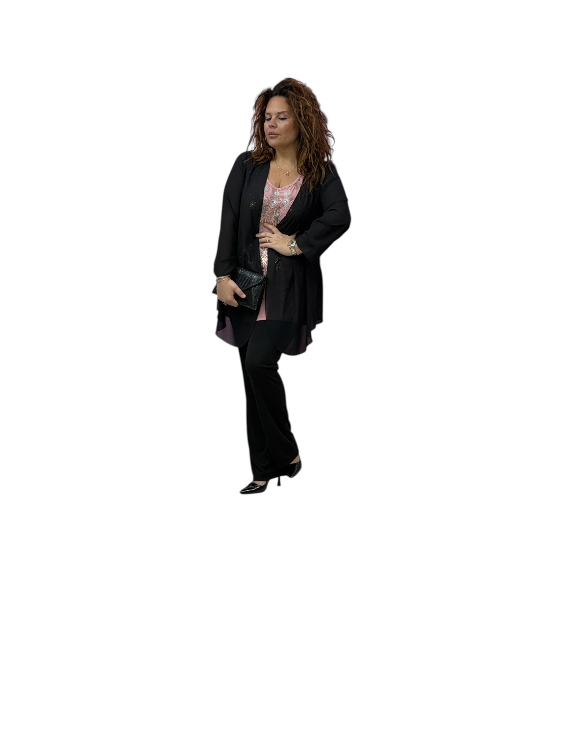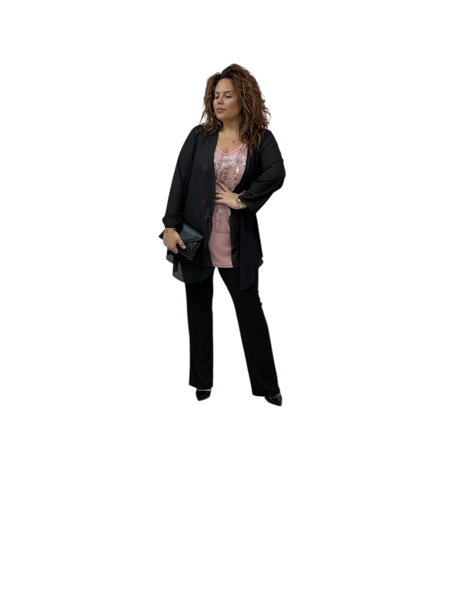 Twin set con top in jersey pannello lavoraro con paiette ed applicazioni e spolverino in georgette