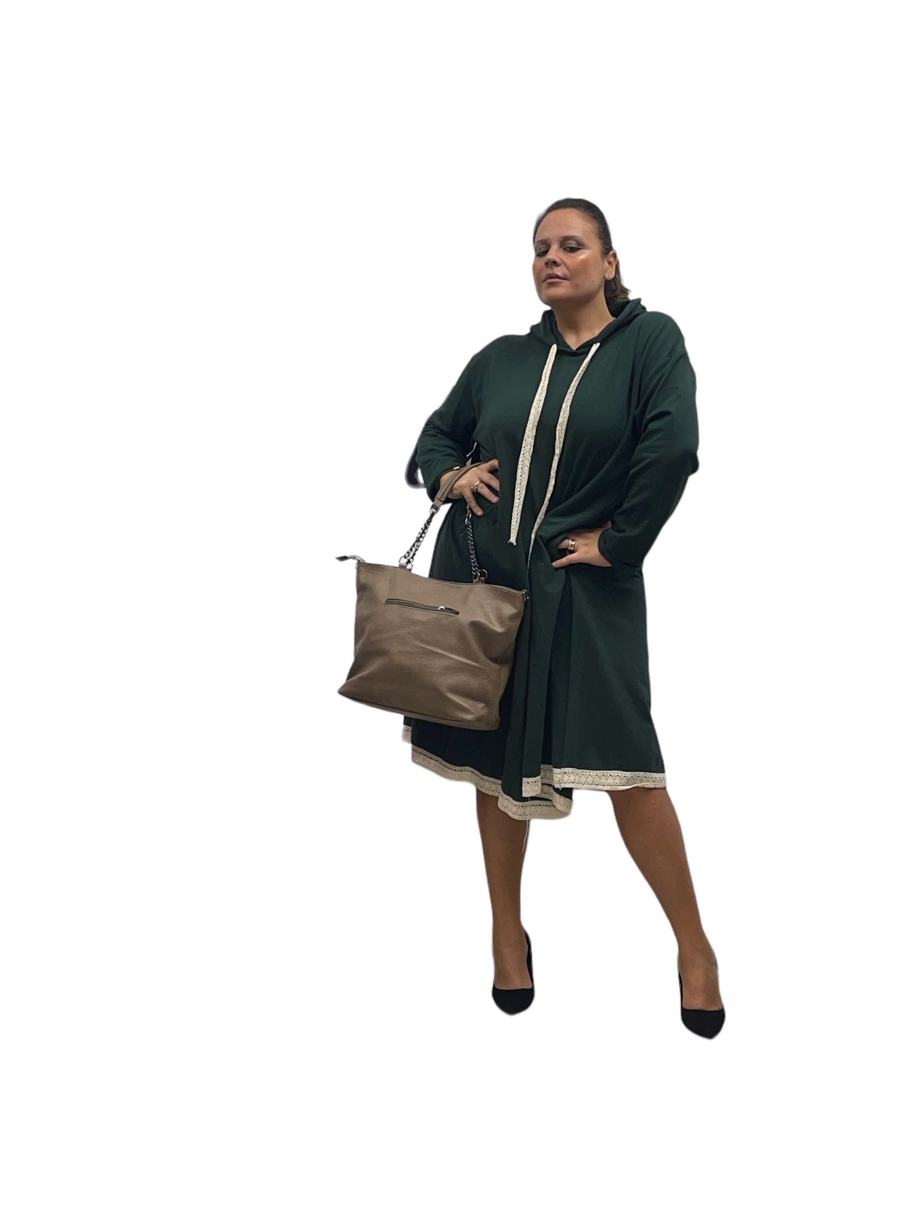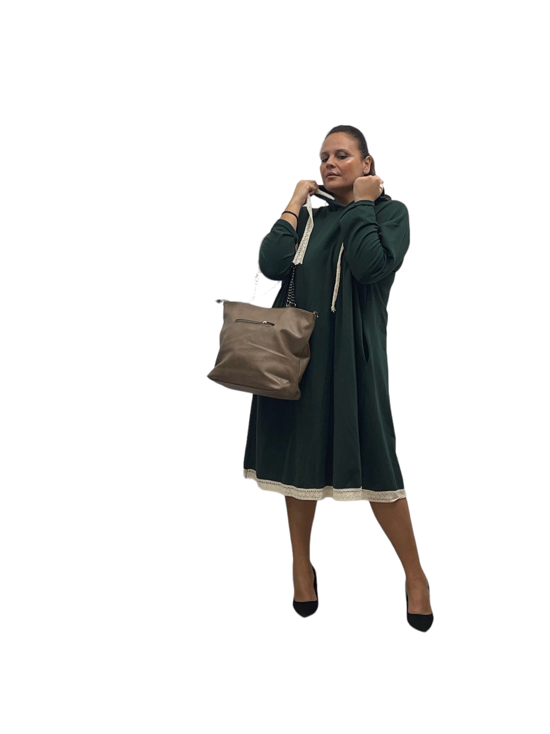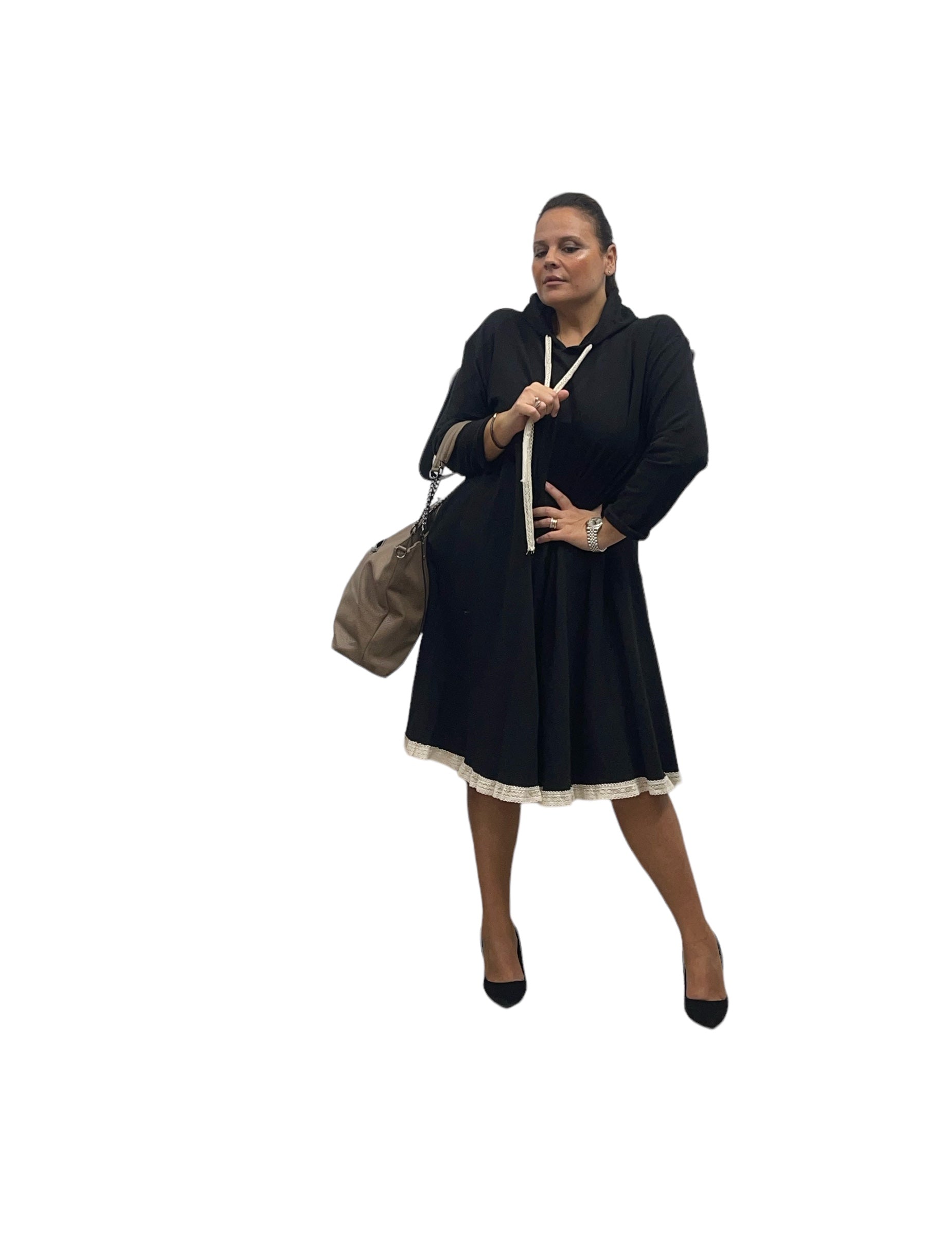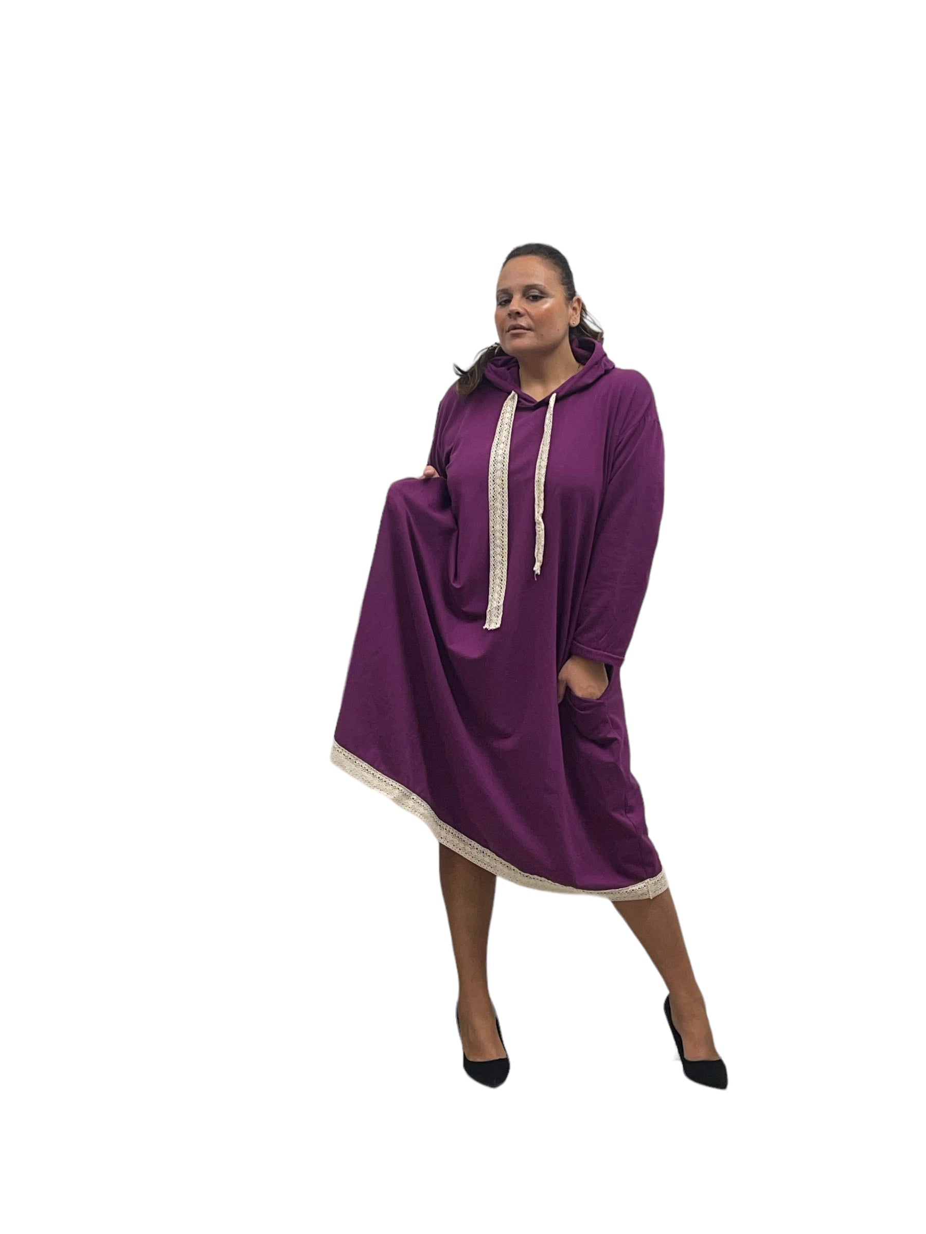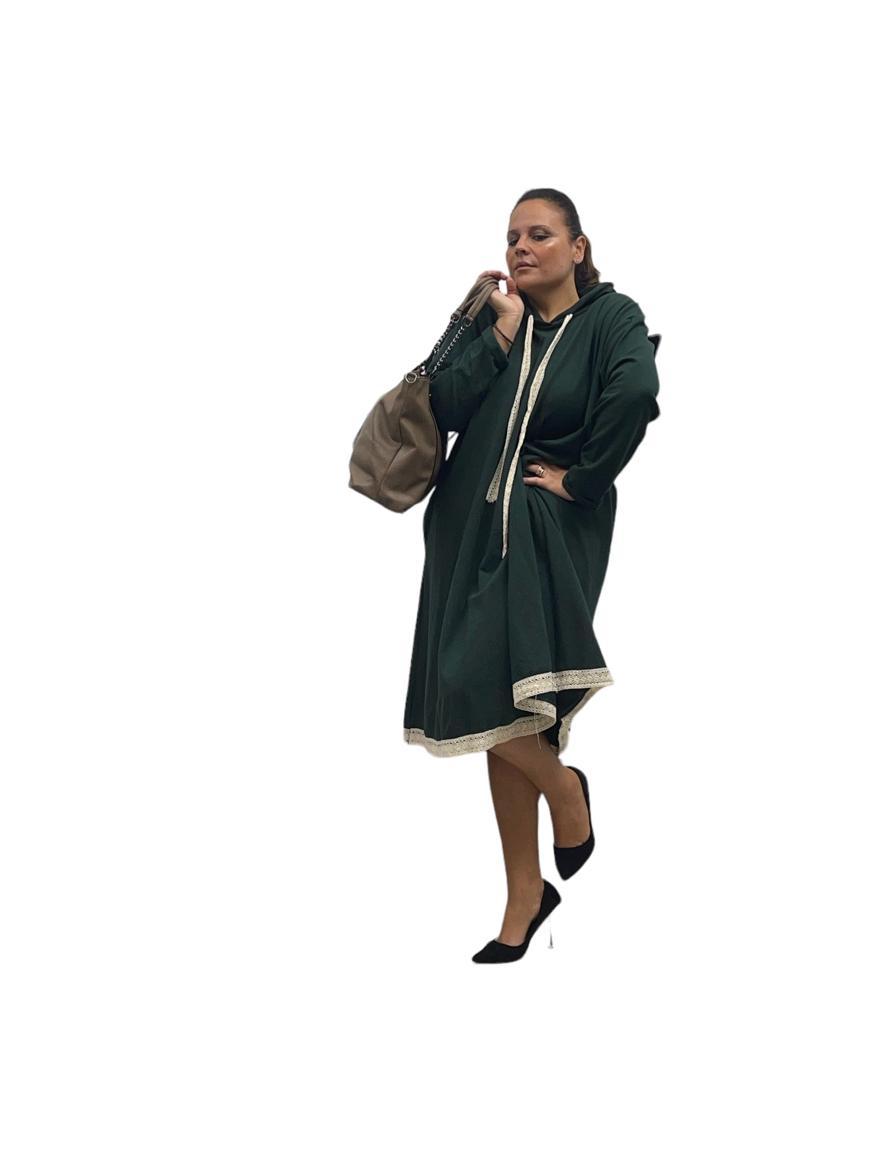 Abito lungo over in felpa internamente felpato con cappuccio,tasche ,laccio e bordino in merletto