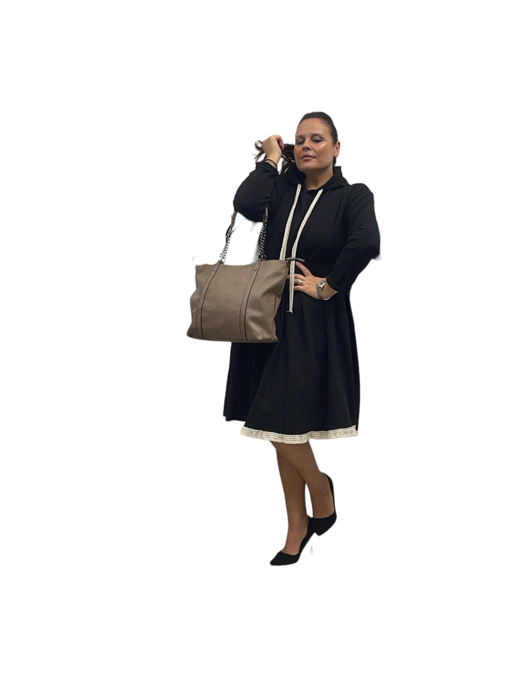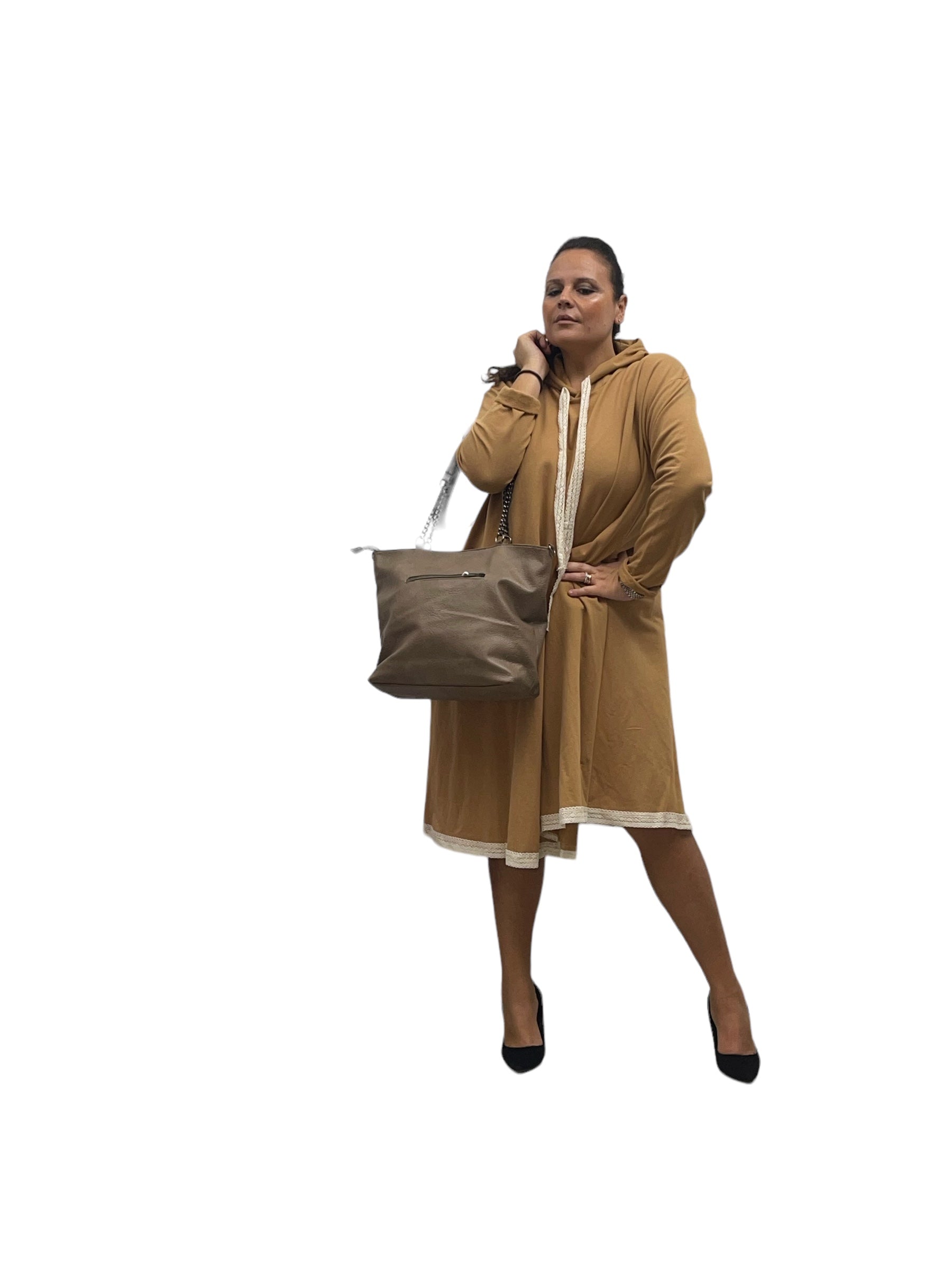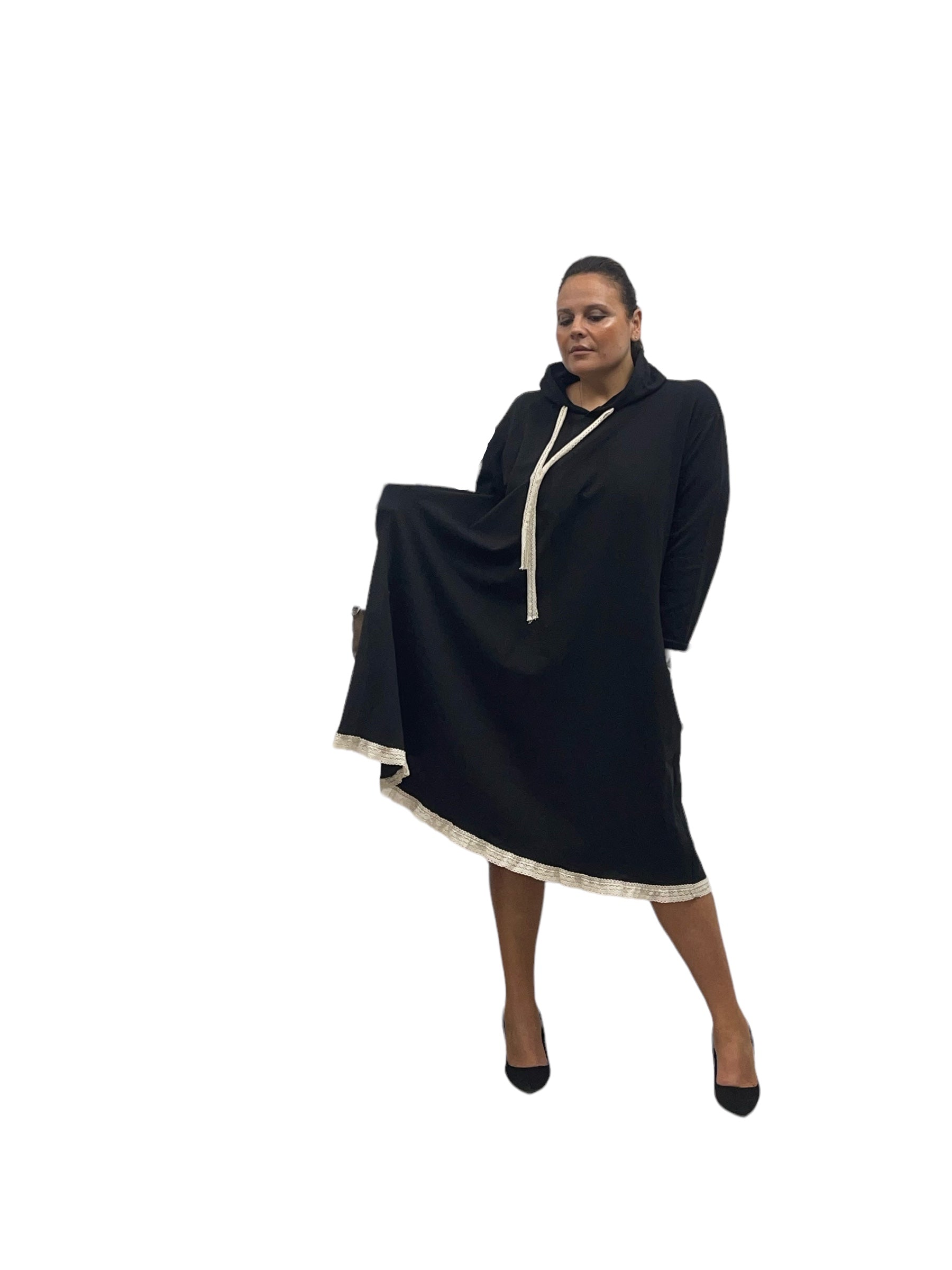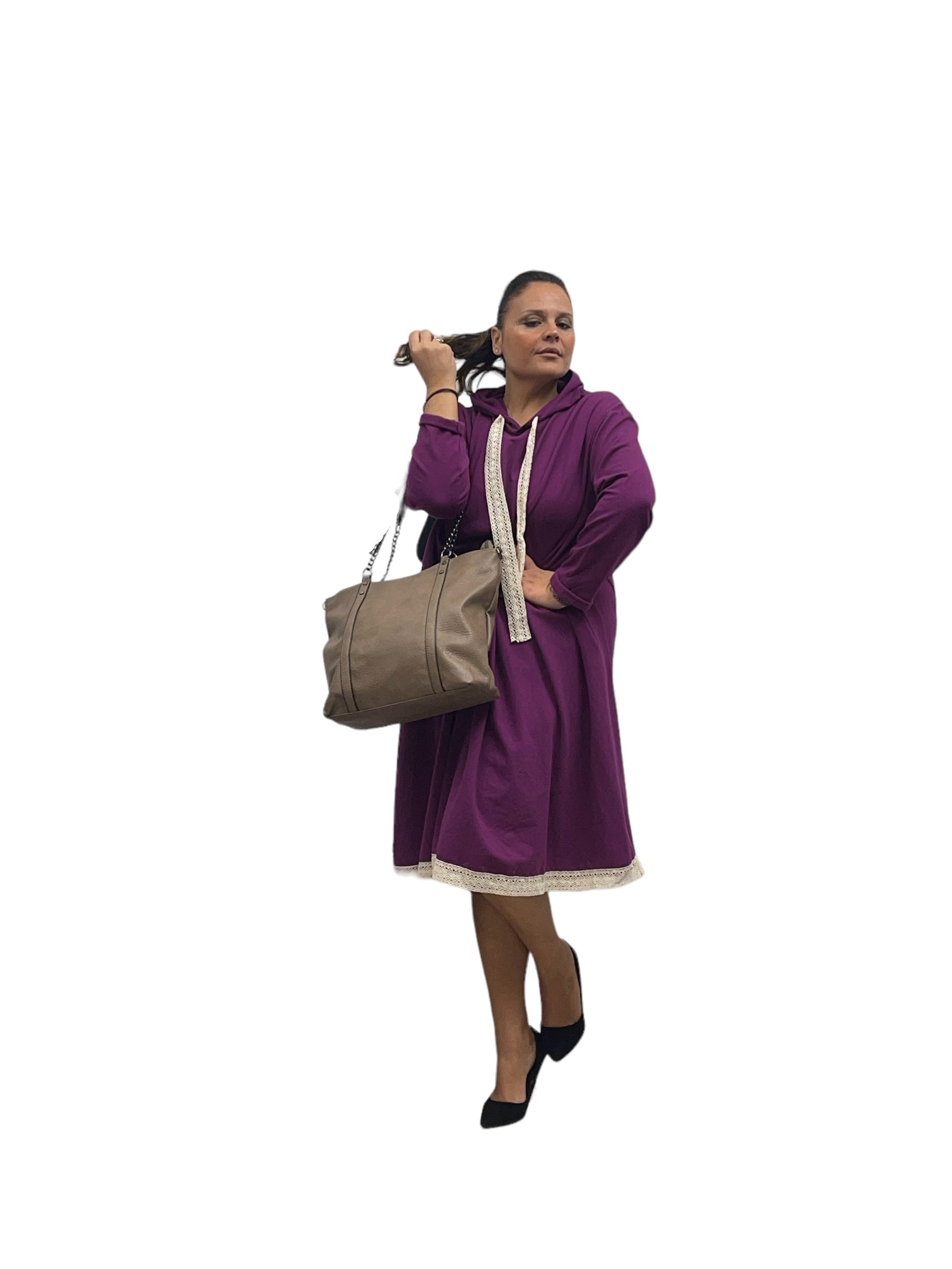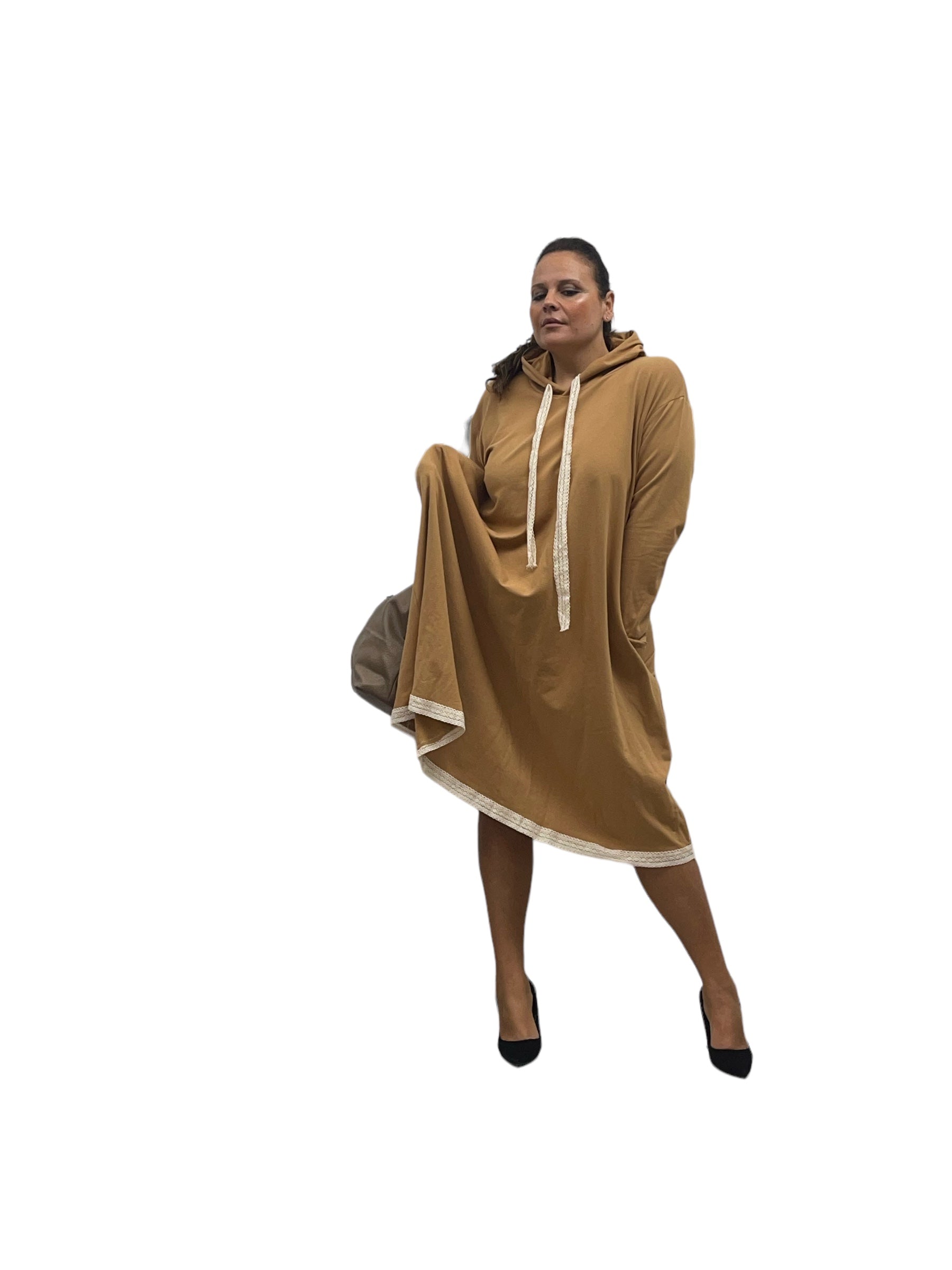 Abito lungo over in felpa internamente felpato con cappuccio,tasche ,laccio e bordino in merletto