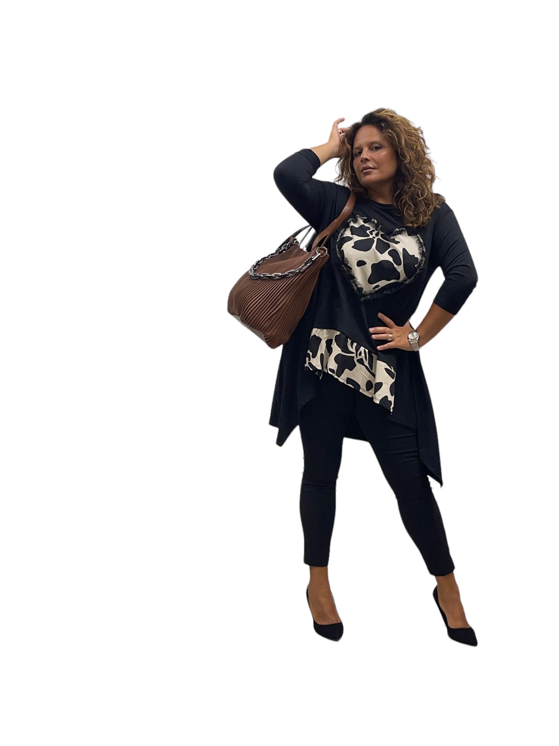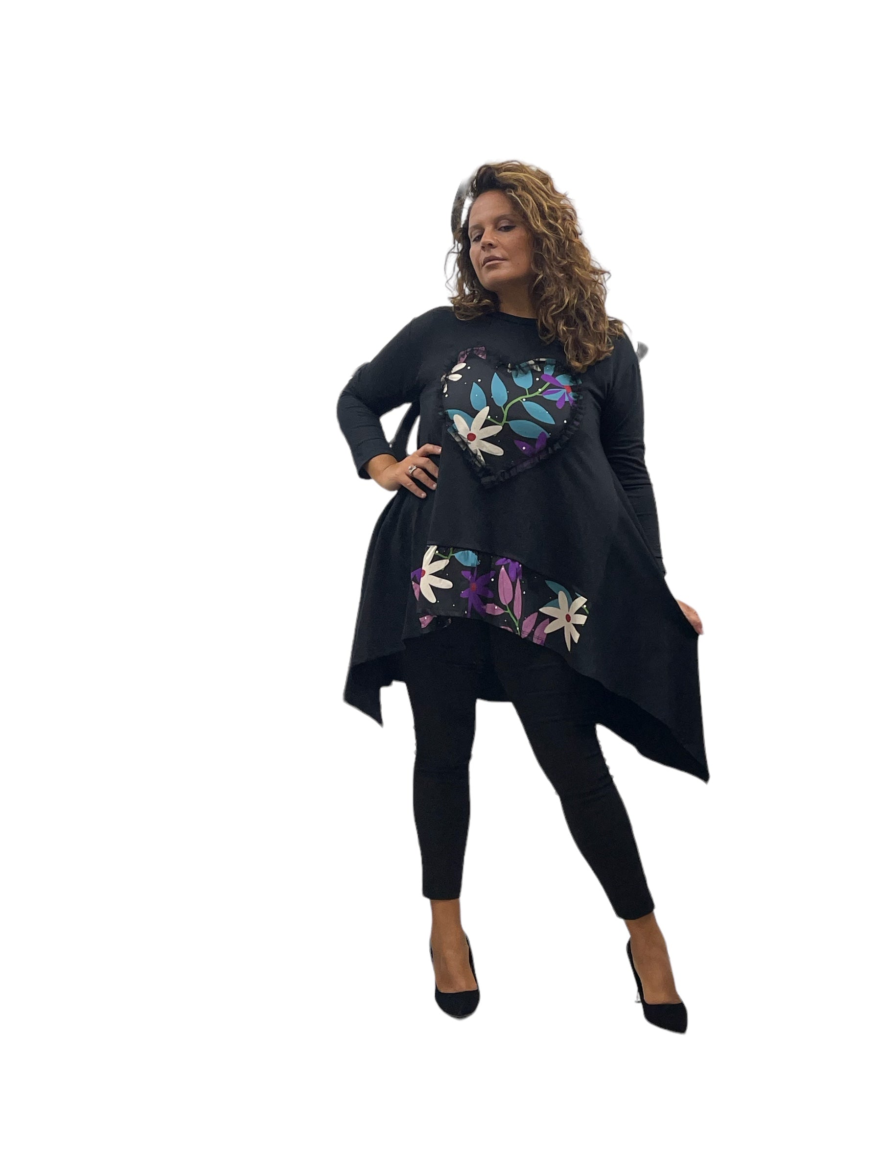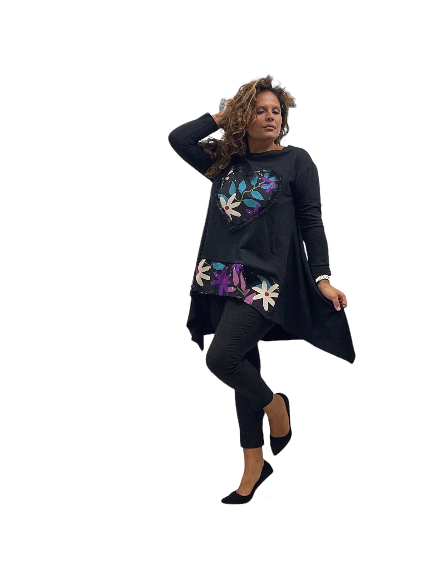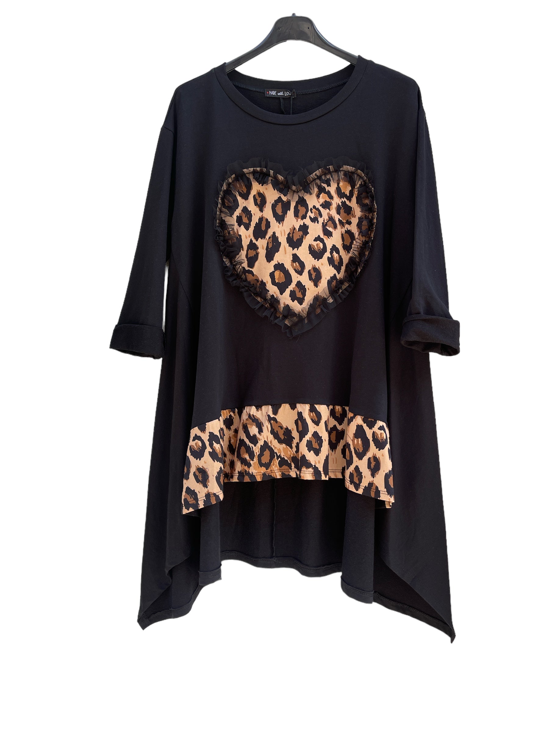 Magliettone over in felpa corto avanti lungo dietro con cuore e fascia fantasia e tulle