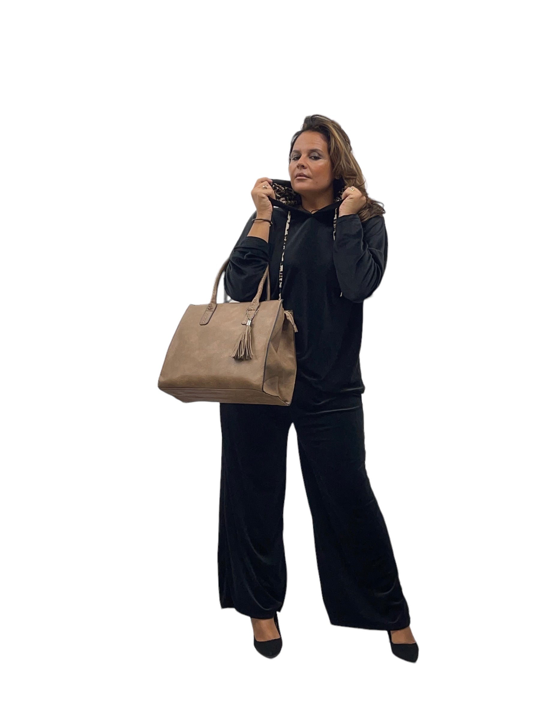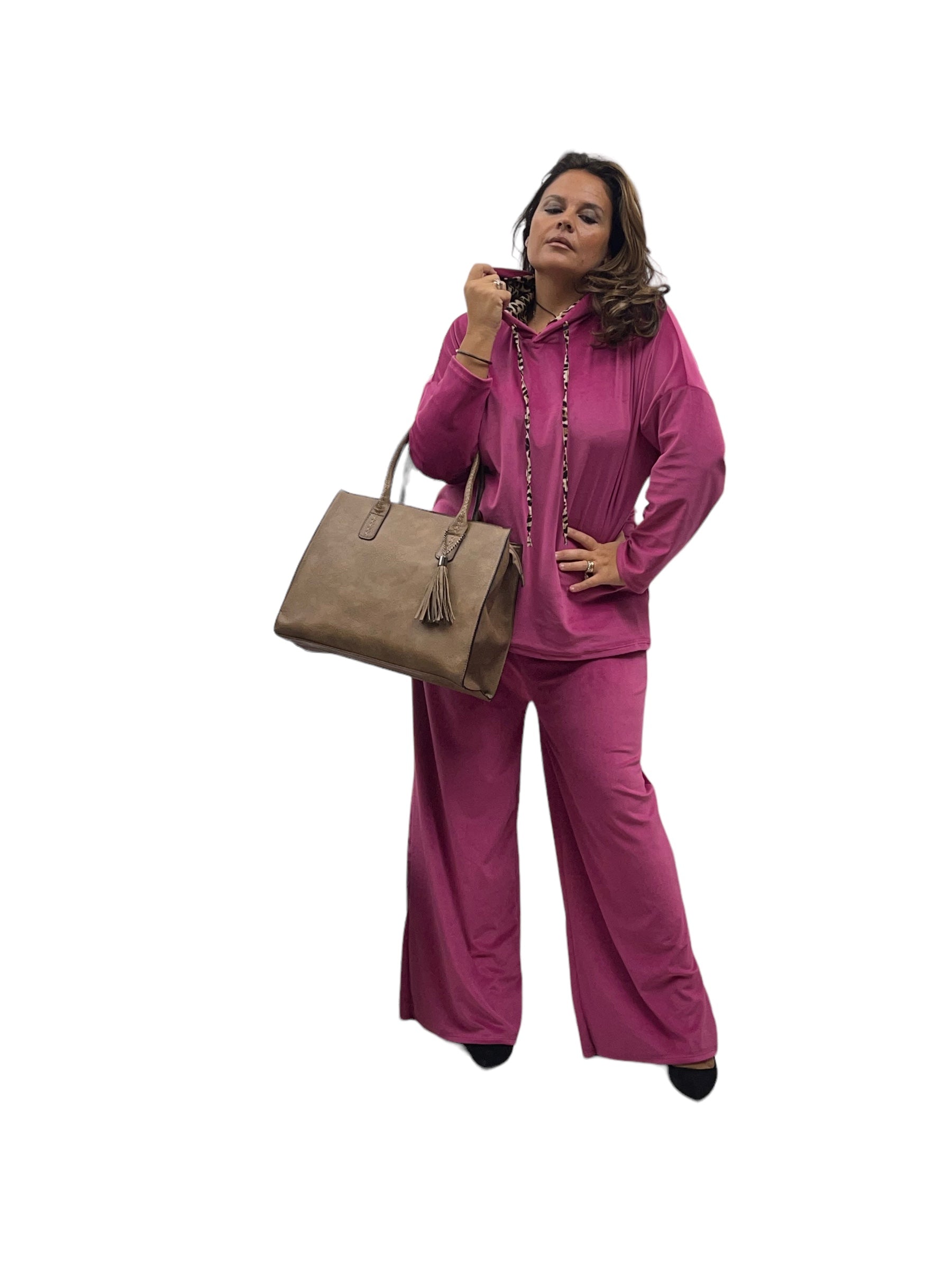 Tuta in ciniglia con laccio, cappuccio internamente leopardato e pantaloni con elastico in vita
