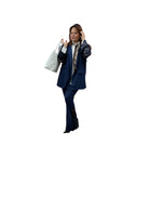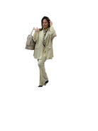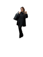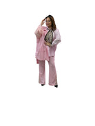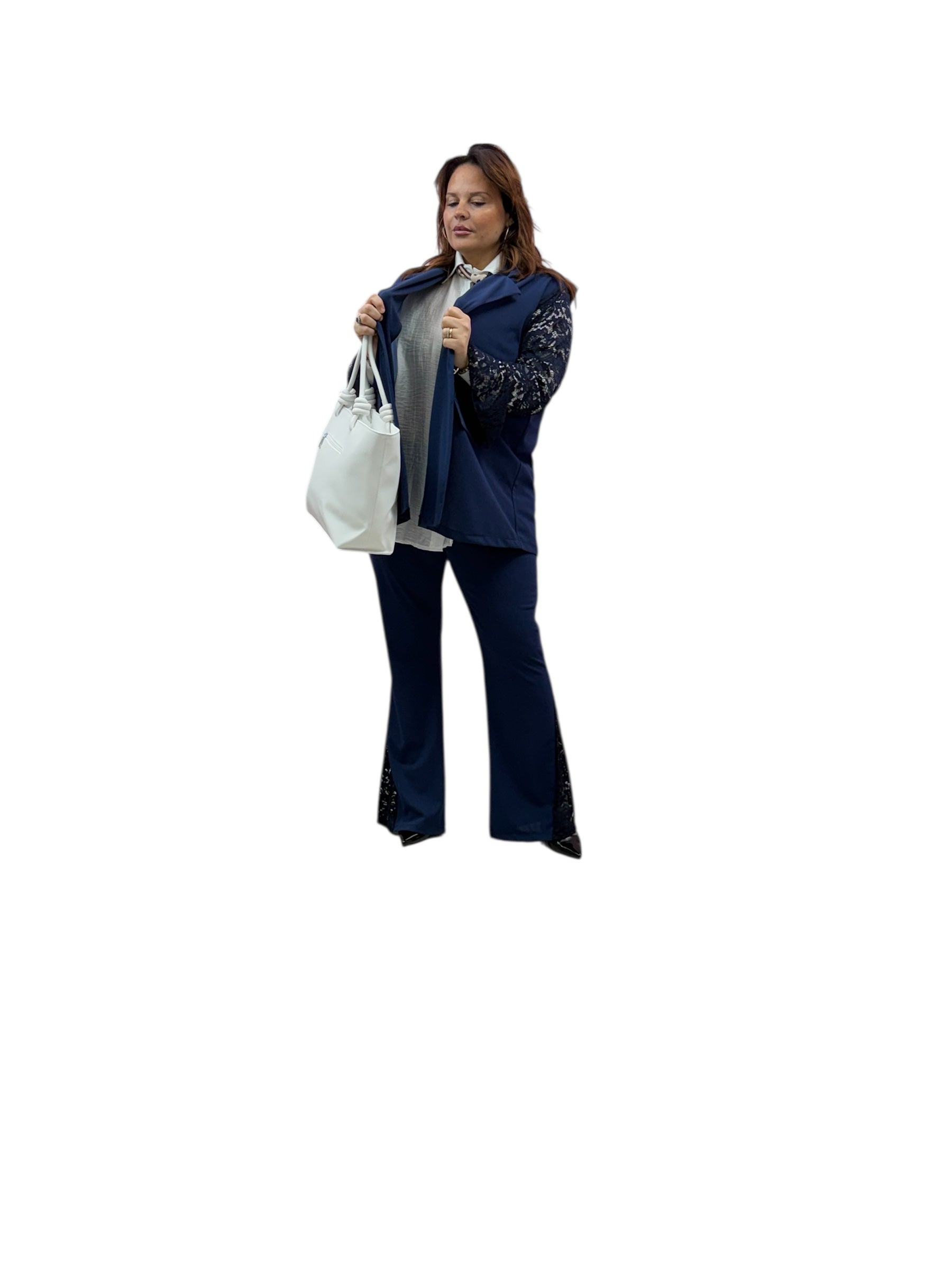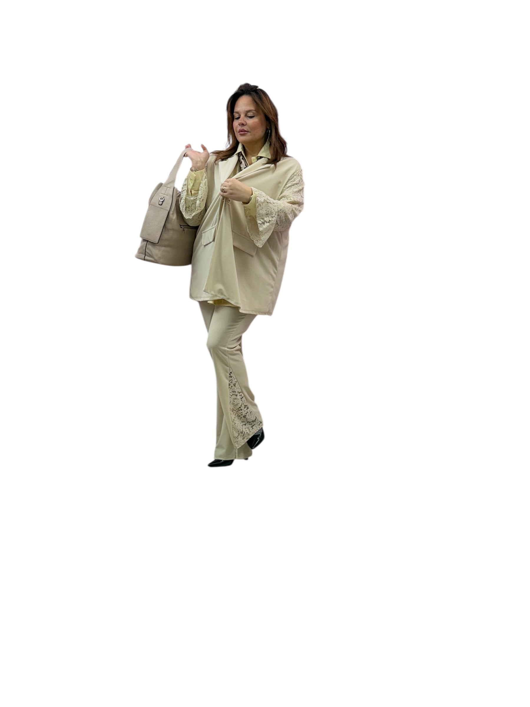Completo over con bottone oro giacca maniche in pizzo e pantaloni a zampa con elastico in vita e spacco in pizzo