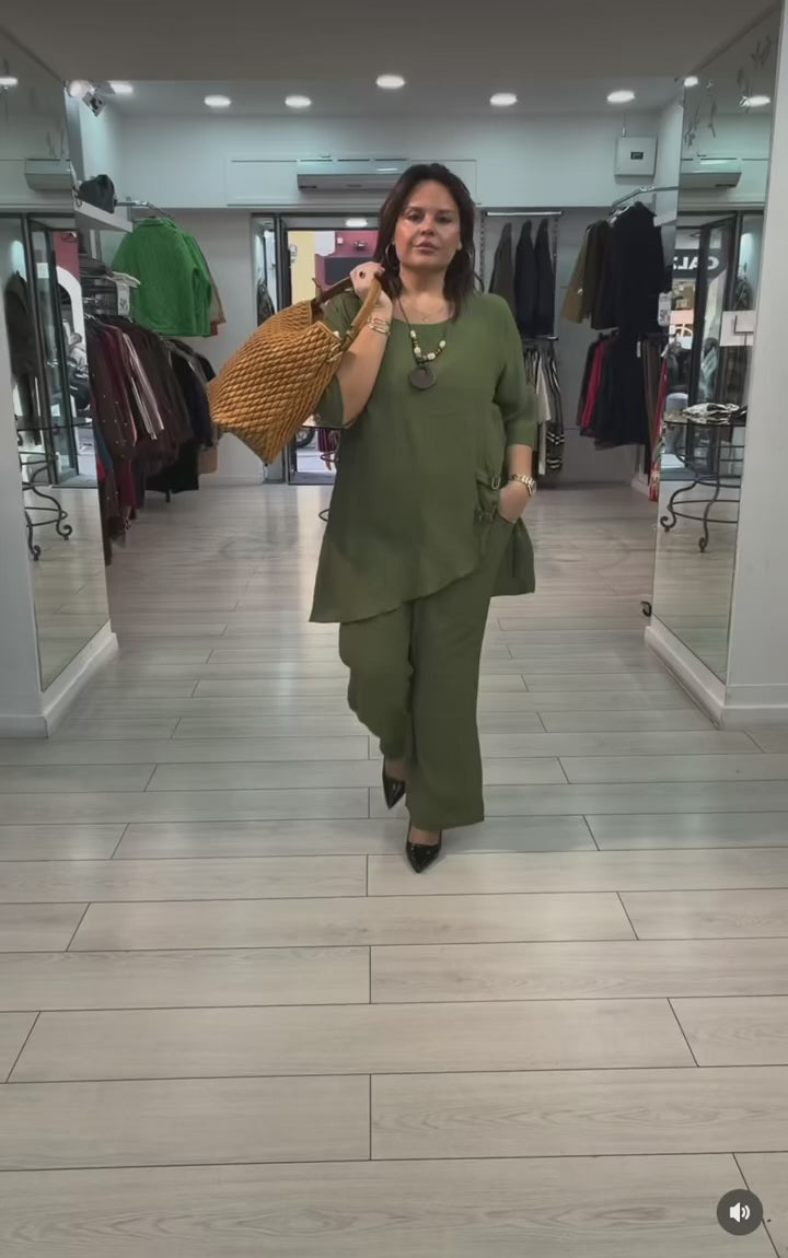 Completo over 2 pezzi casacca morbida con bottoni in legno e pantaloni over palazzo con elastico in vita