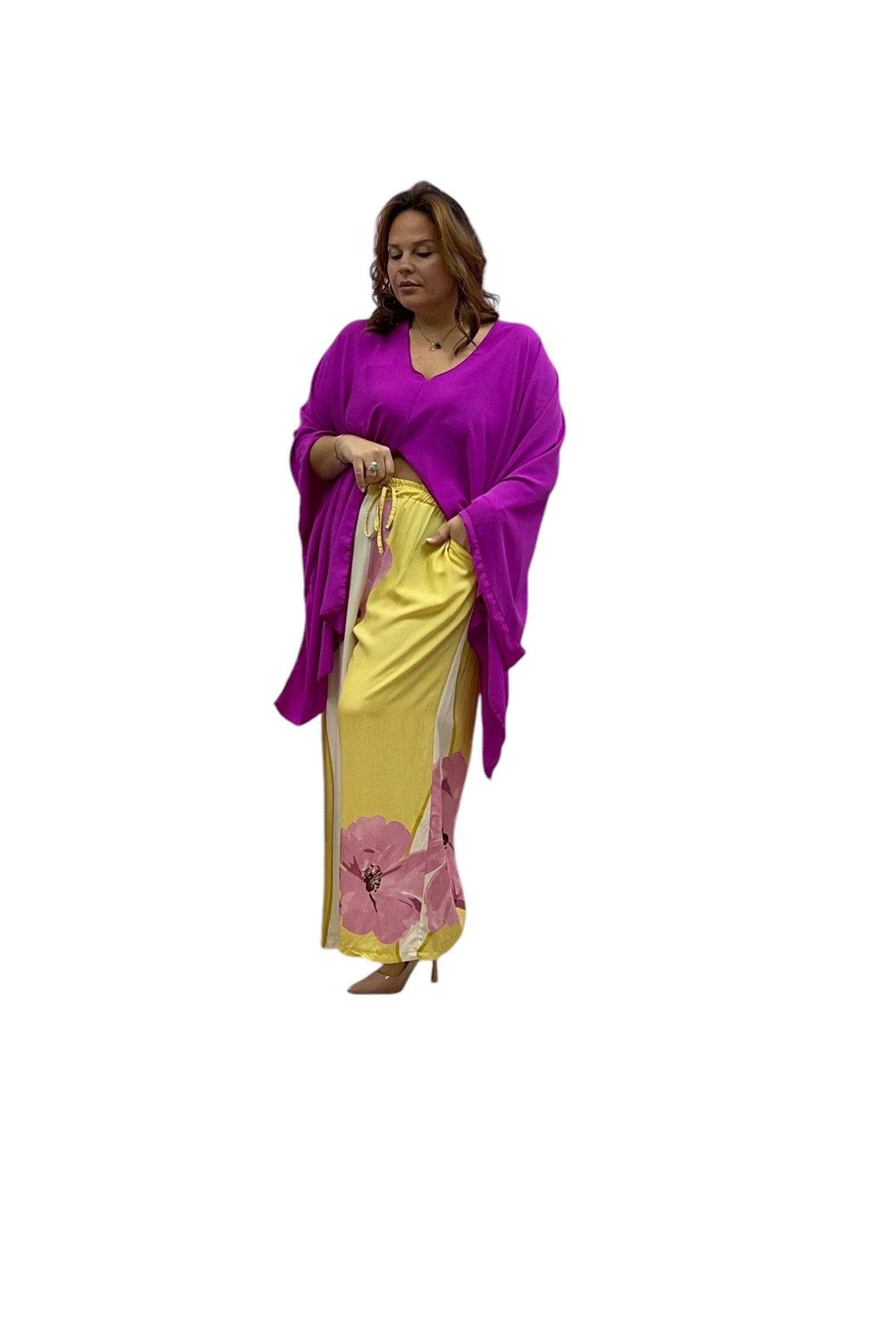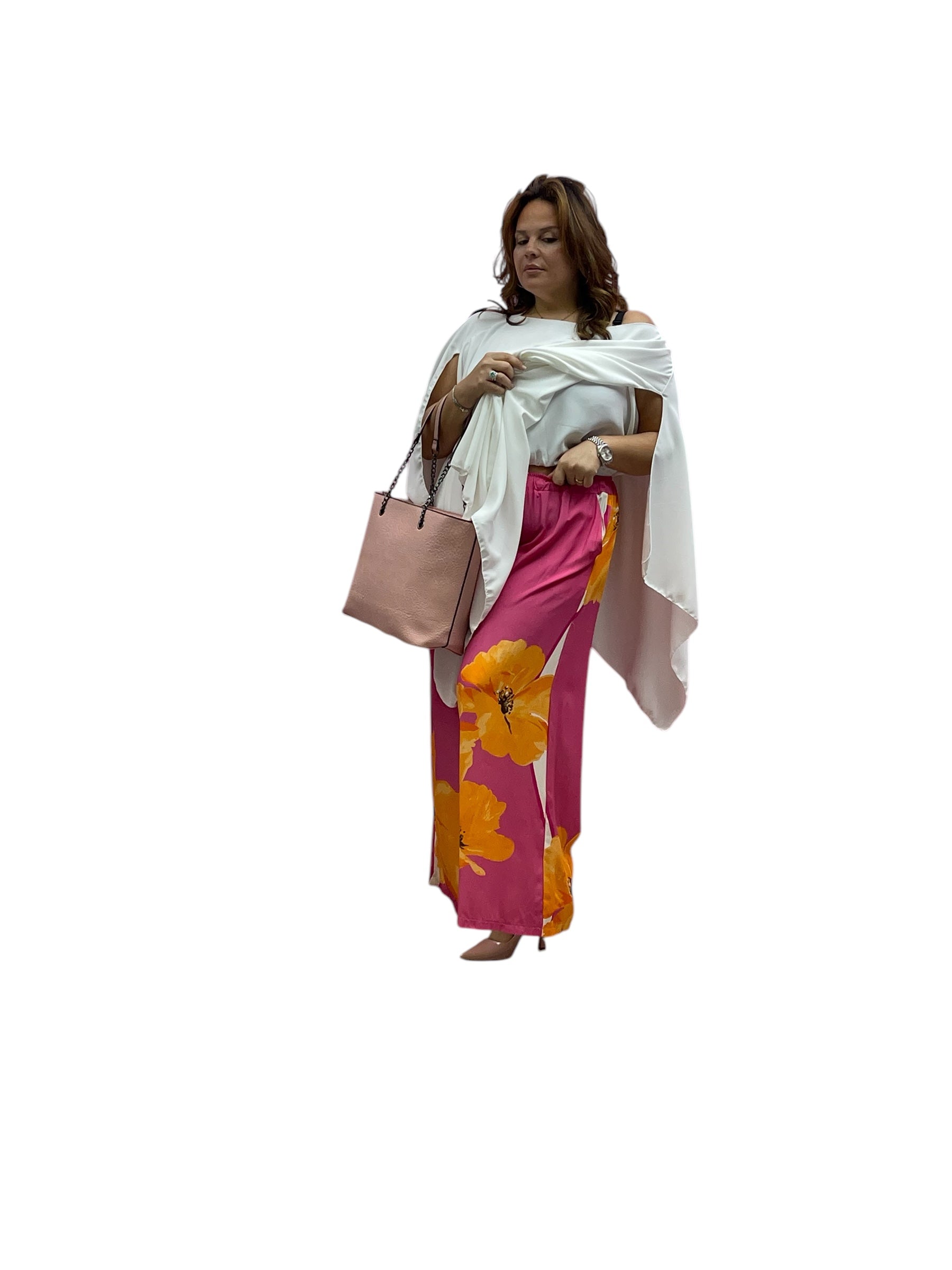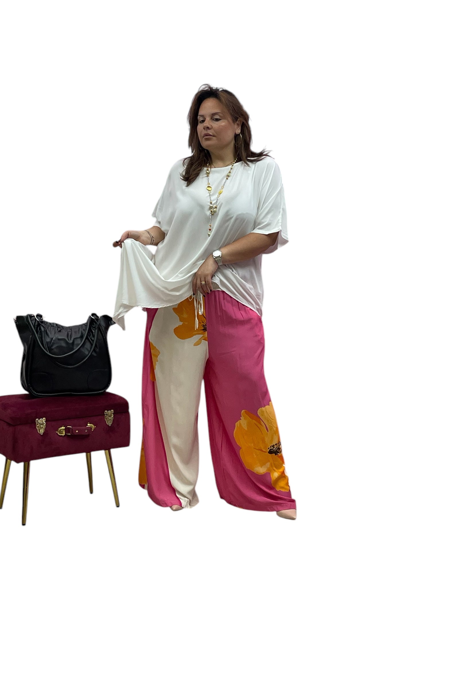 Pantaloni over in viscosa fantasia fiore con elastico e laccio