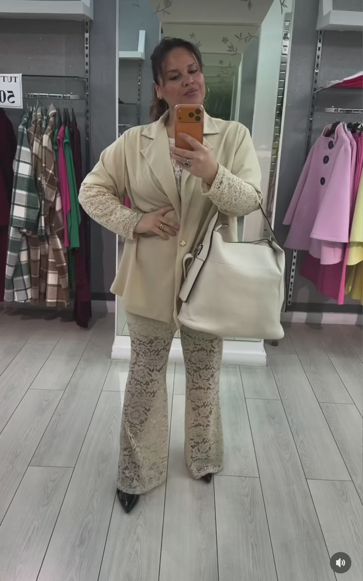 Pantaloni over a zampa in merletto con pantaloncino in viscosa
