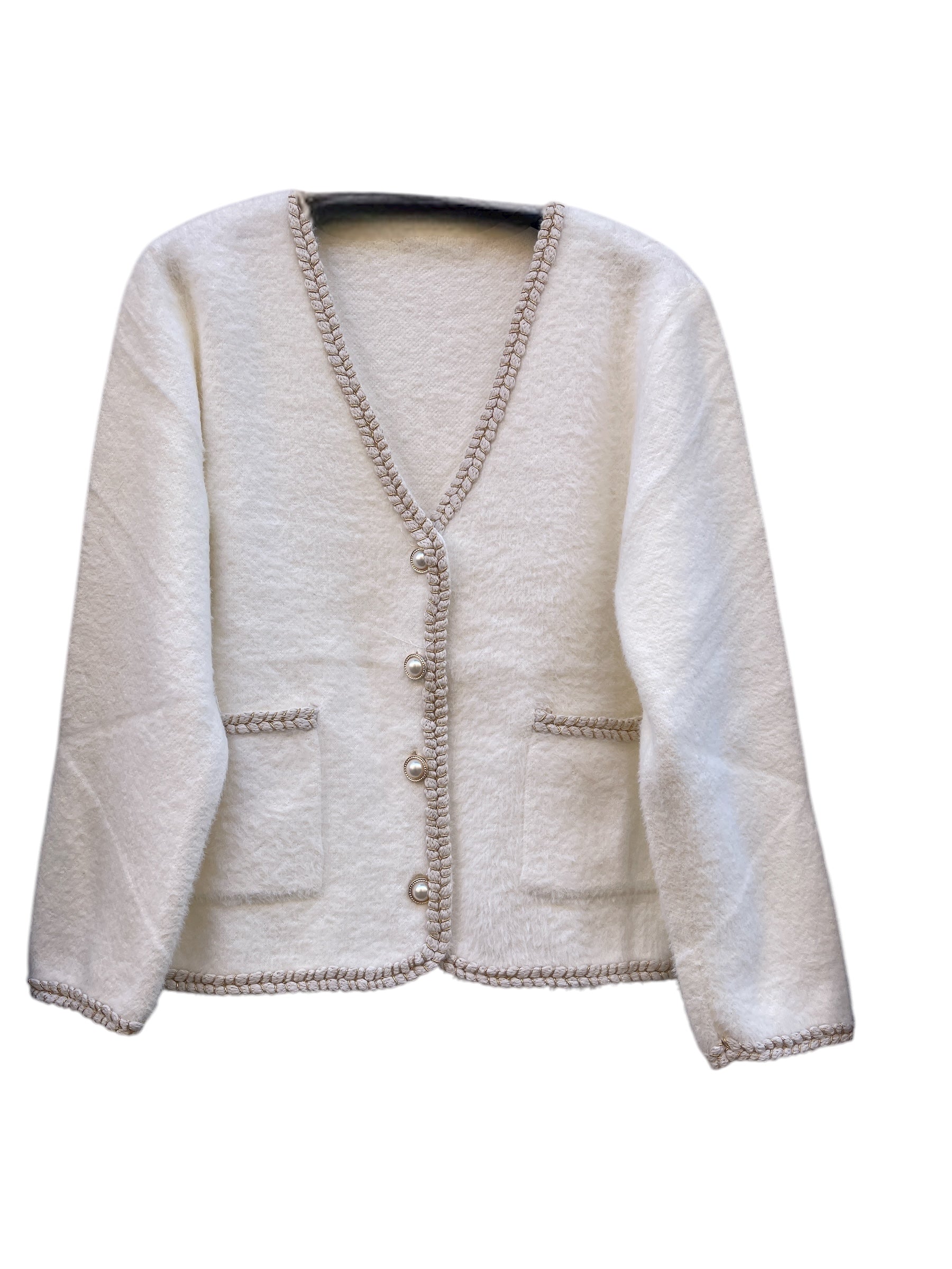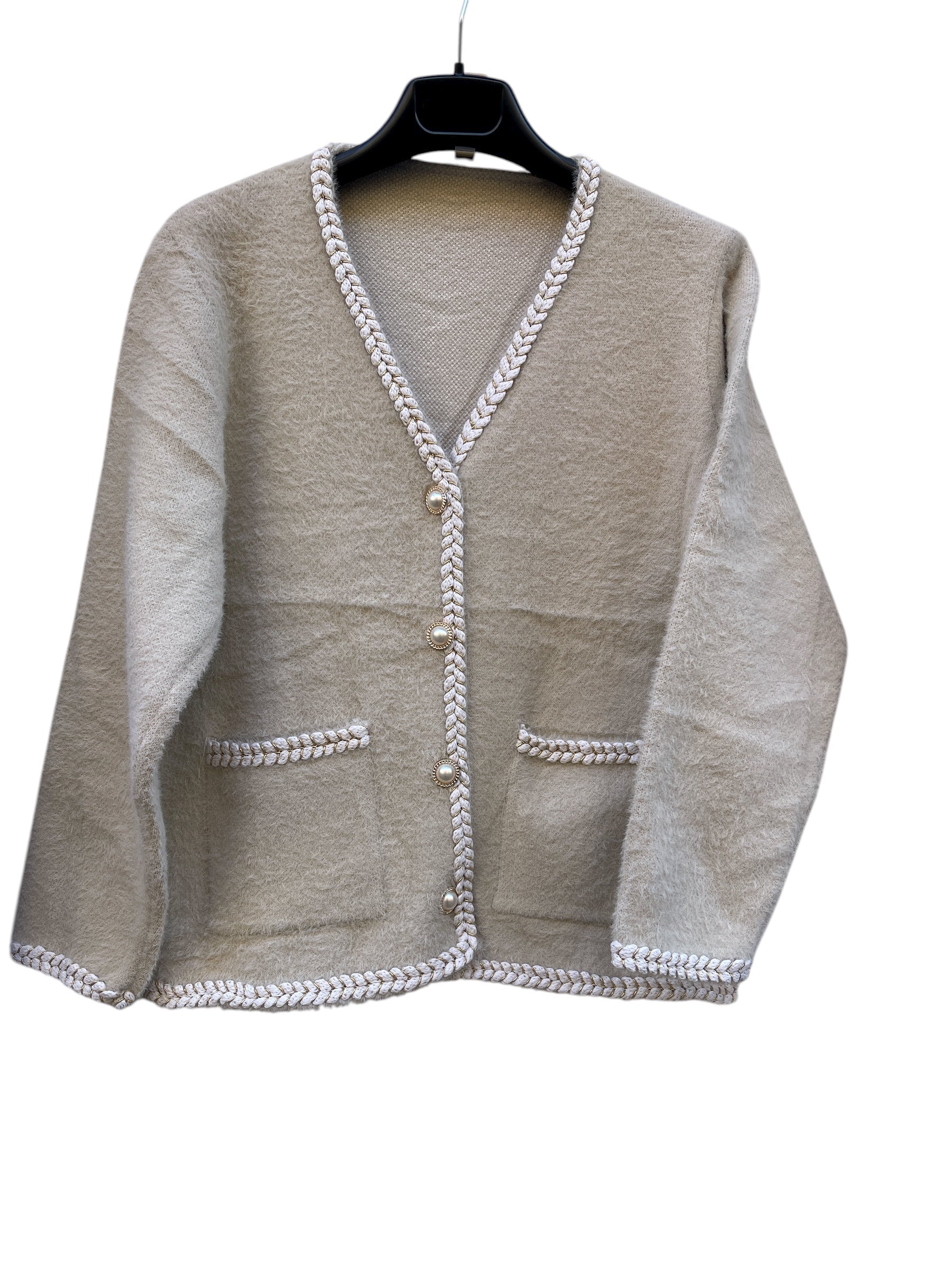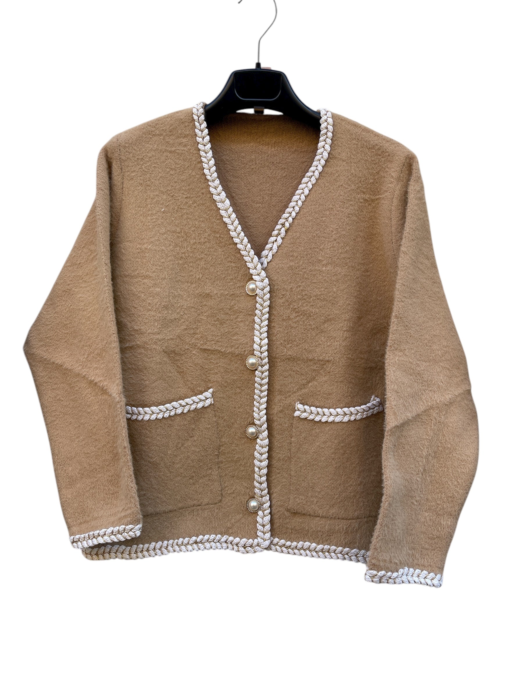 Cardigan con taschini e bordino in treccia con bottoni gioiello