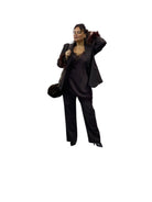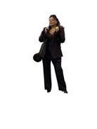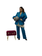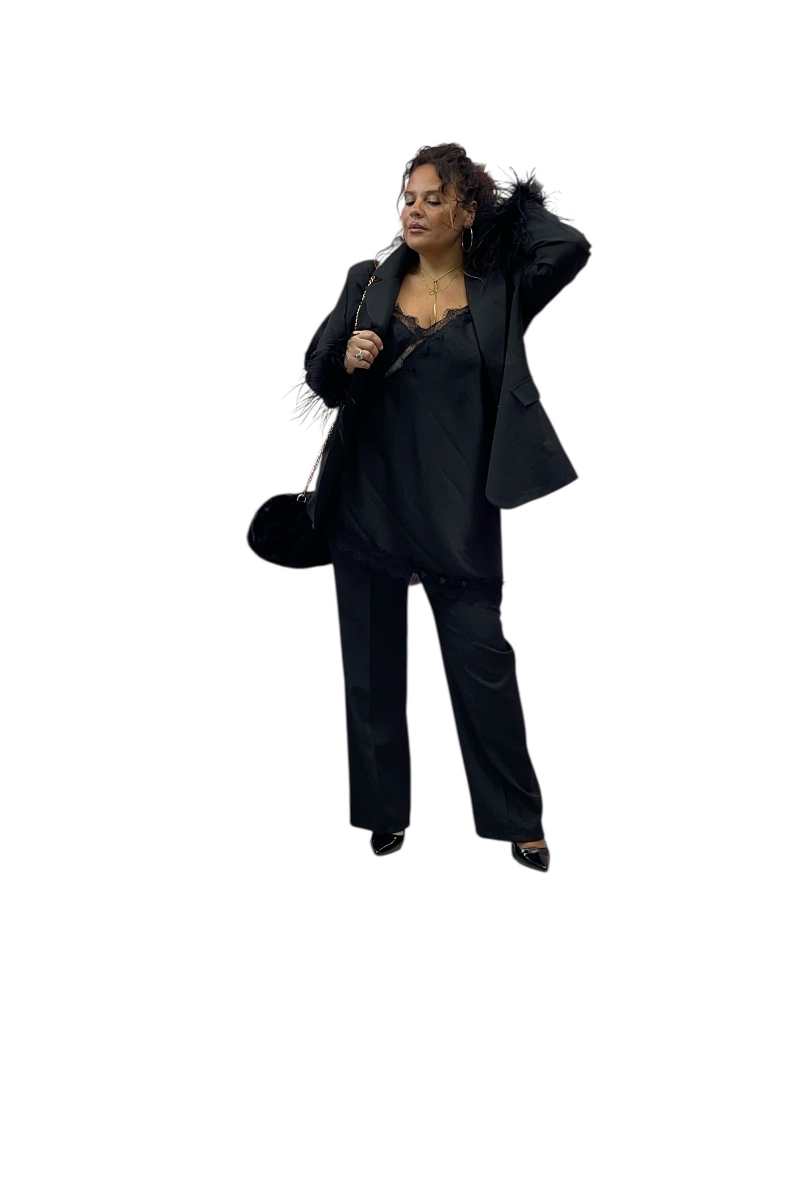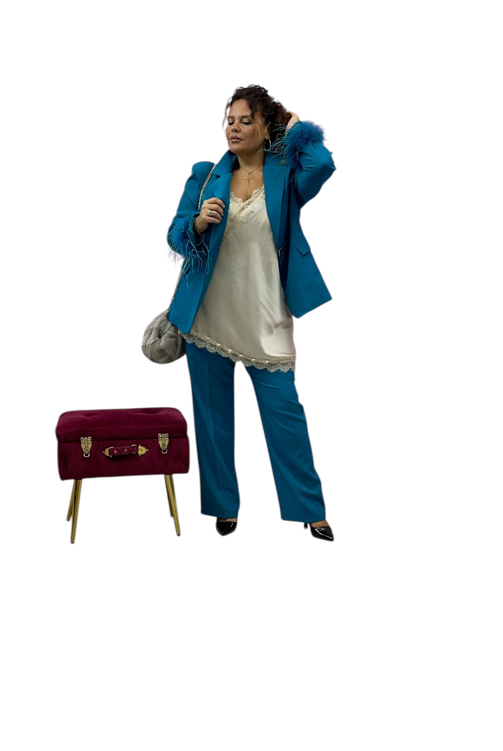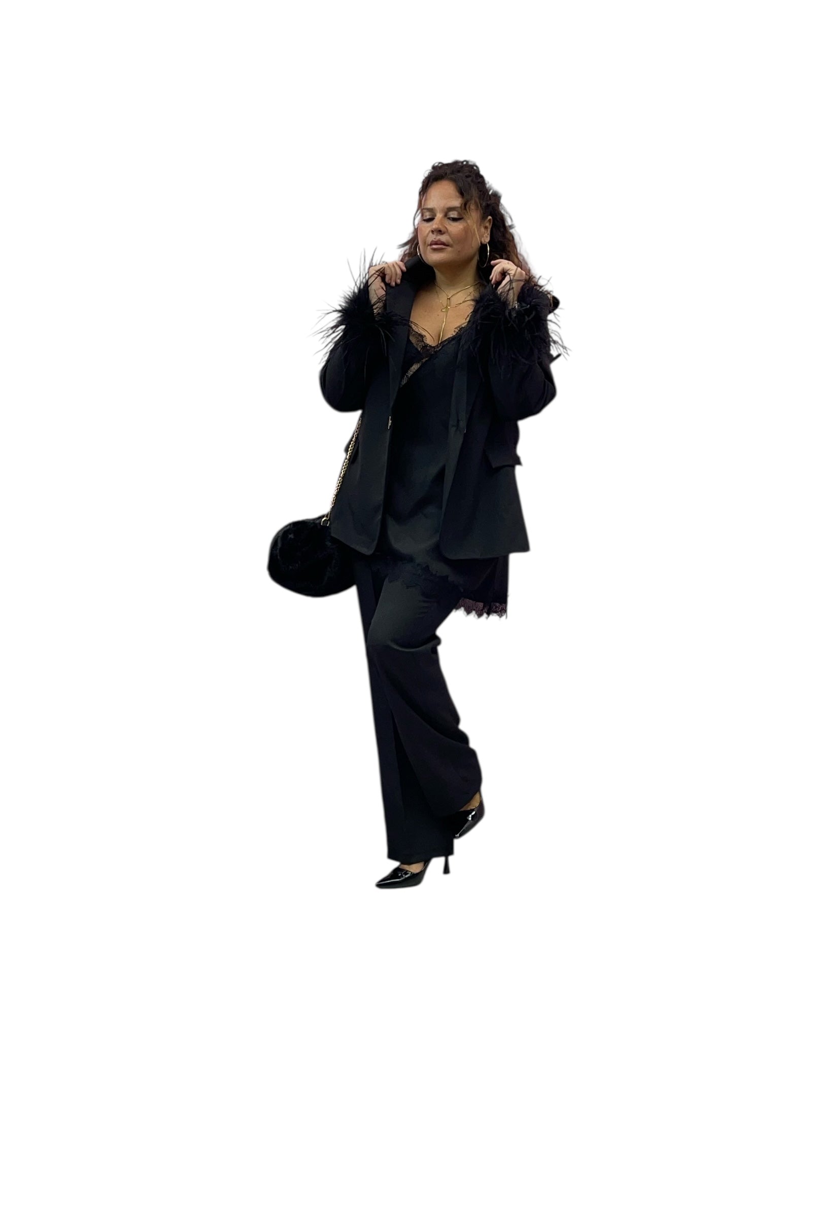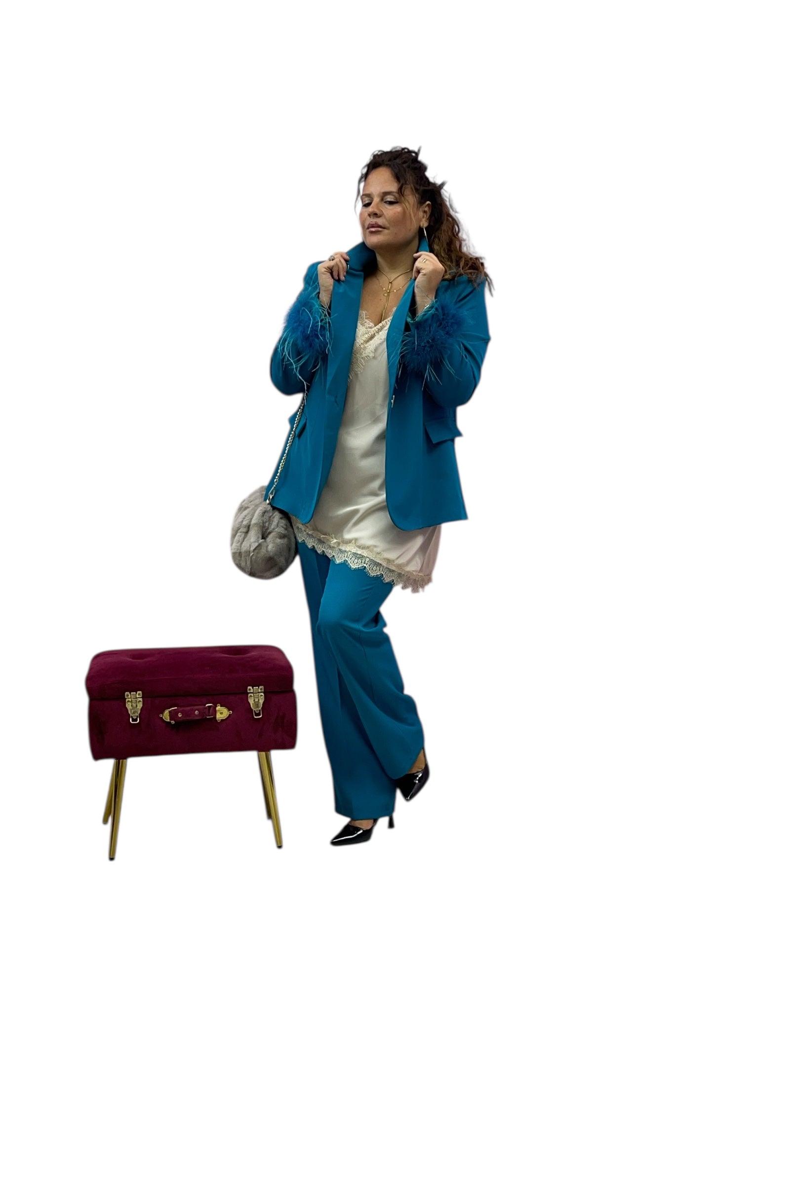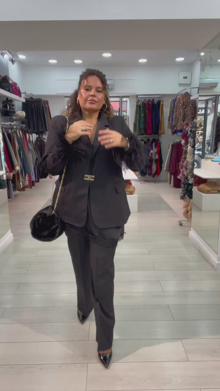 Completo: giacca foderata con chiusura in metallo e piume ai polsi; pantaloni con zip laterale.