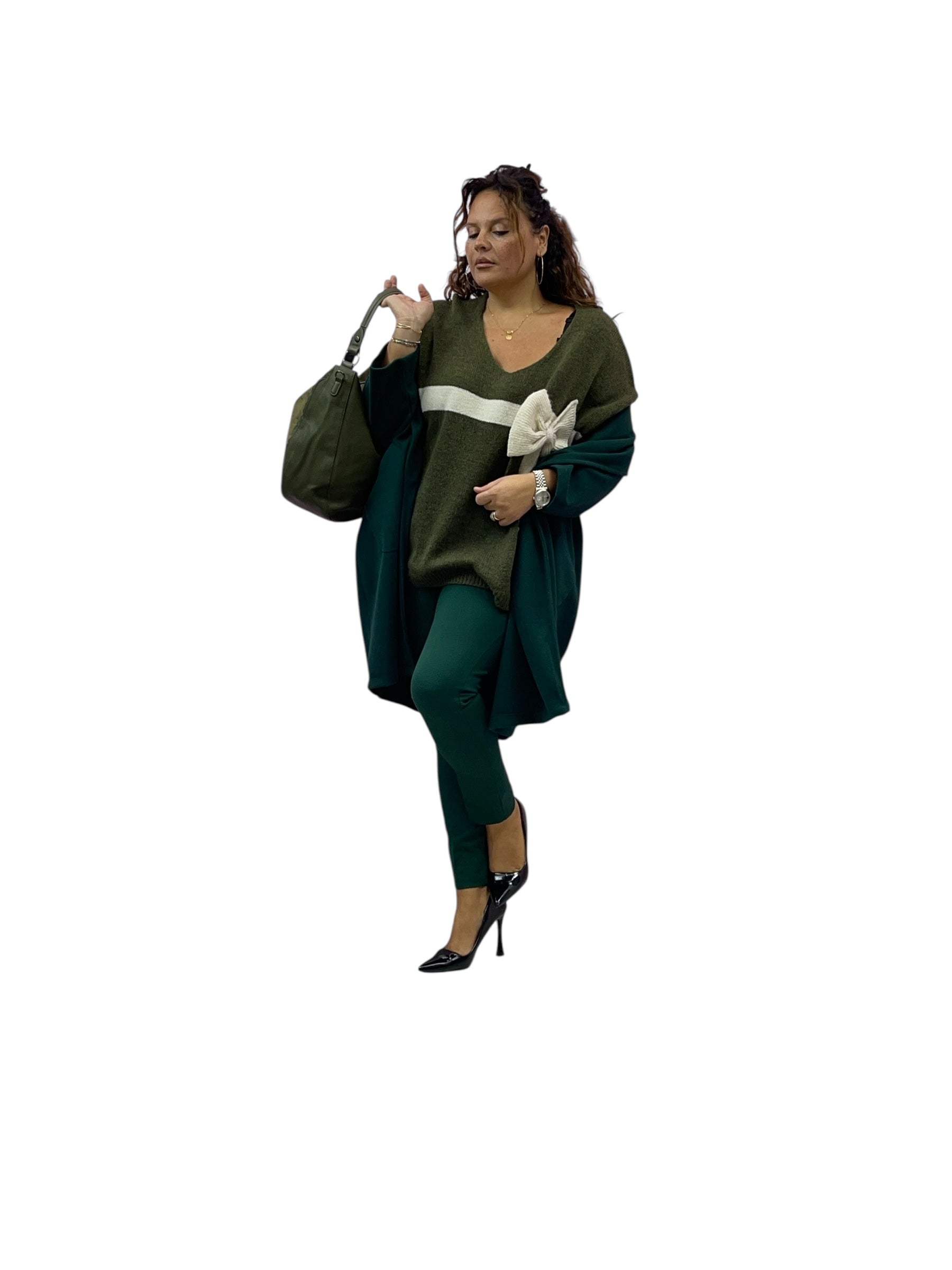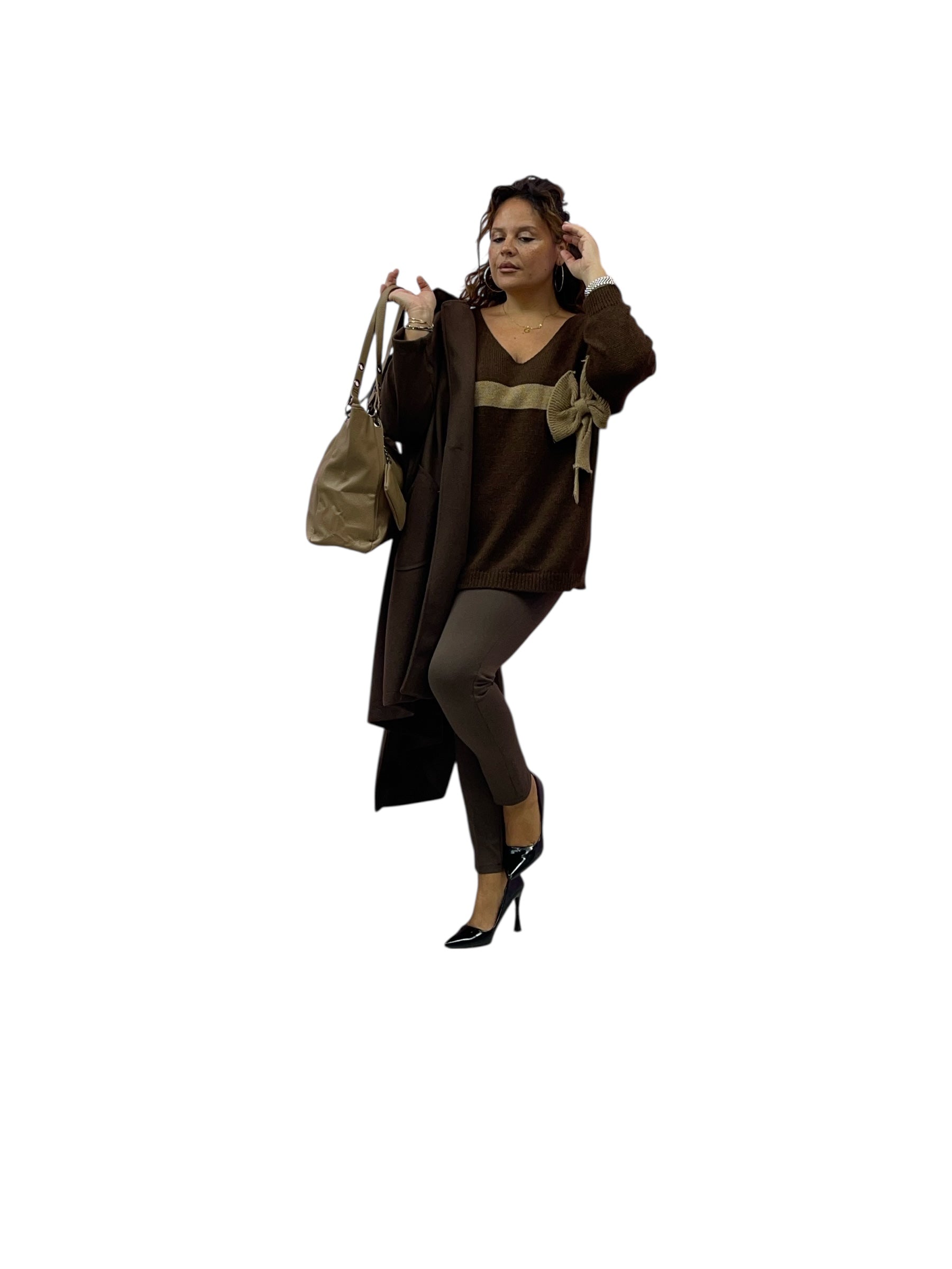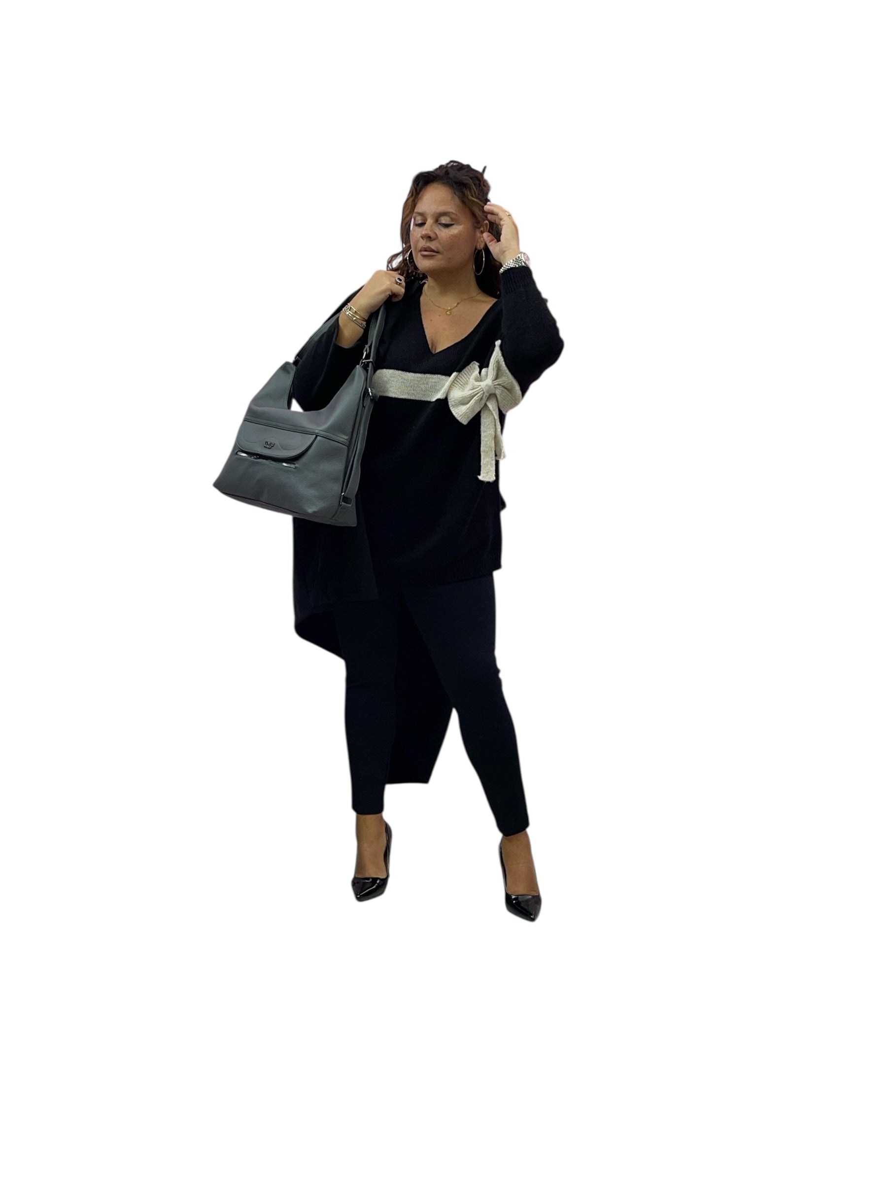 Magliettone over in lana grossa scollo a v e fiocco grande