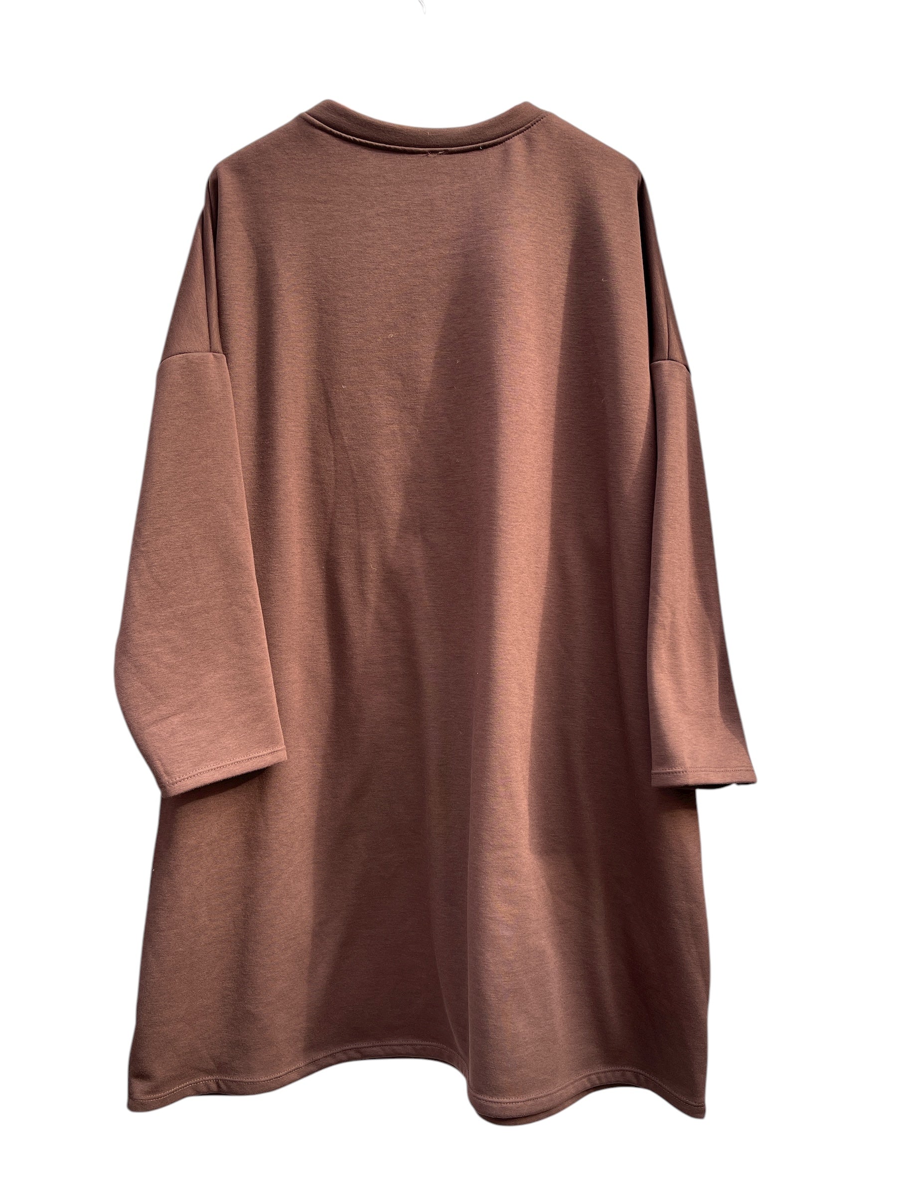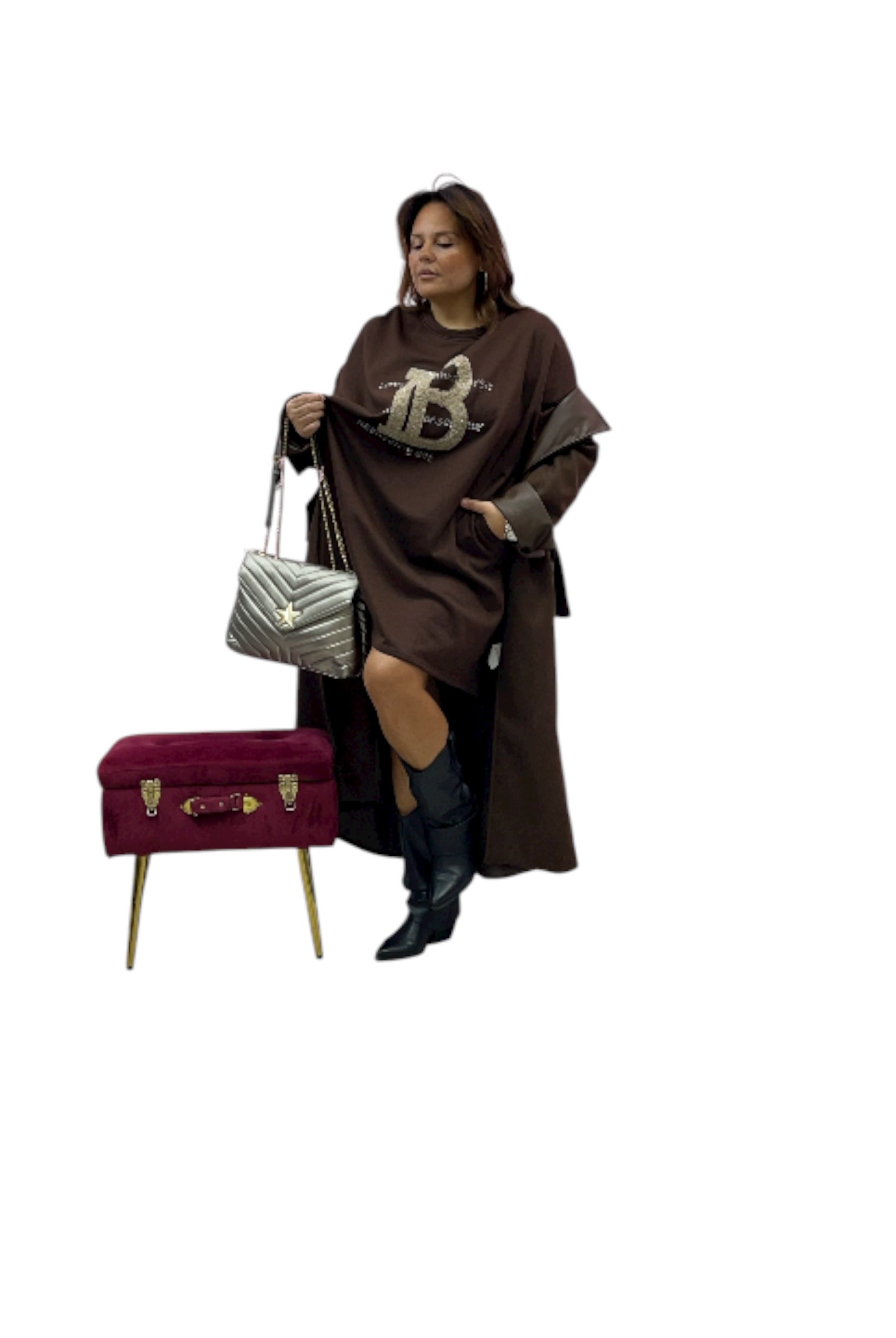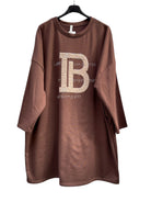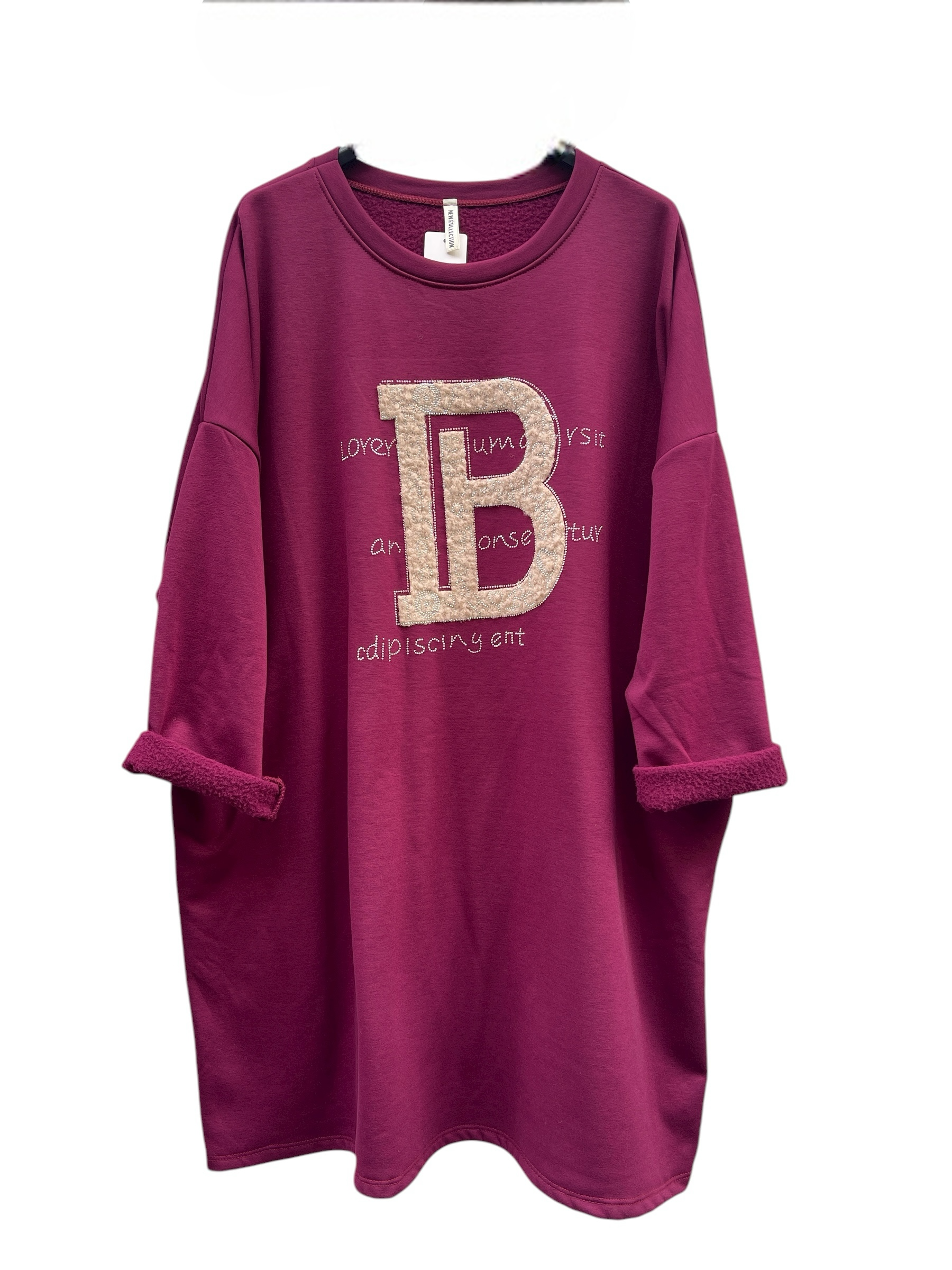 Magliettone/abito over in felpa con lettera in boucle, brillantini ed interno in pile