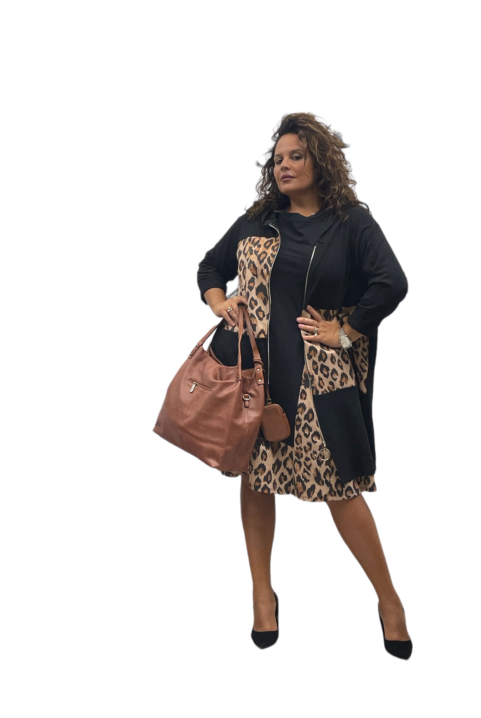 Abito over in felpa con fascia in ecodaino fantasia e fascia in ecopelle