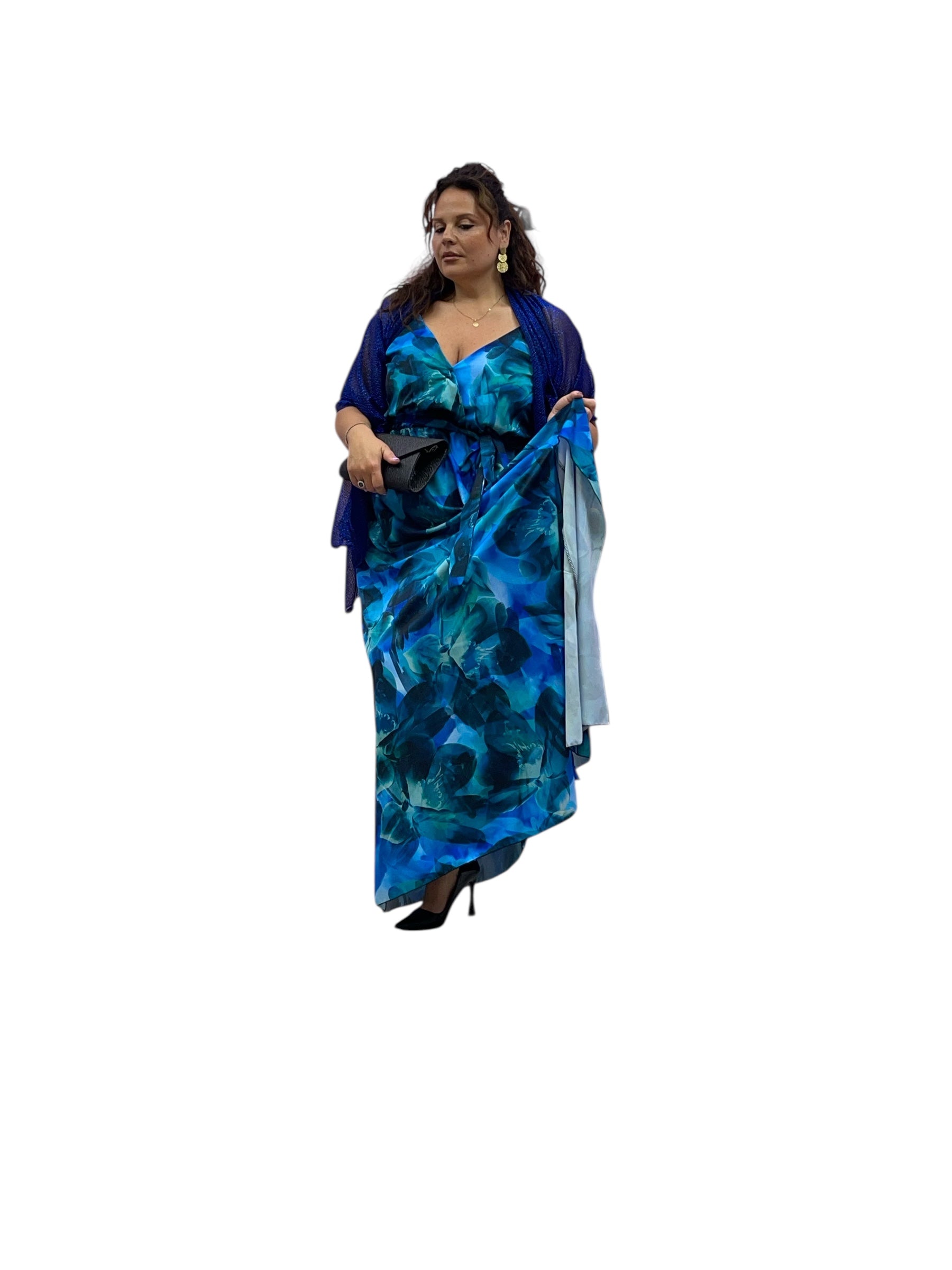 Abito over lungo fantasia scollo a V con bretellina e spacco laterale