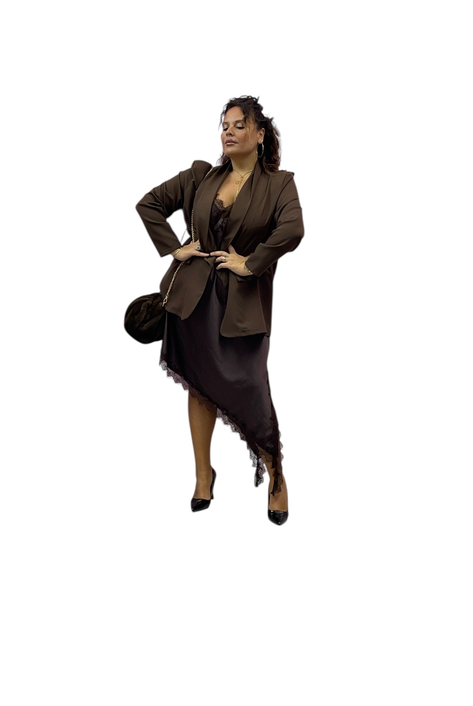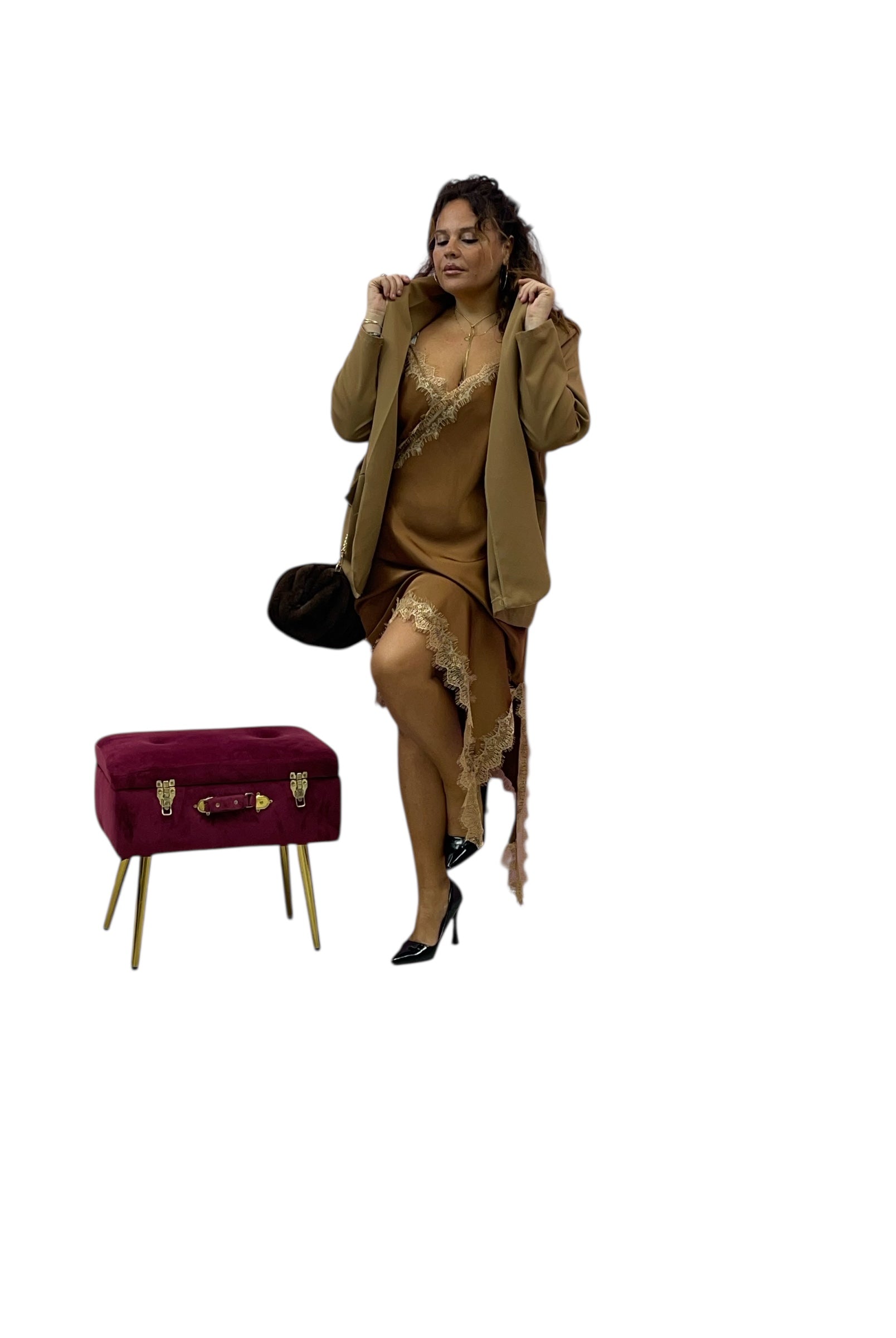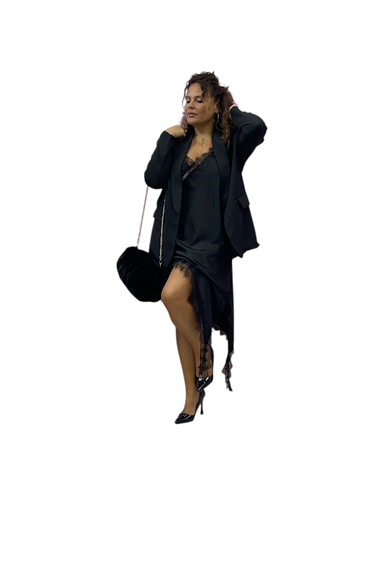 Abito over in raso con bretelline fascia di merletto  taglio di traversoe elastico indietro