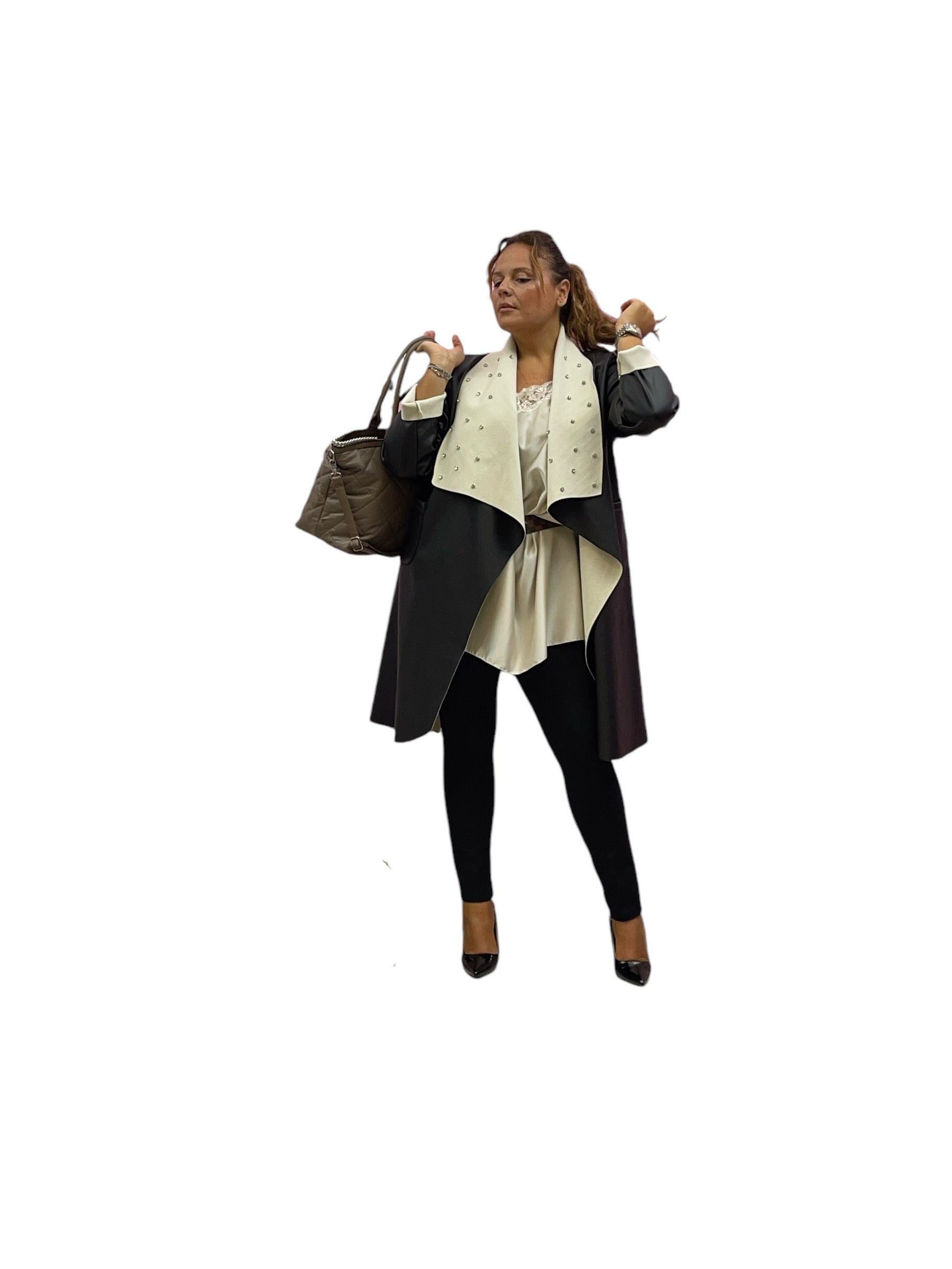 Cappotto lungo over in ecopelle con pietre al collo foderato internamente caldissimo