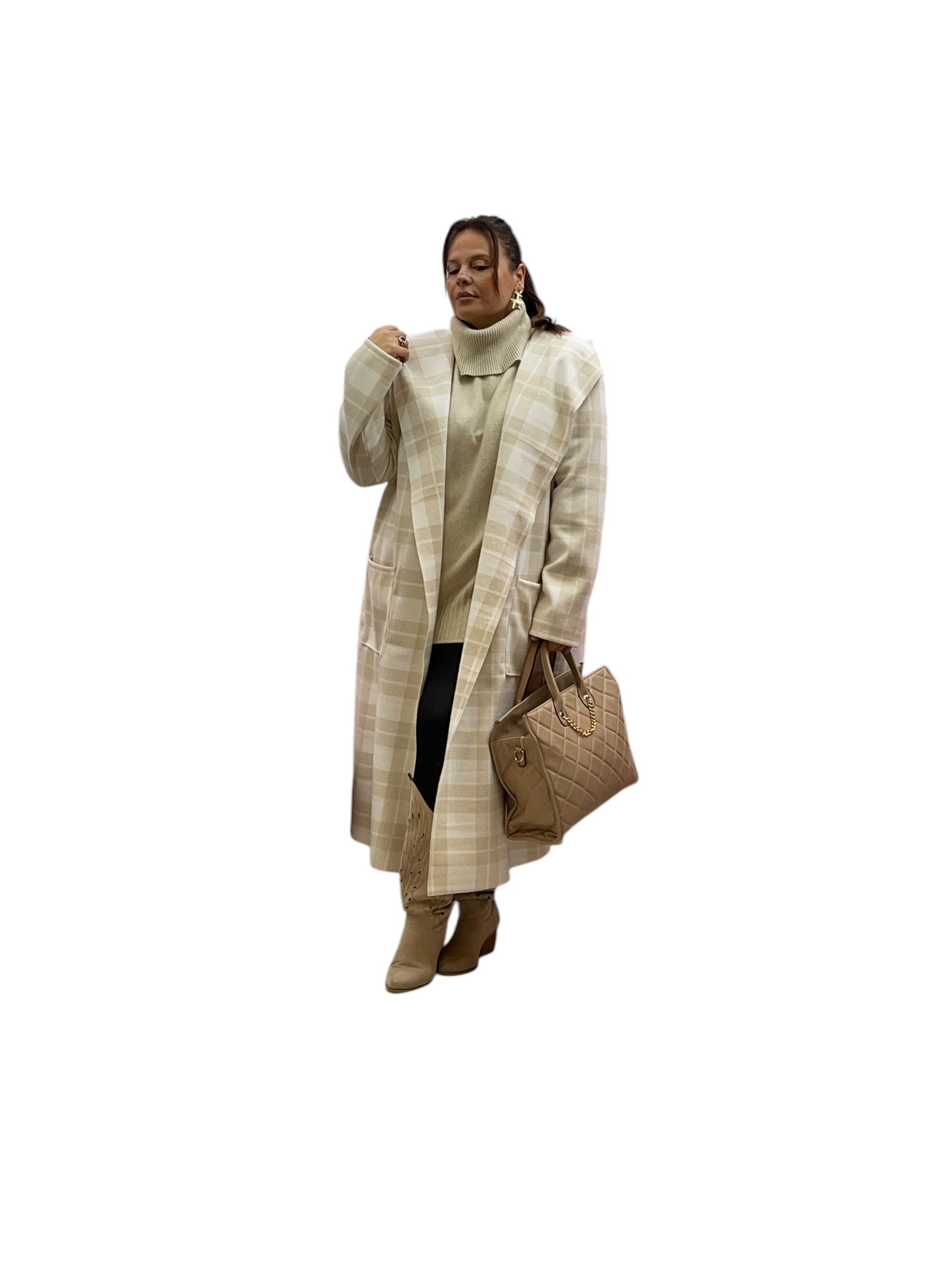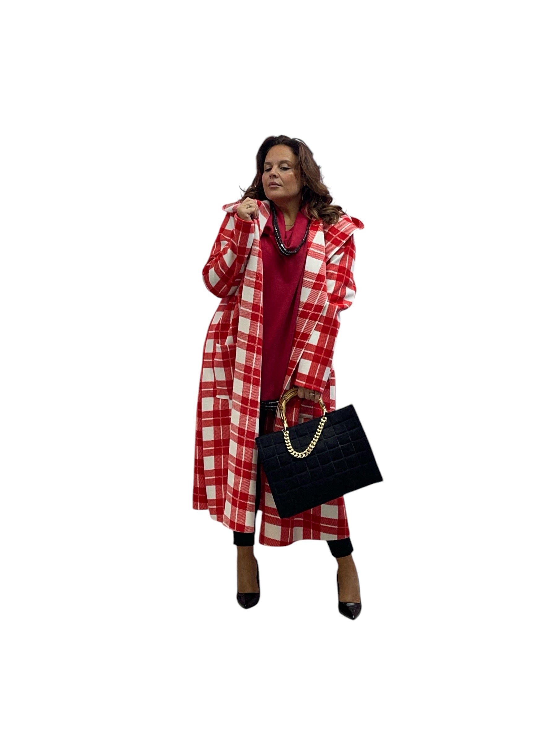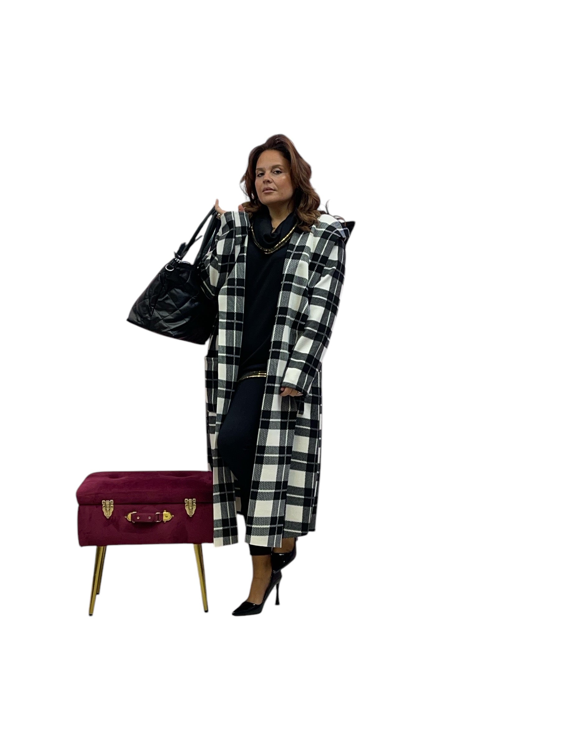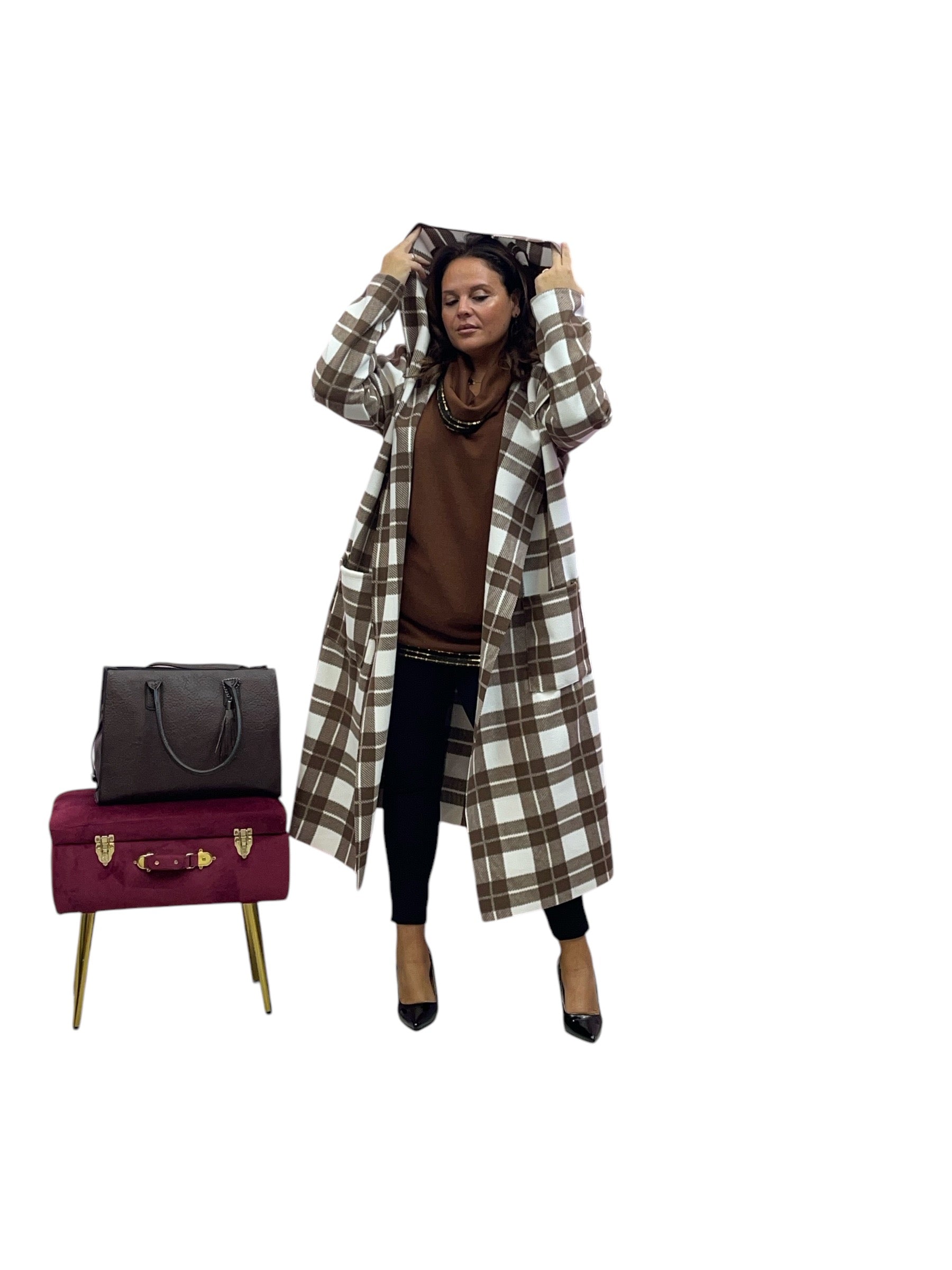 Cappotto over lungo in panno con cappuccio senza bottoni e zip stampa quadri