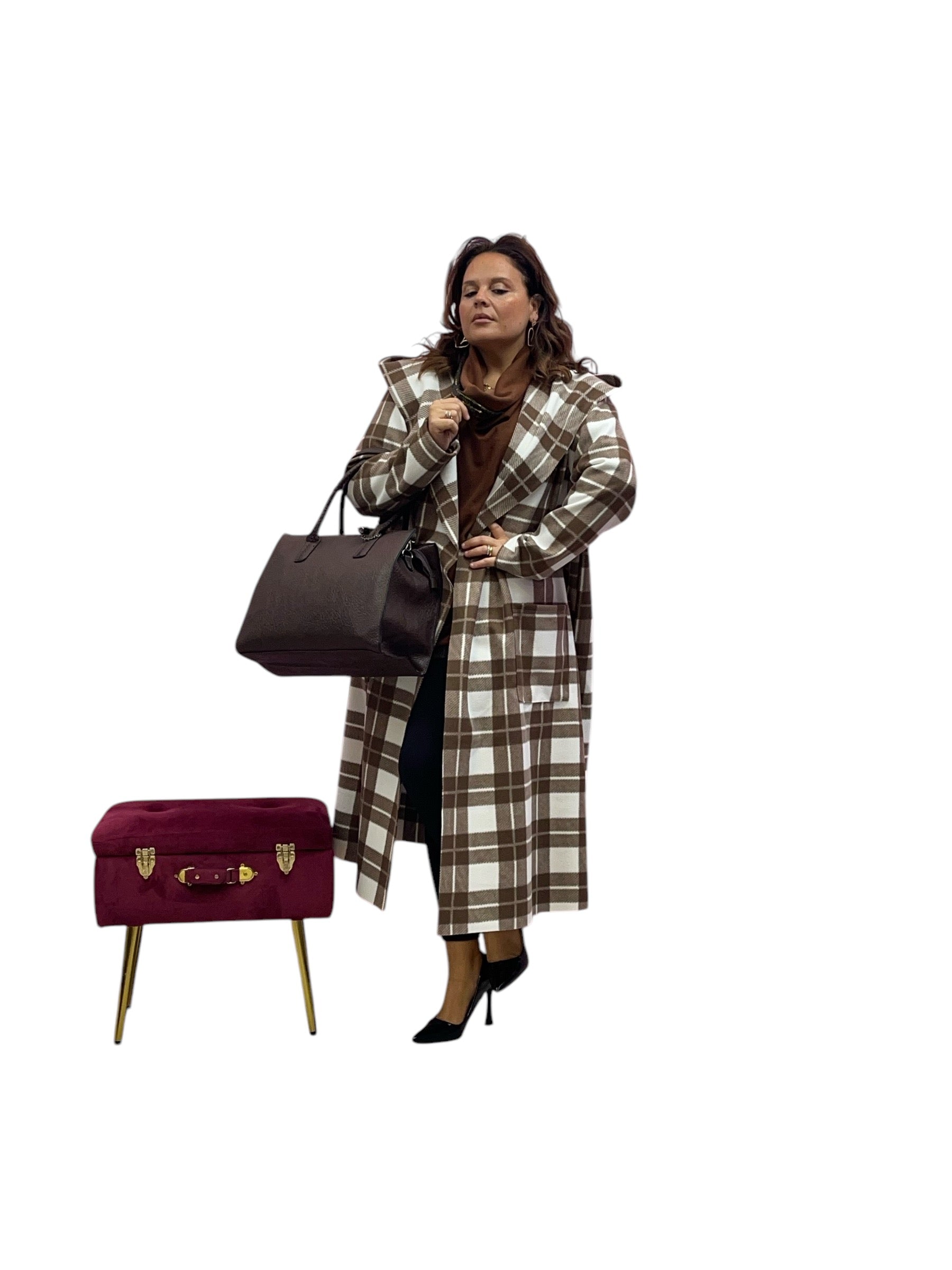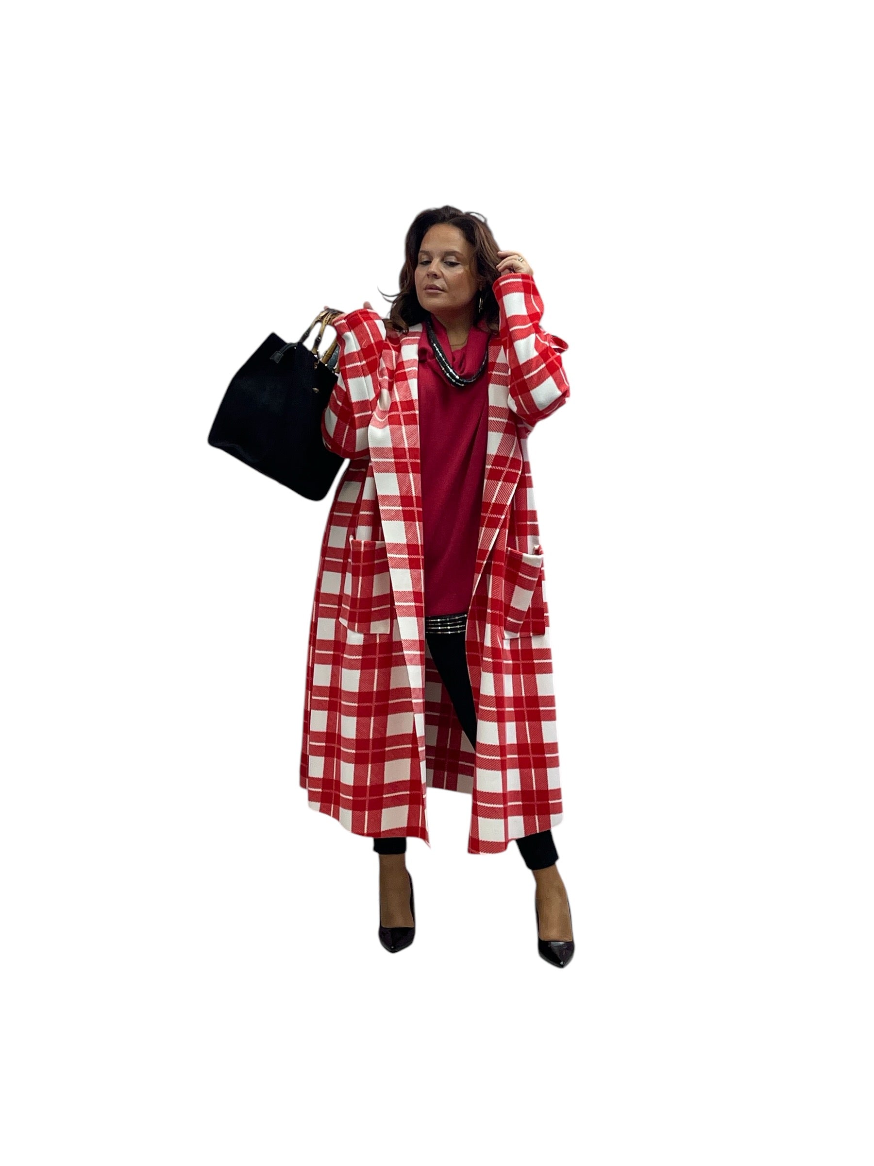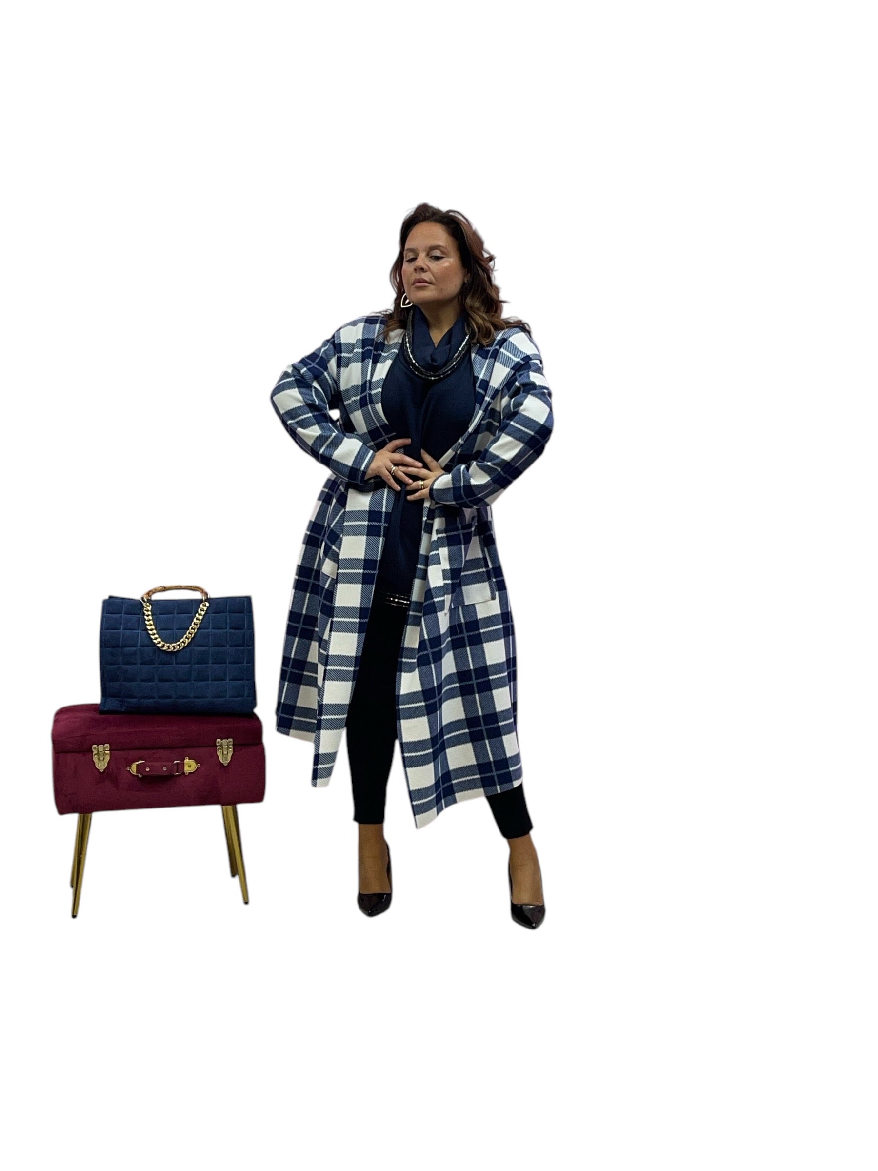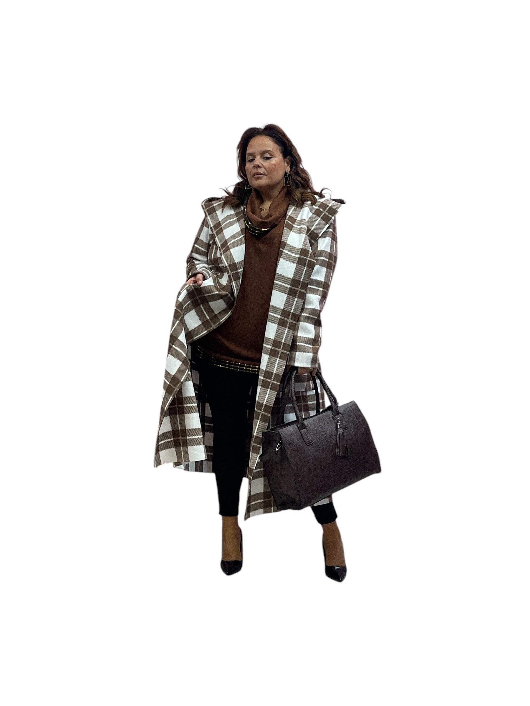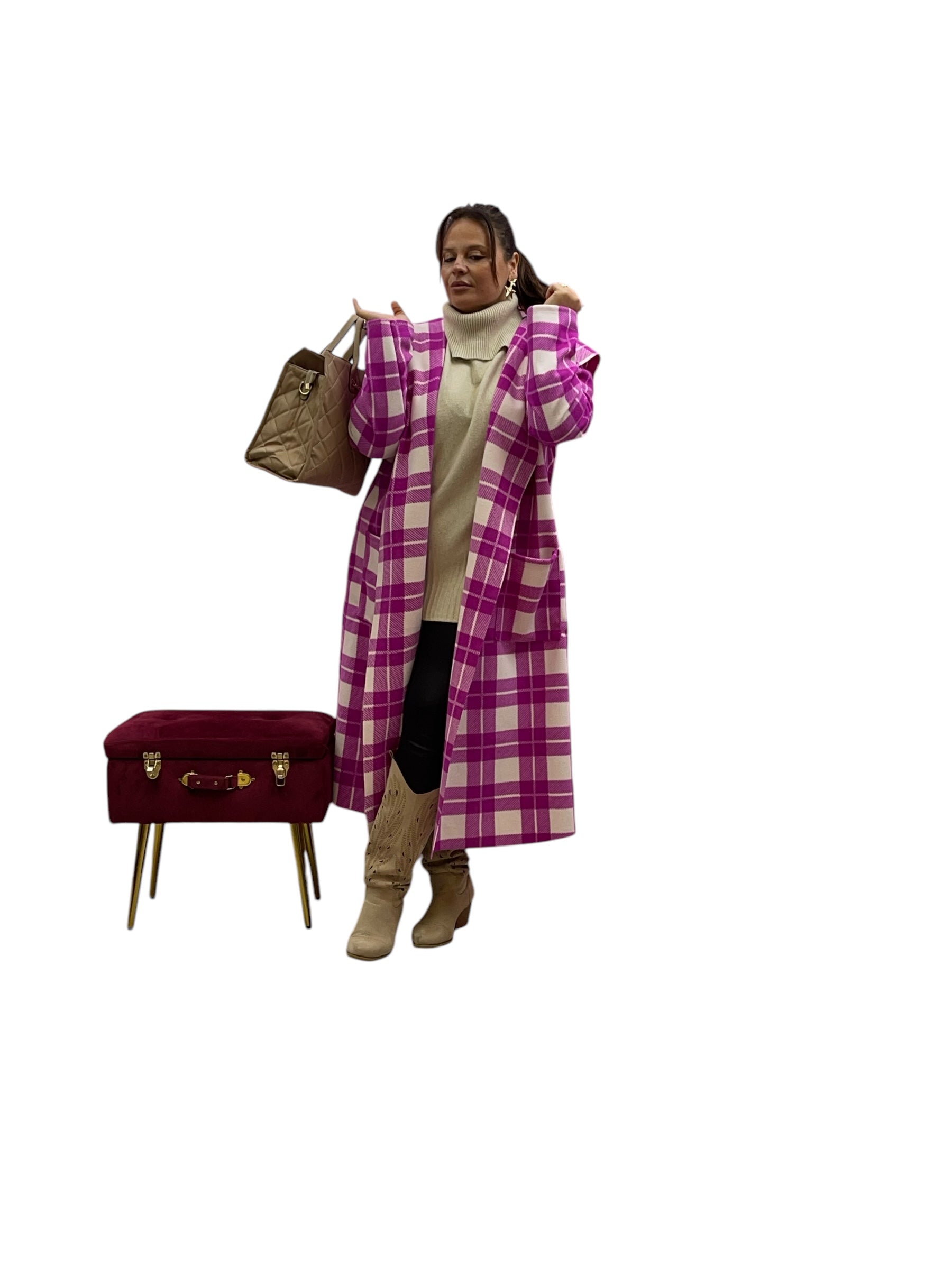 Cappotto over lungo in panno con cappuccio senza bottoni e zip stampa quadri