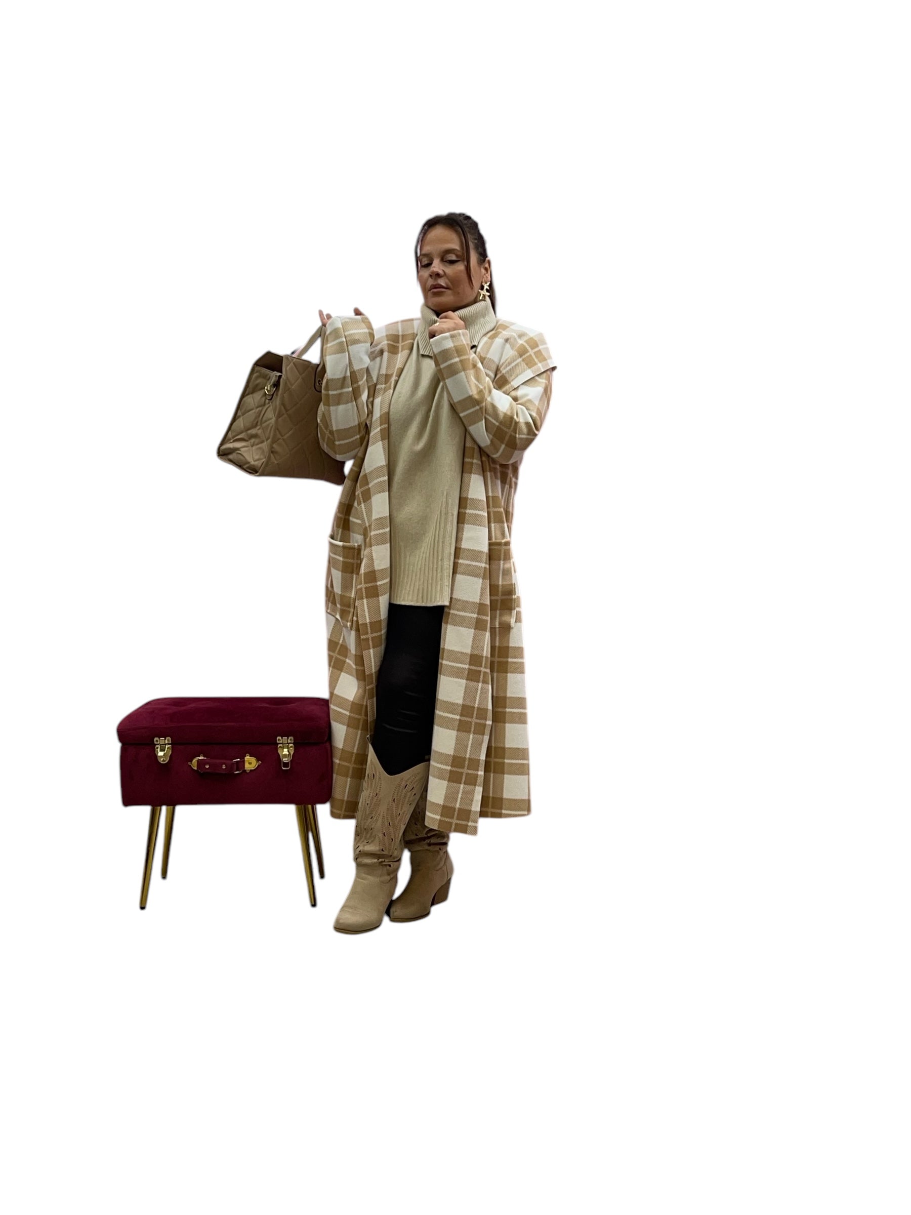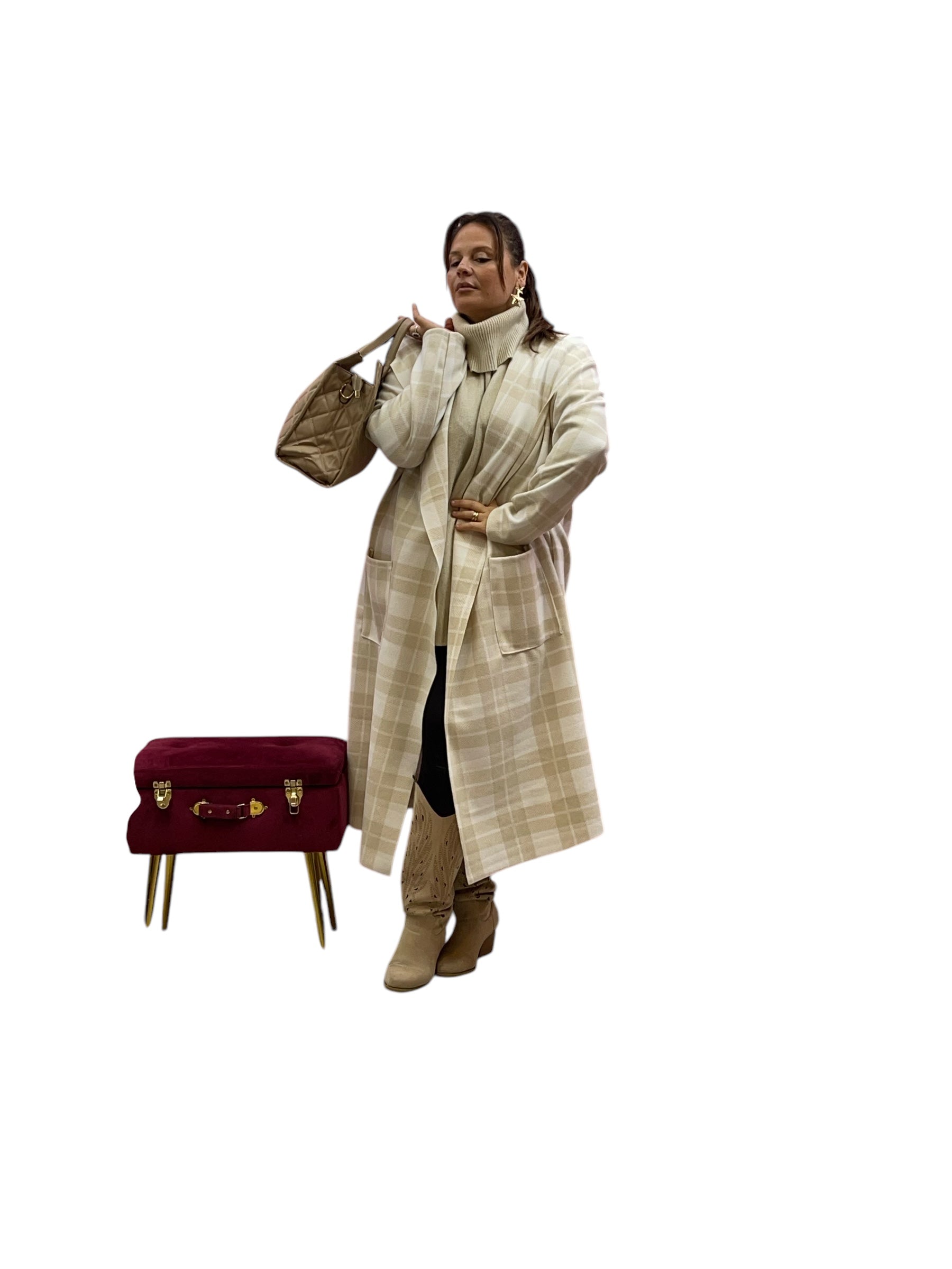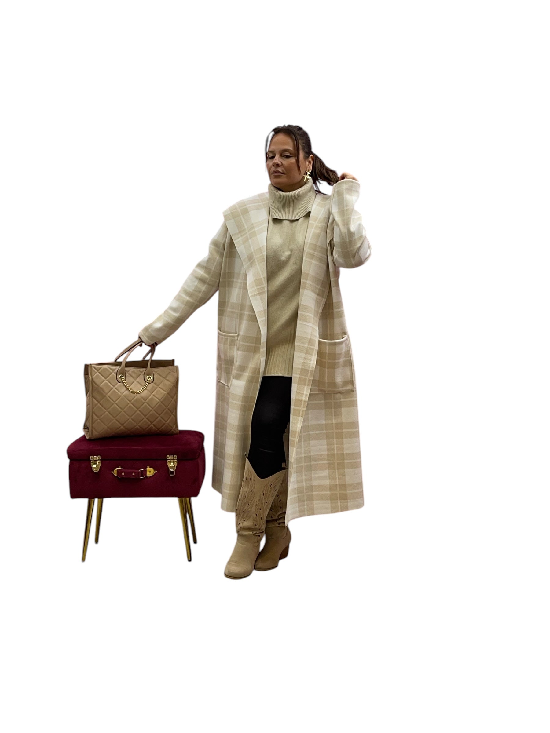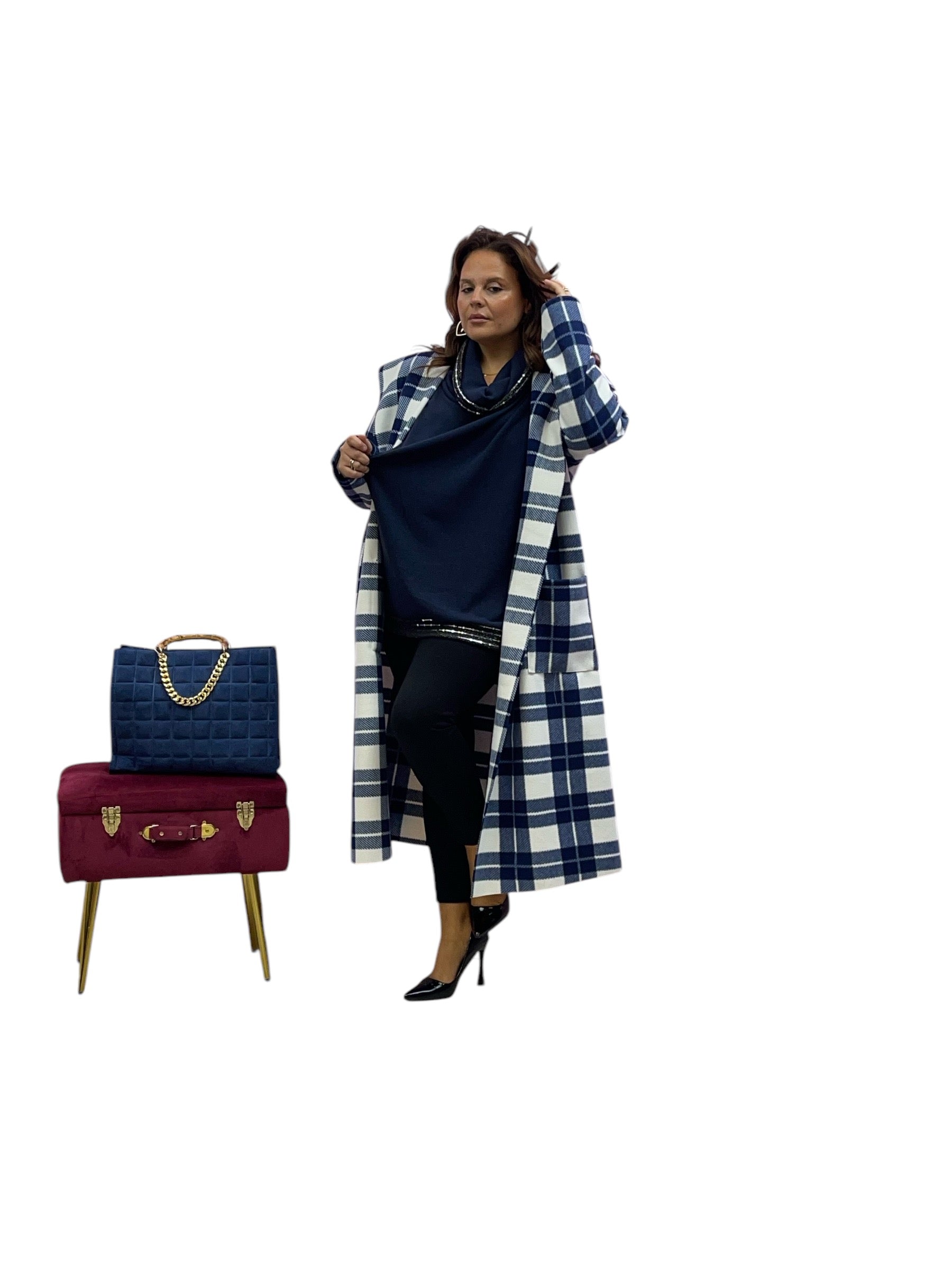 Cappotto over lungo in panno con cappuccio senza bottoni e zip stampa quadri