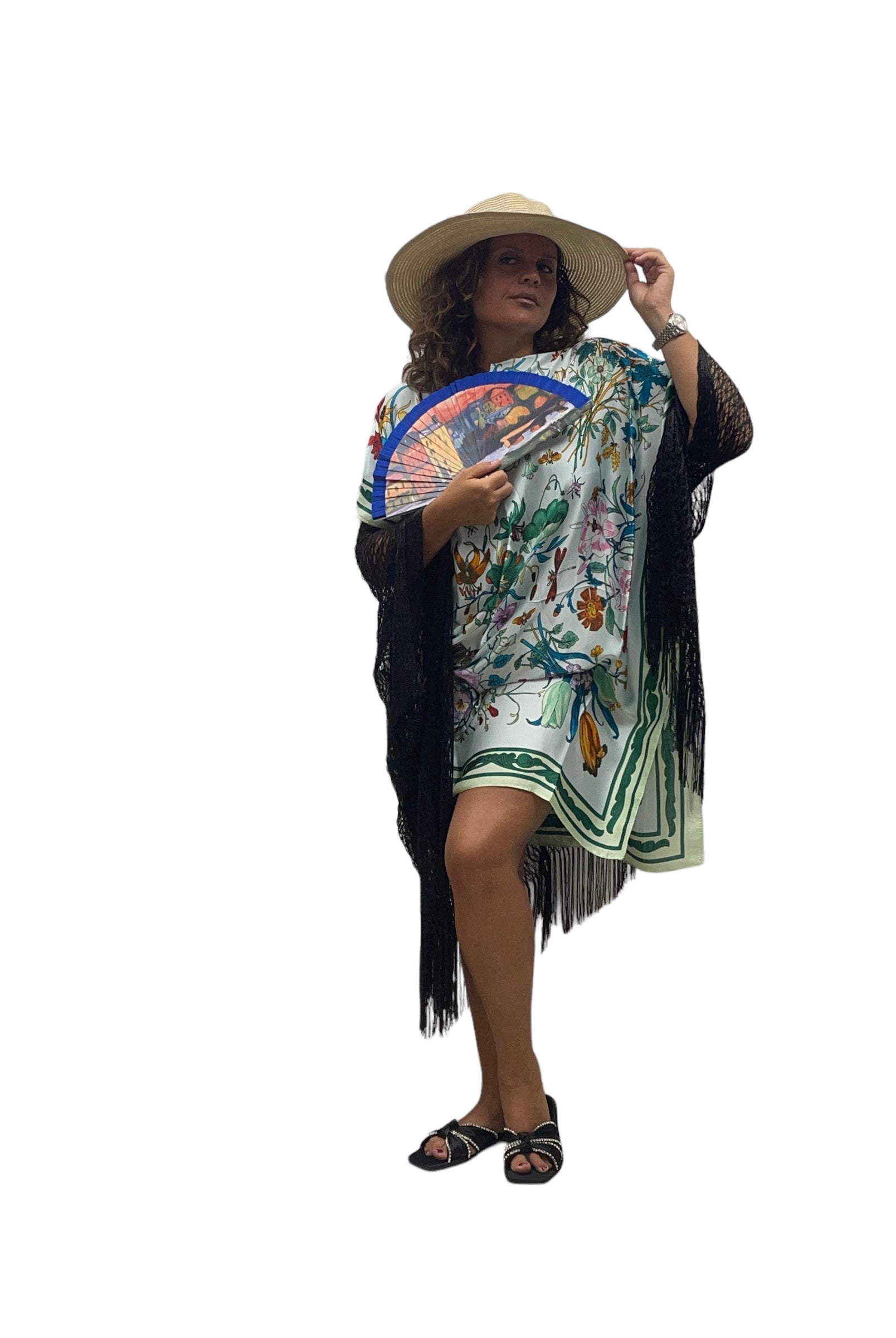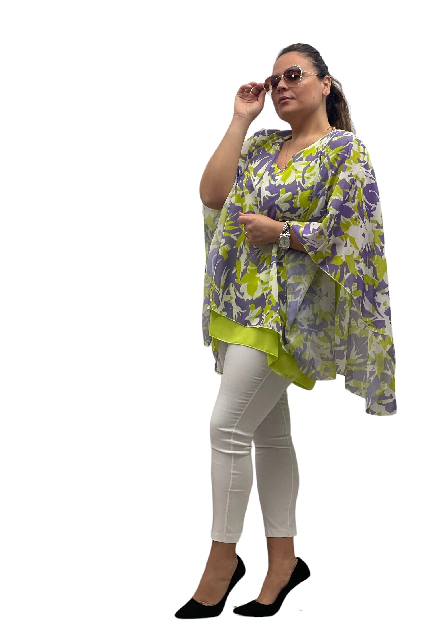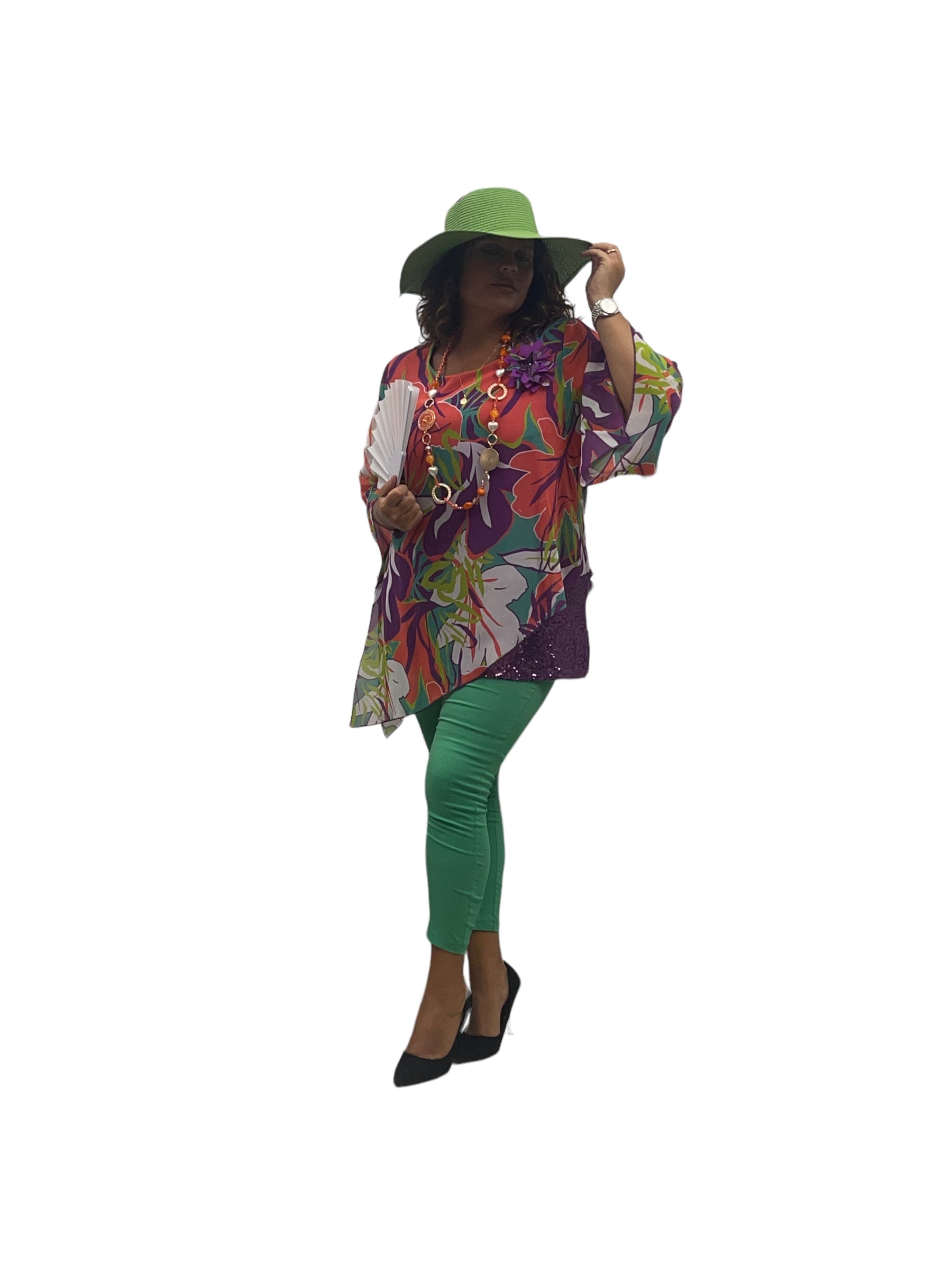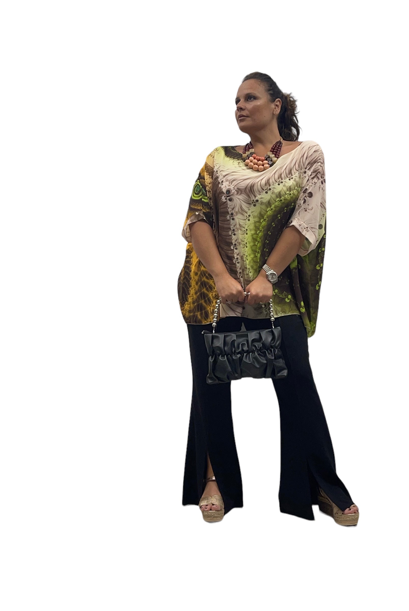 Casacca over fantasia in georgette con spillone e top in maglina cucito alle spalle e fascia di paiette