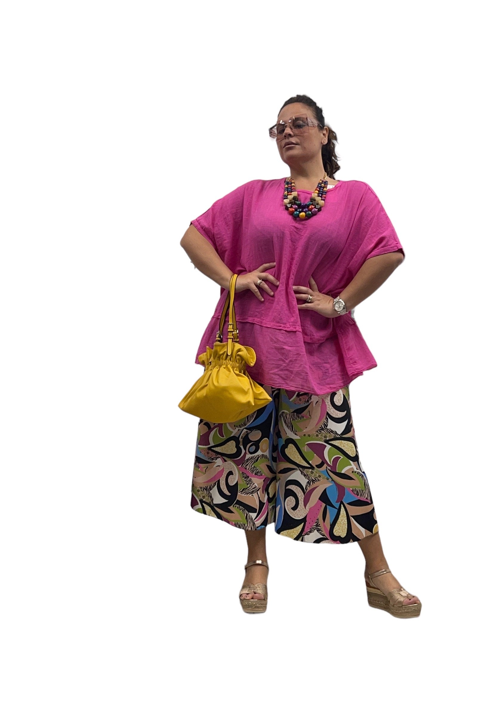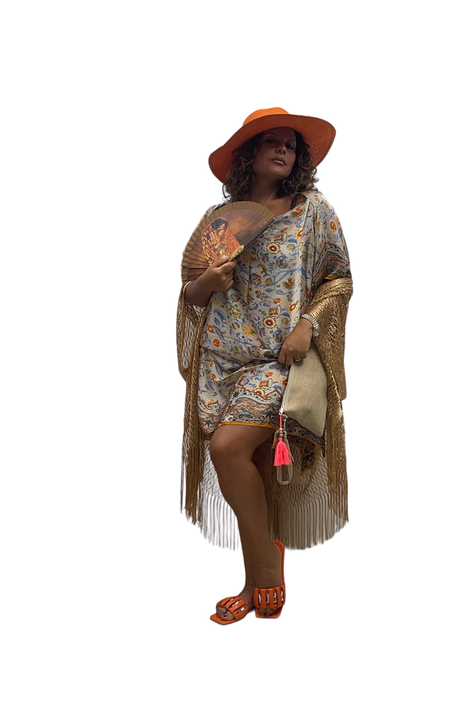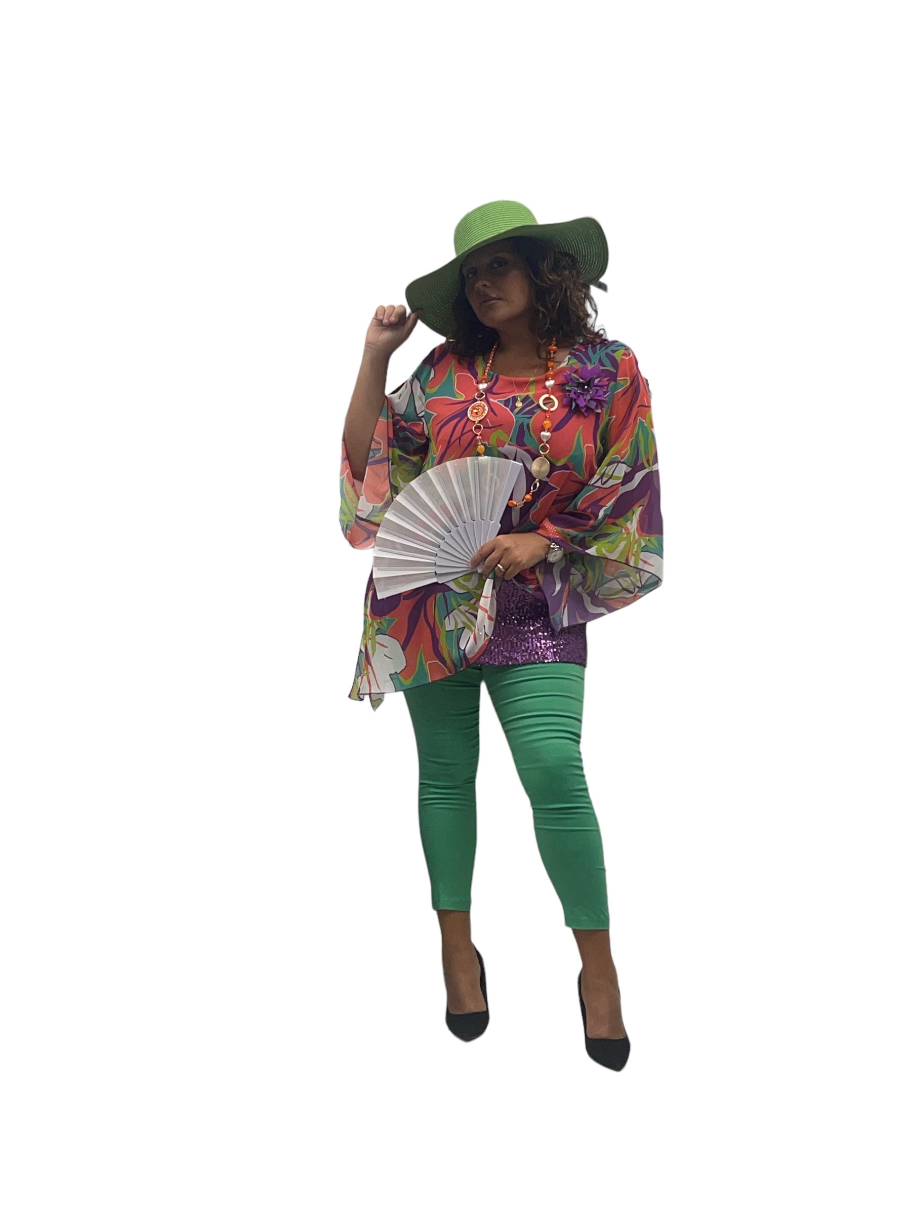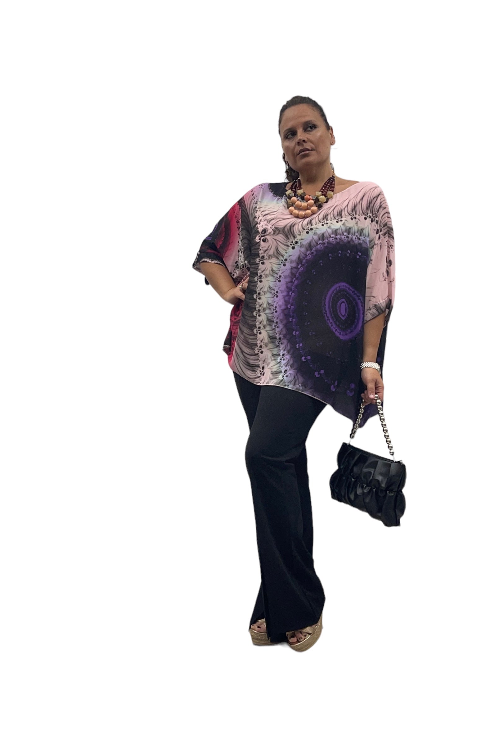 Casacca over fantasia in georgette con spillone e top in maglina cucito alle spalle e fascia di paiette