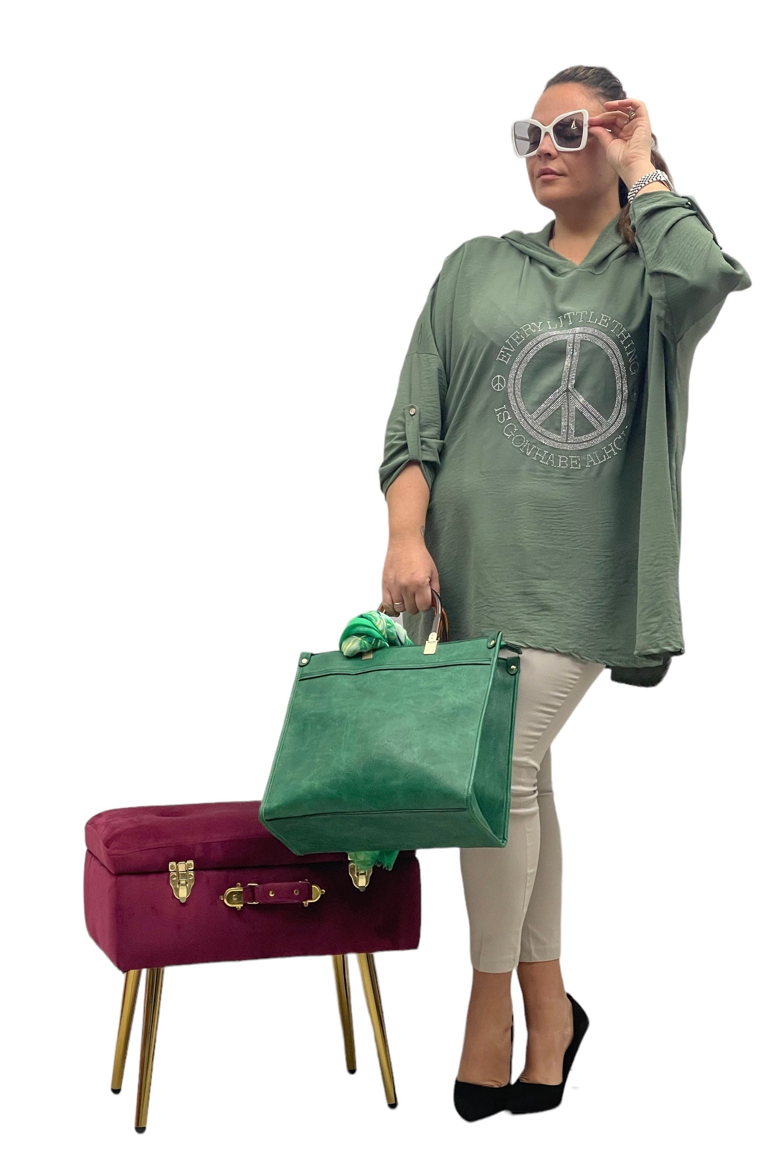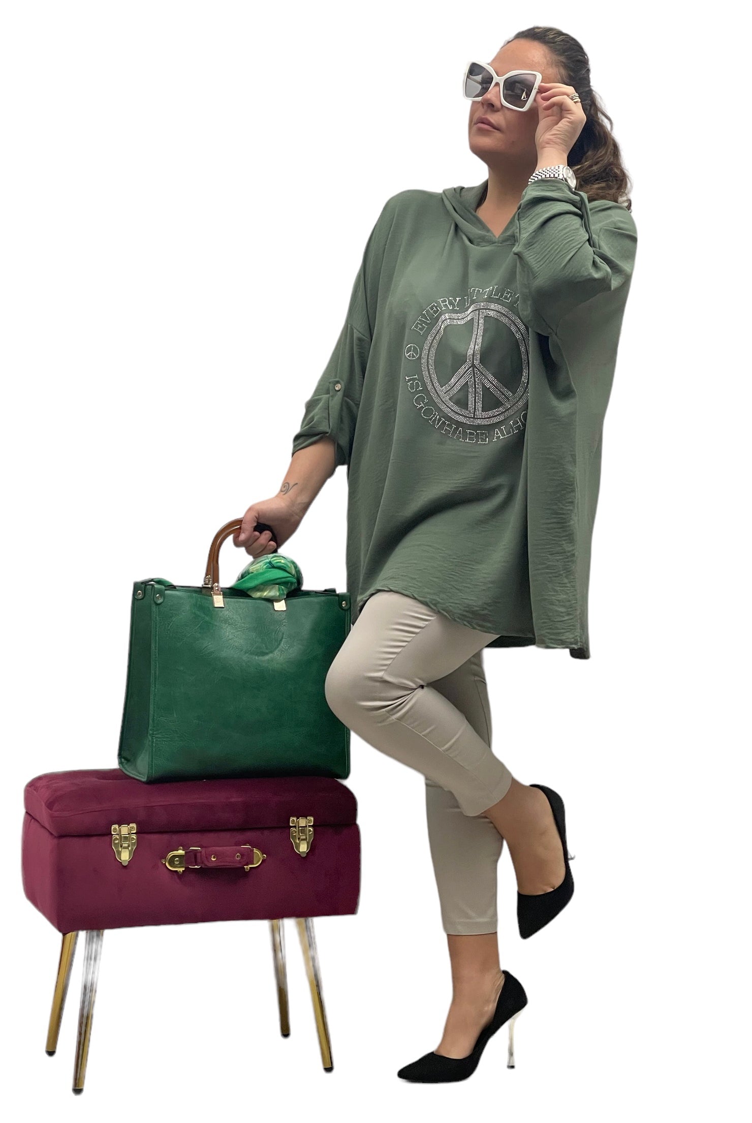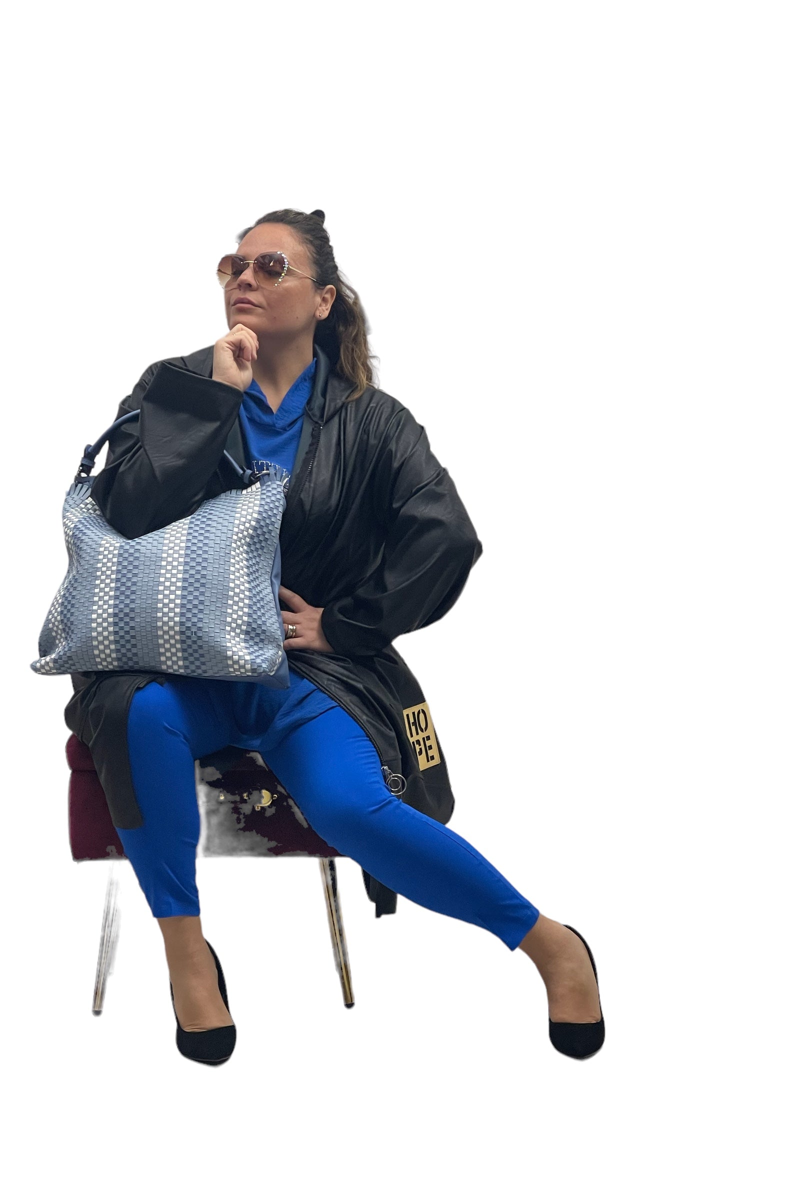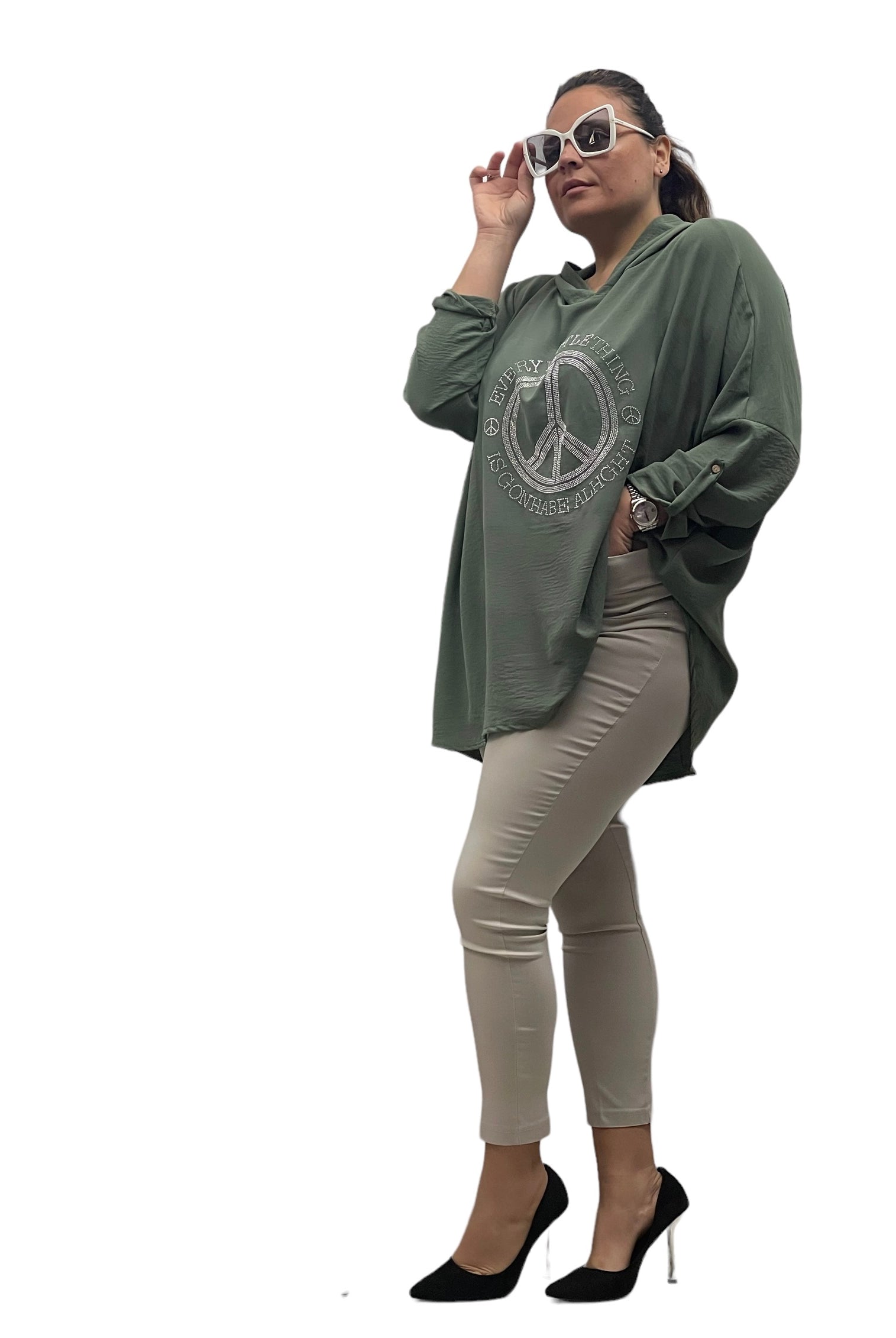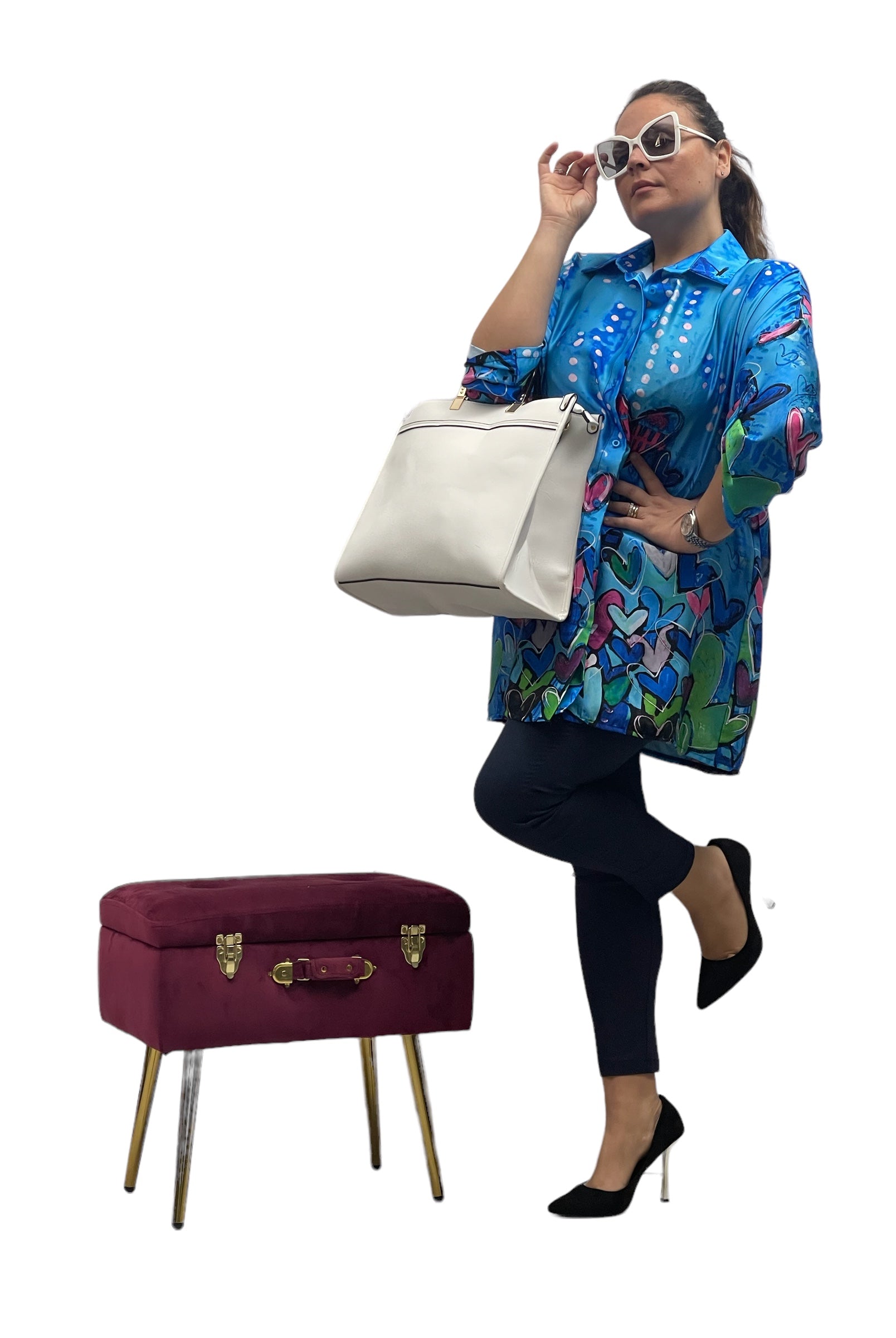 Casacca over fantasia in georgette con spillone e top in maglina cucito alle spalle e fascia di paiette