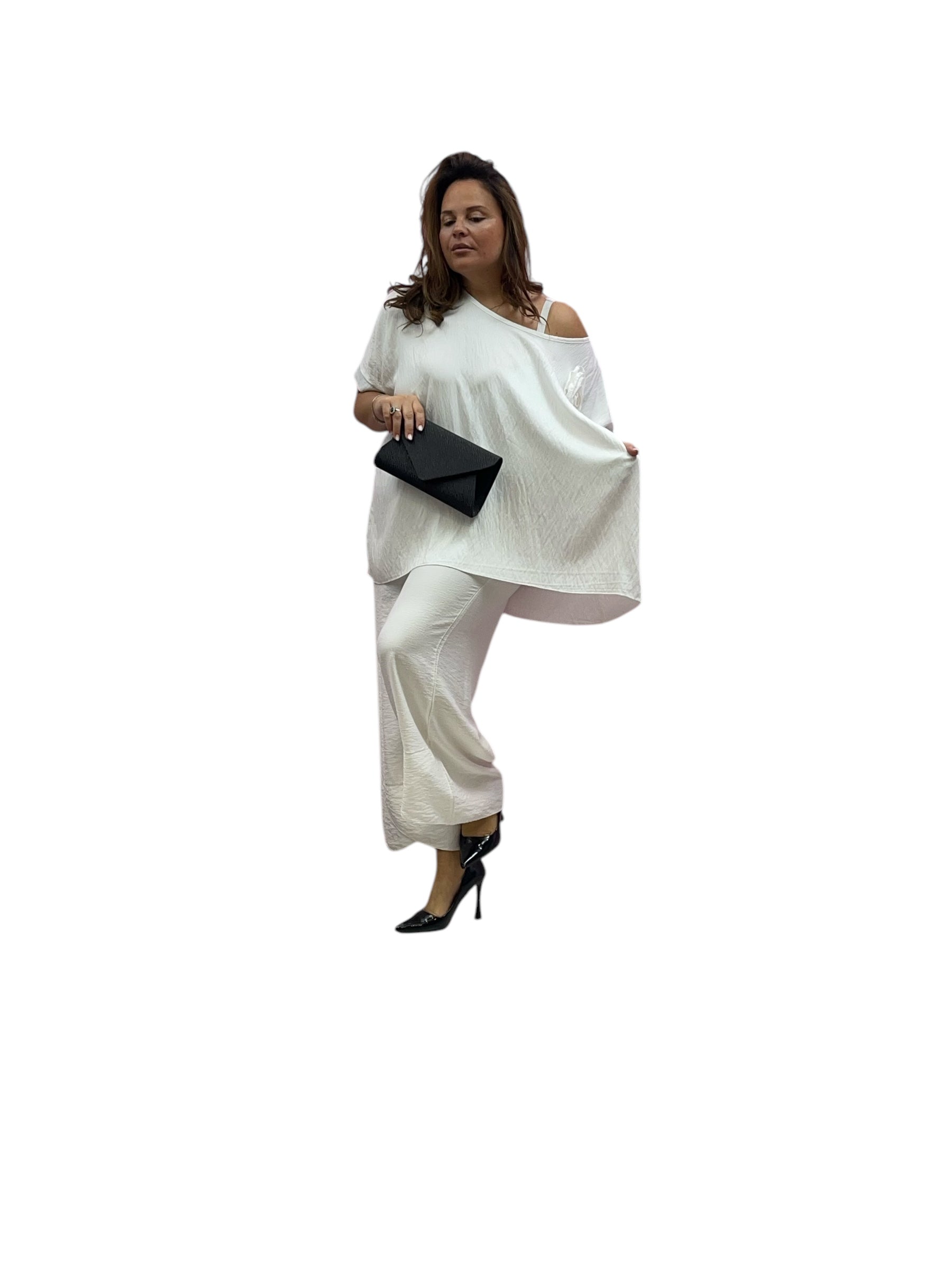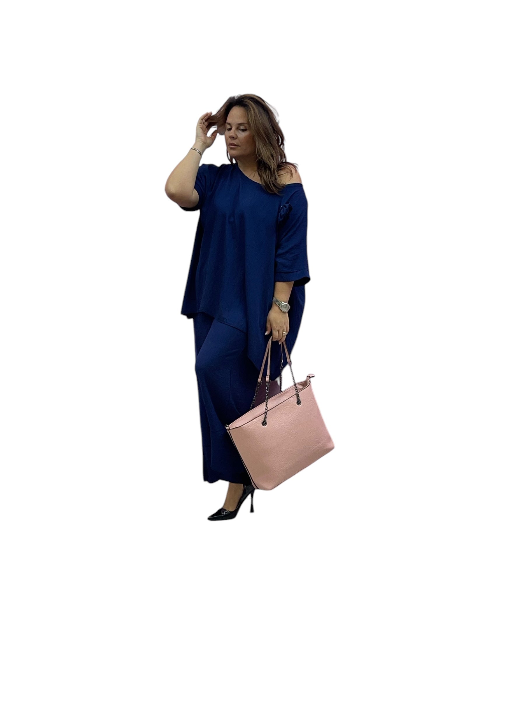 Completo over con casacca over e spillone staccabile e pantaloni palazzo con elastico in vita