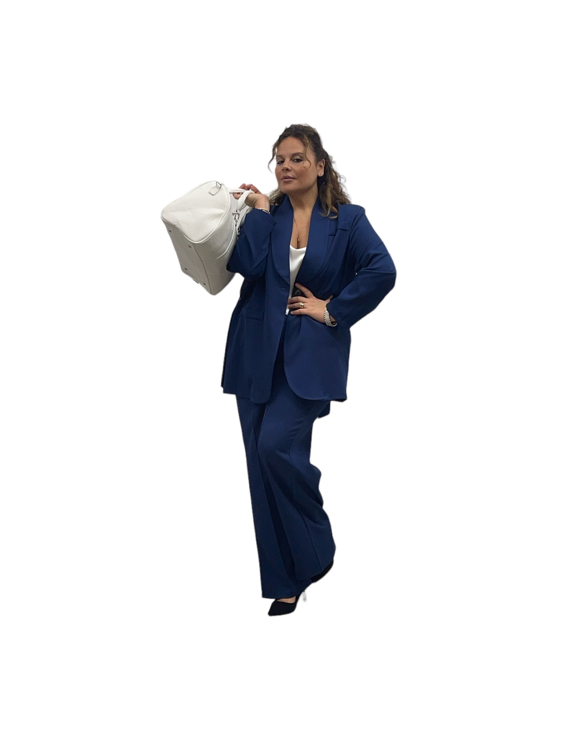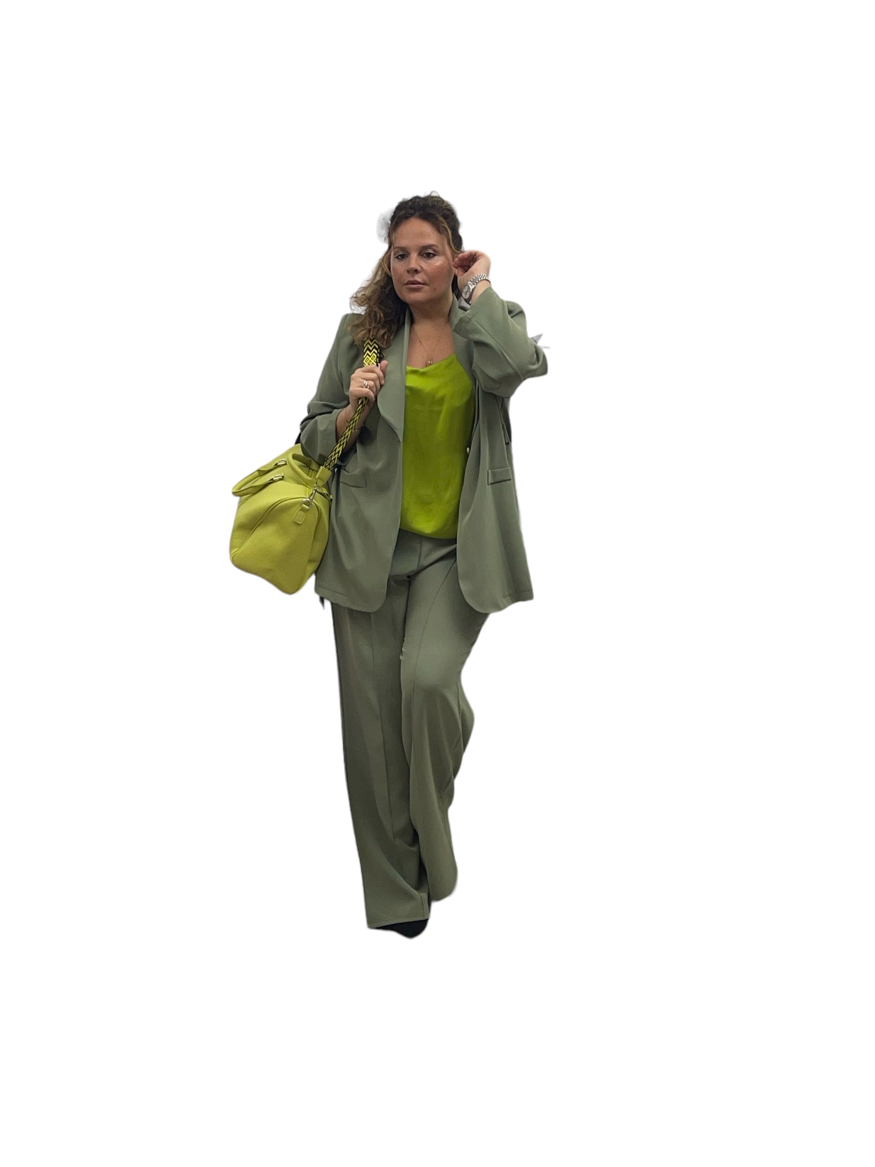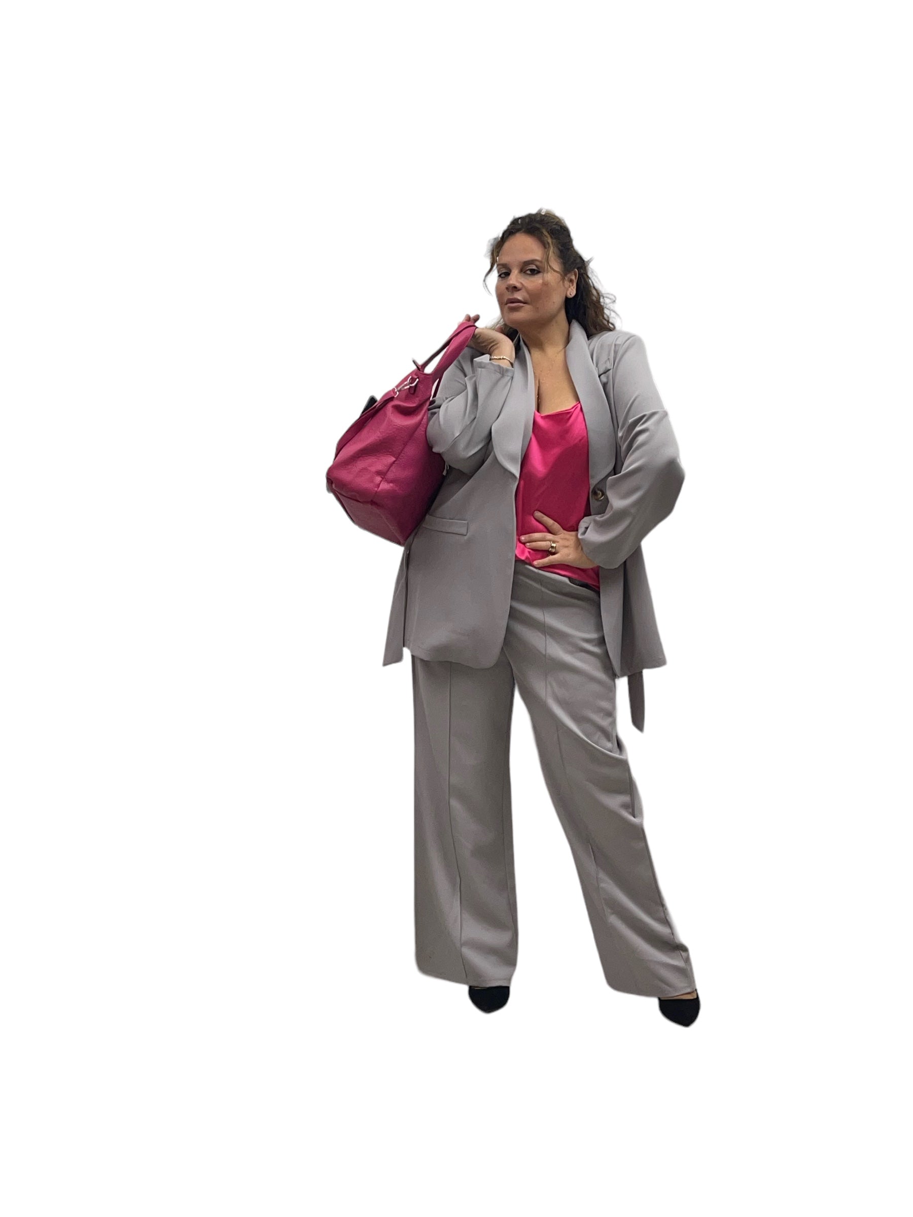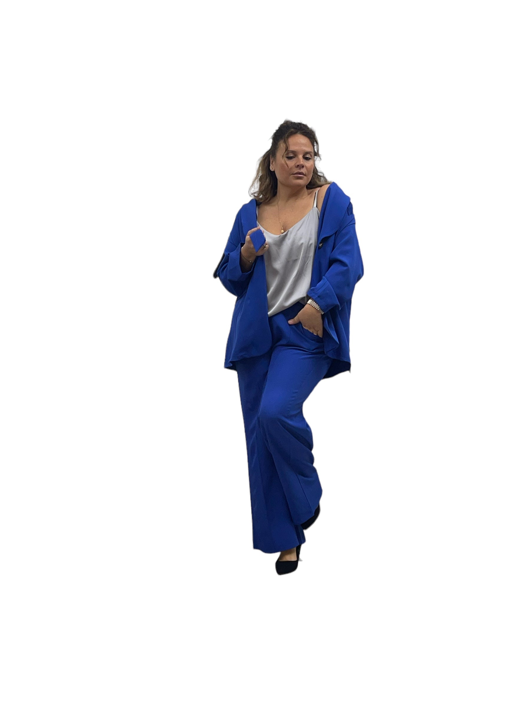Completo over con giaaca lunga e cintura, pantaloni moebidi con elastico in vita e tasca america