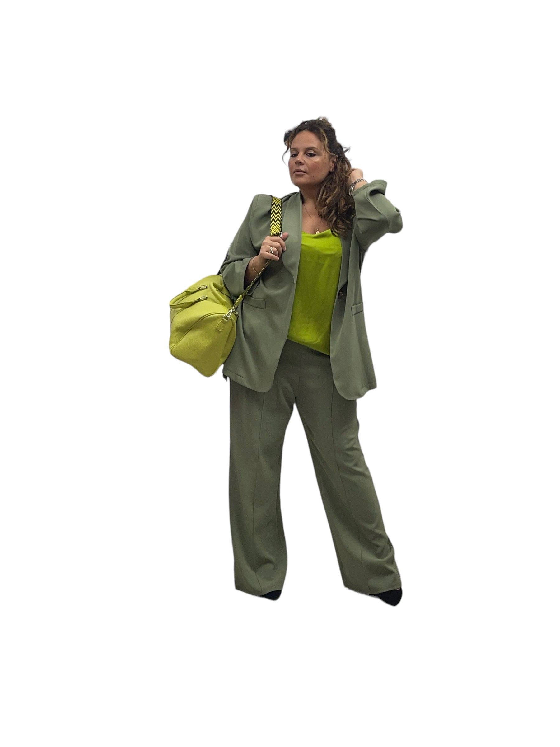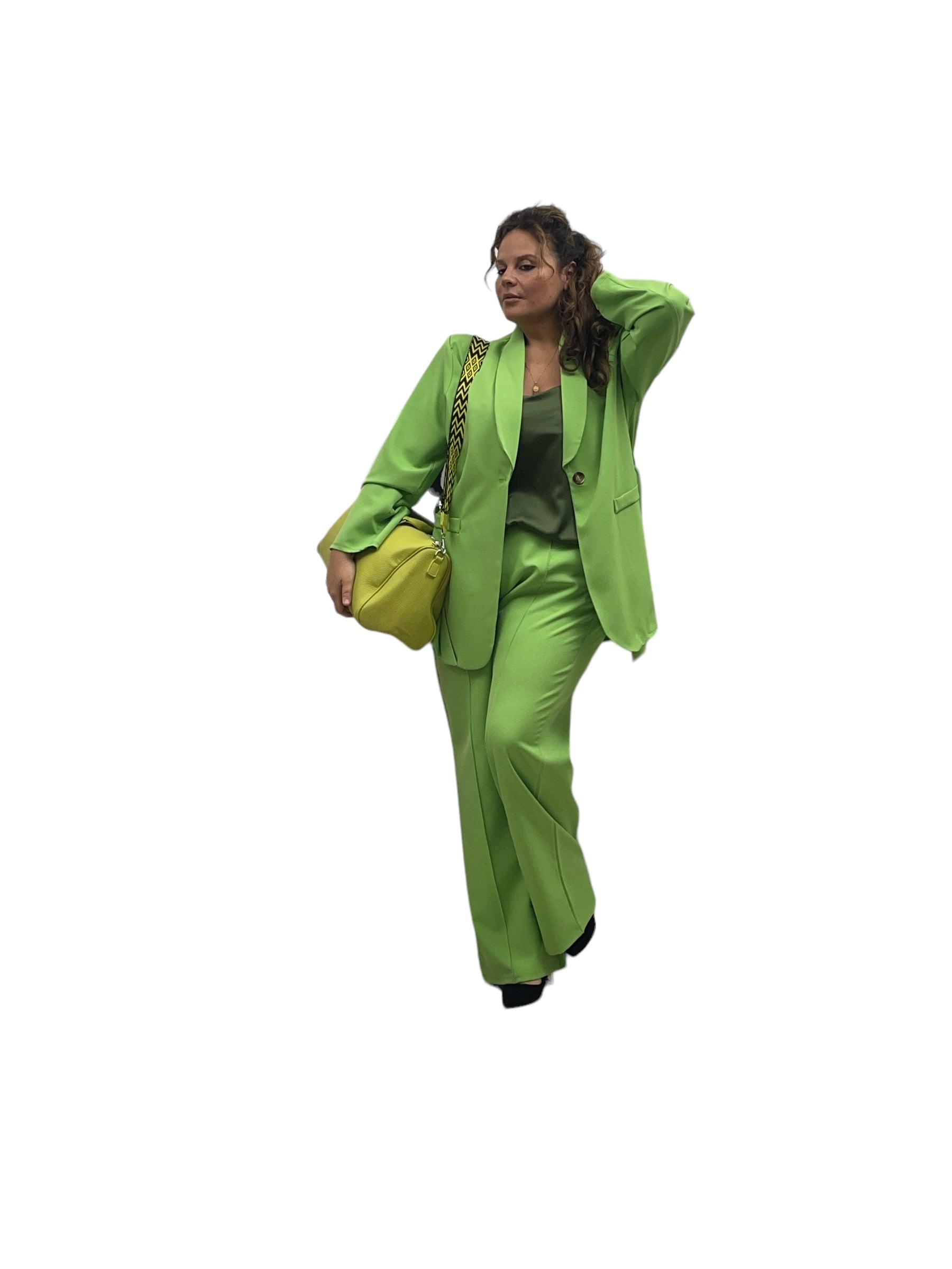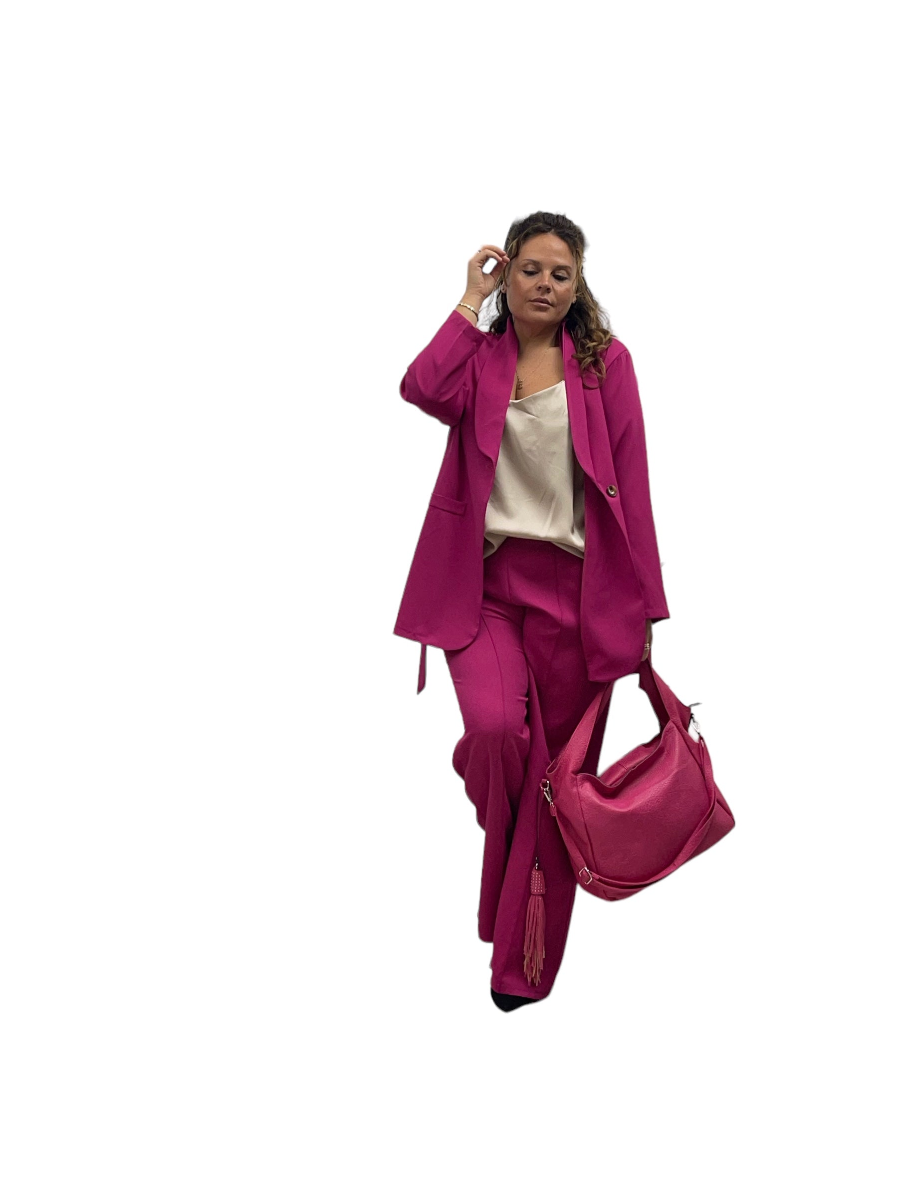 Completo over con giaaca lunga e cintura, pantaloni moebidi con elastico in vita e tasca america