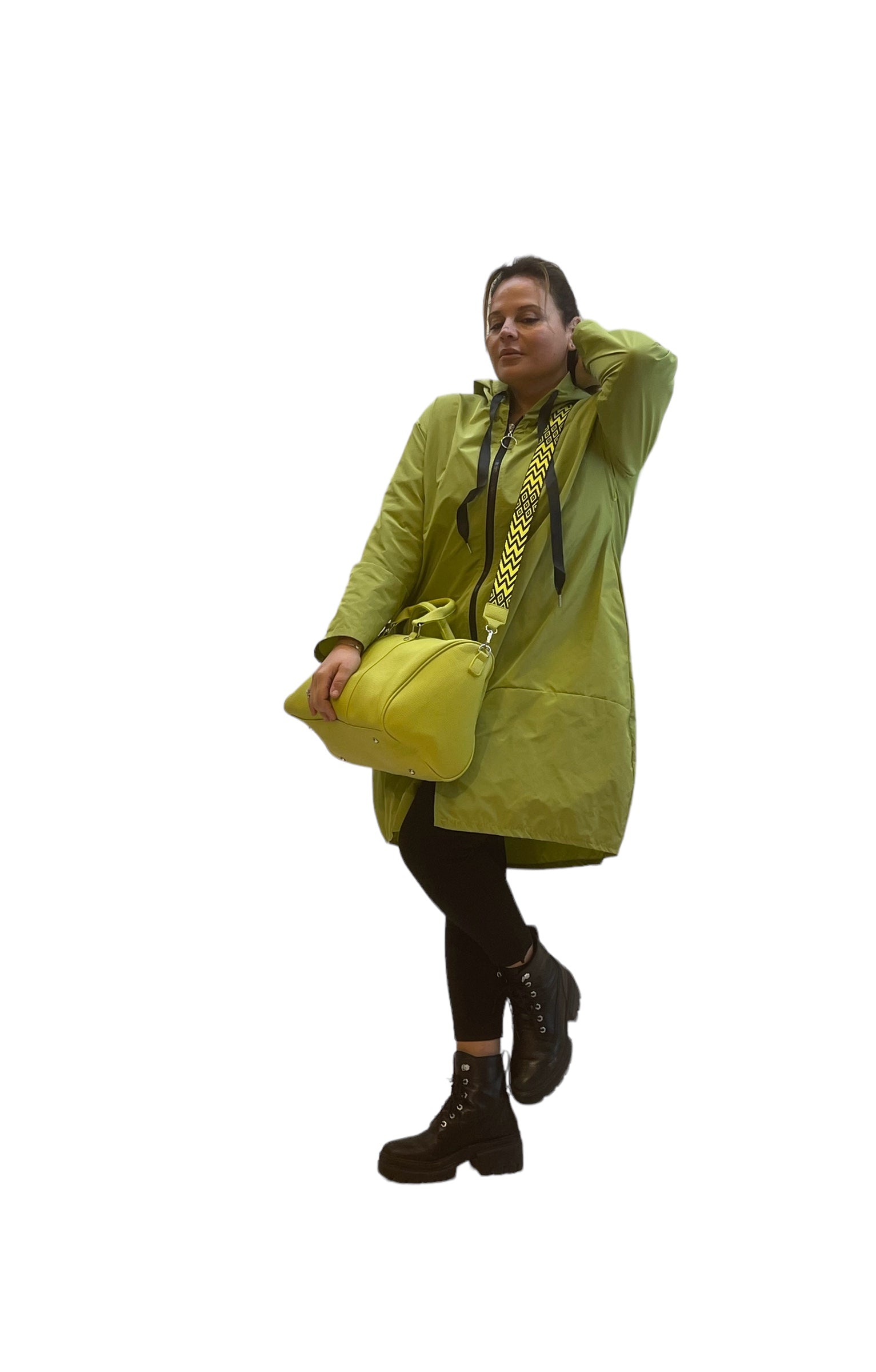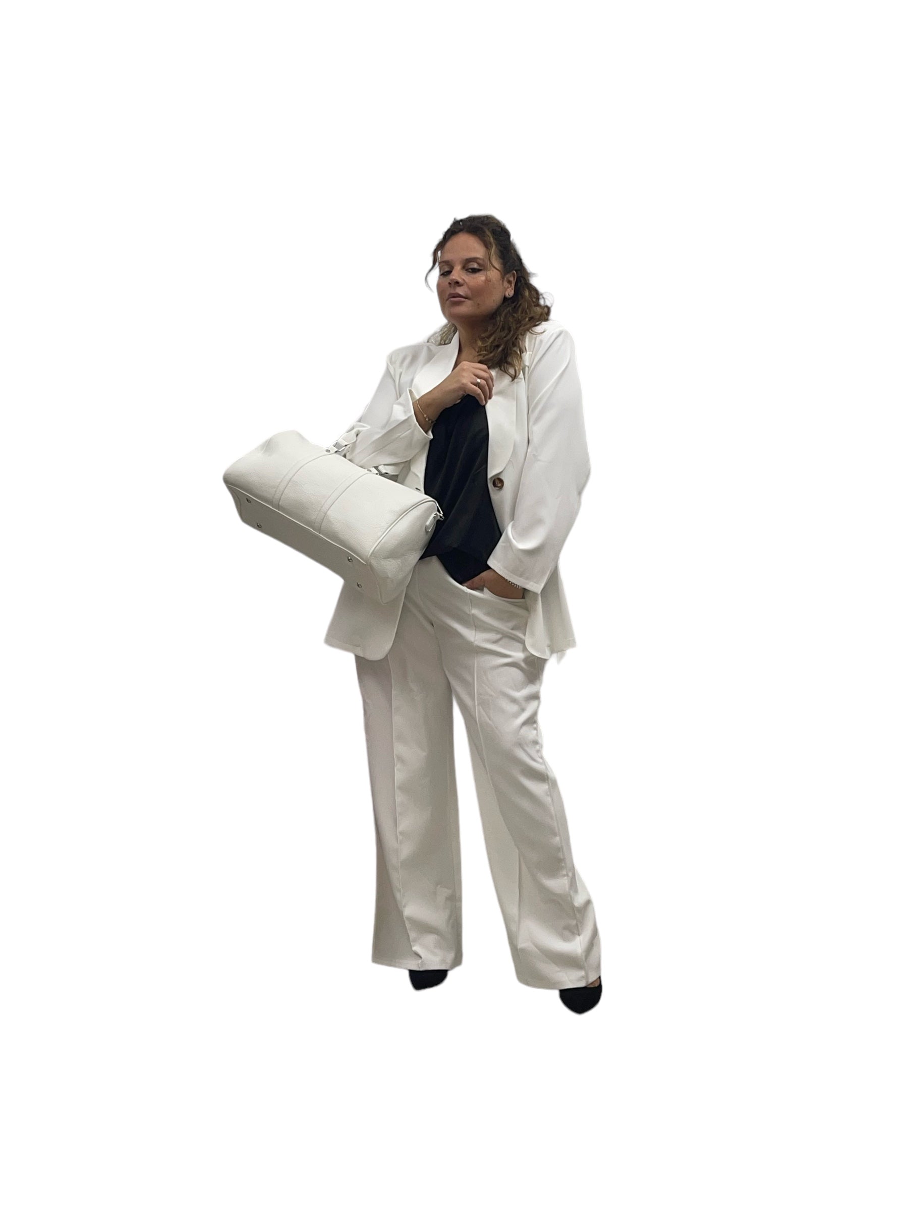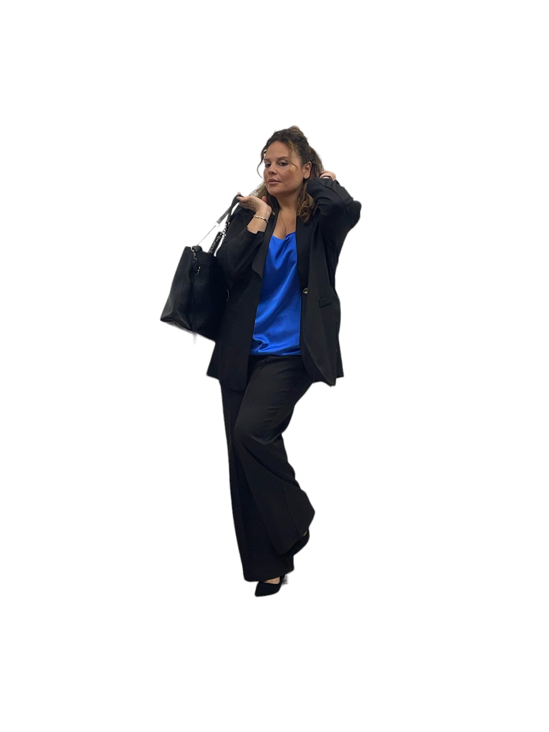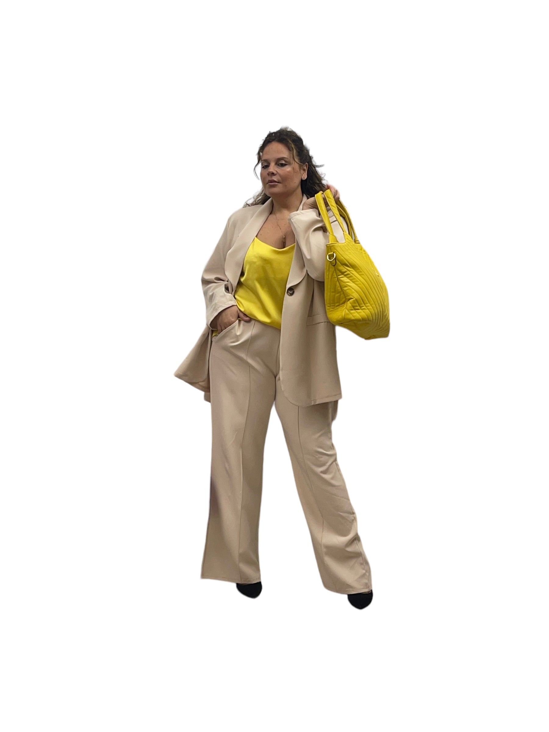 Completo over con giaaca lunga e cintura, pantaloni moebidi con elastico in vita e tasca america
