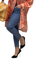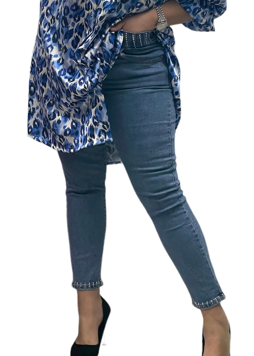 Jeans modello leggins con elastico in vita e caviglia con applicazioni