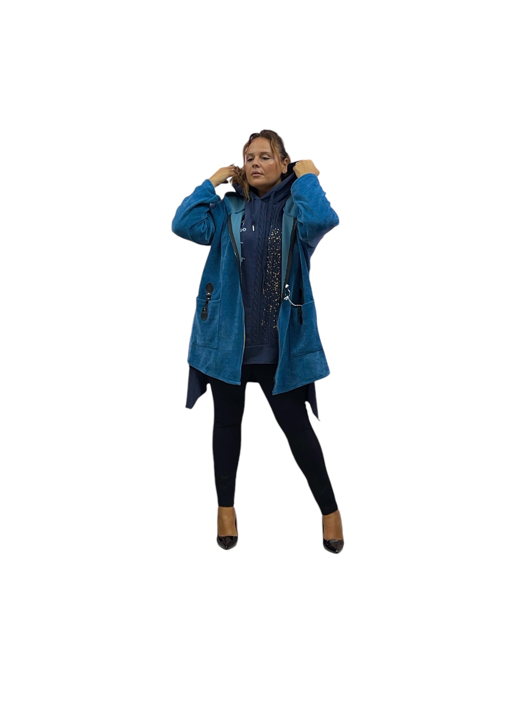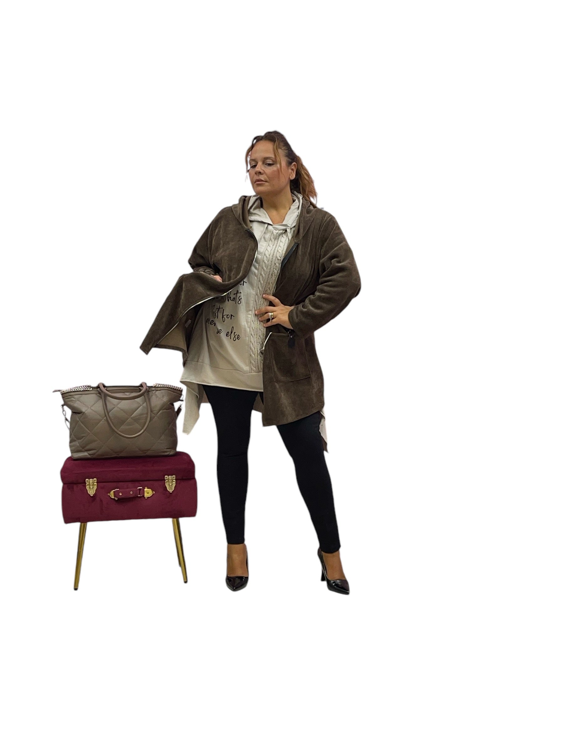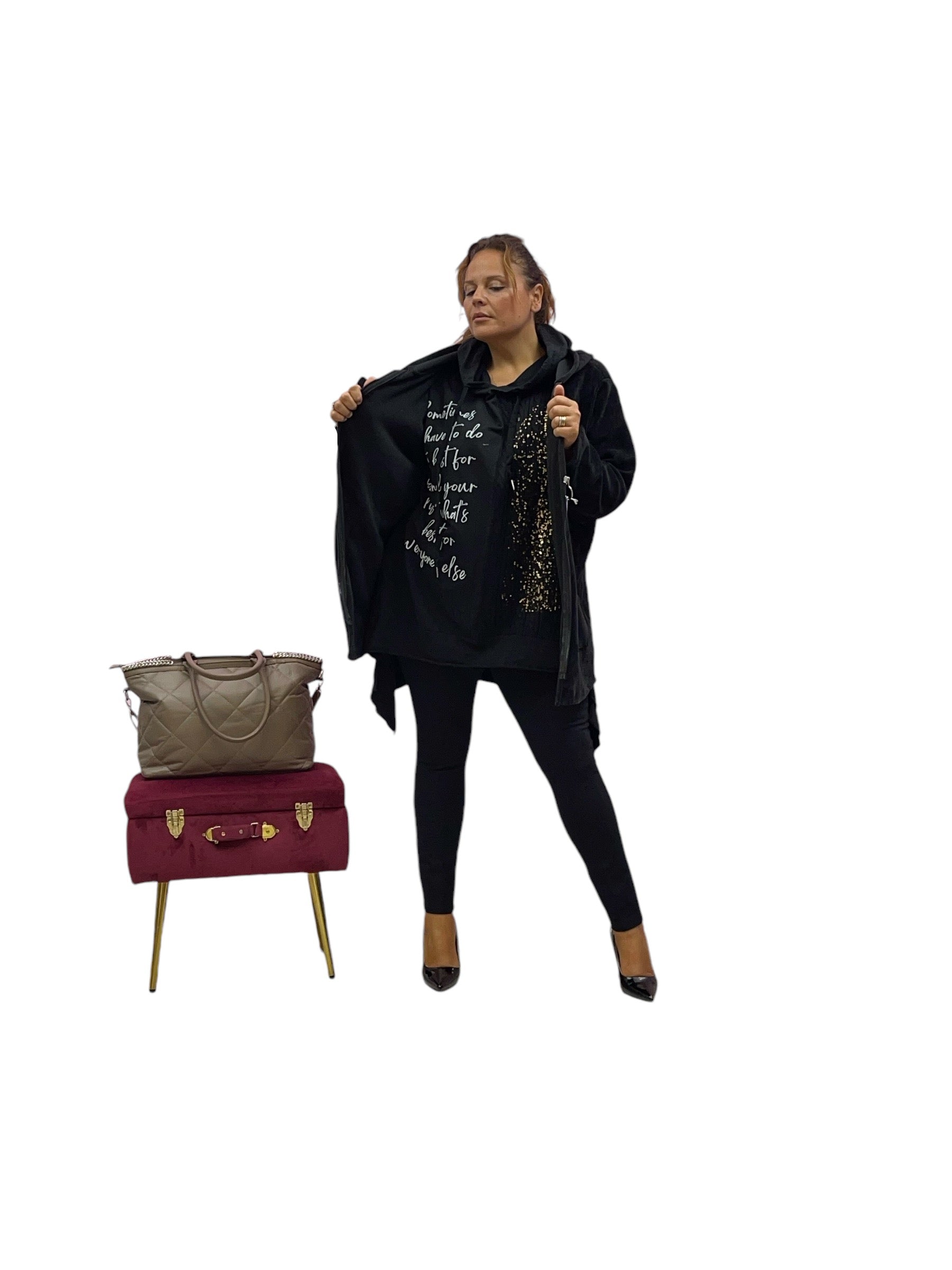 Magliettone over con cappuccio lavorato su un lato piu lungo dietro