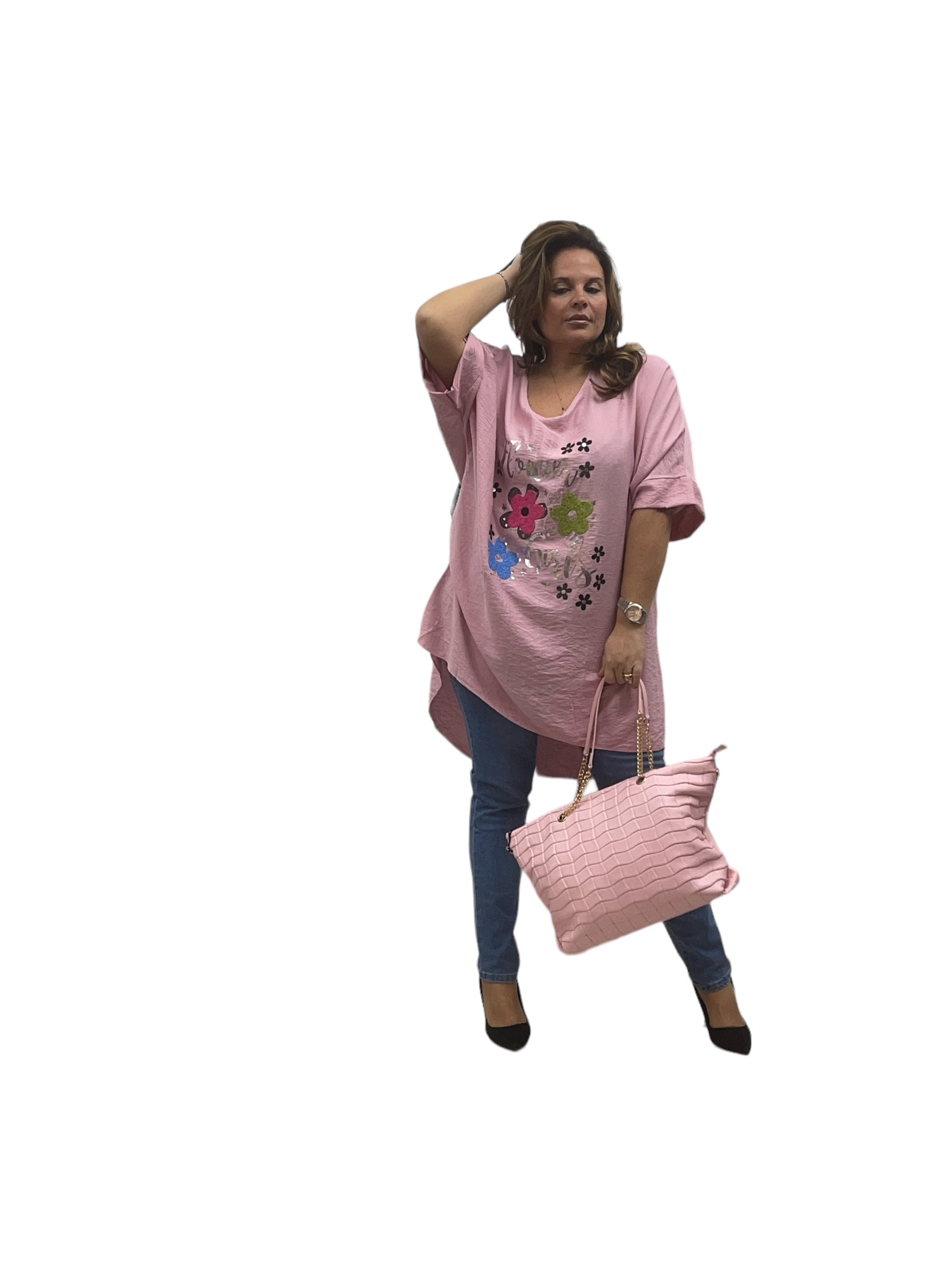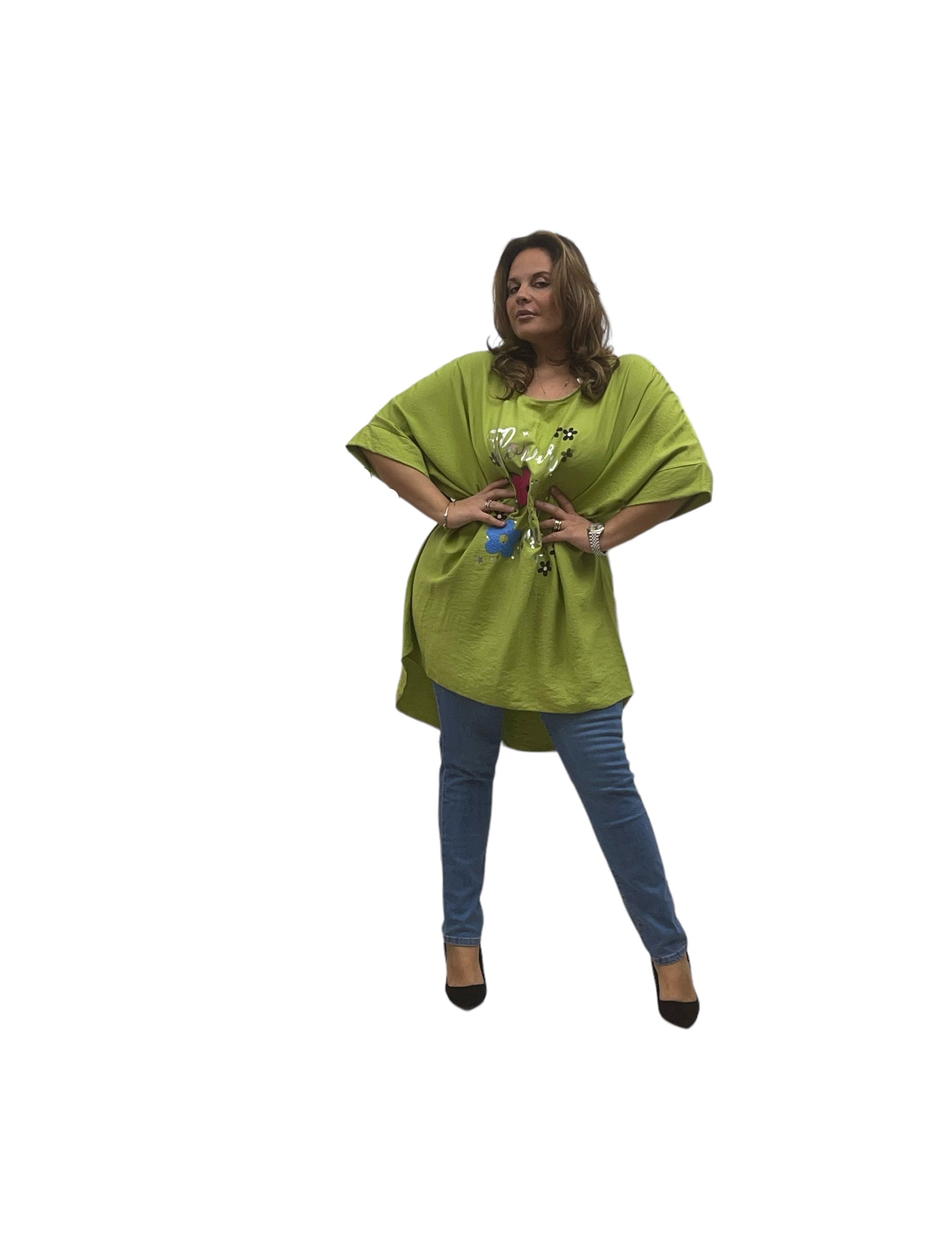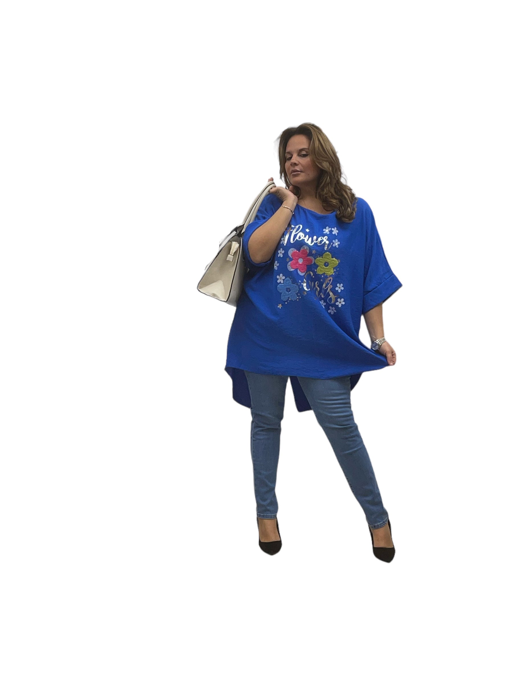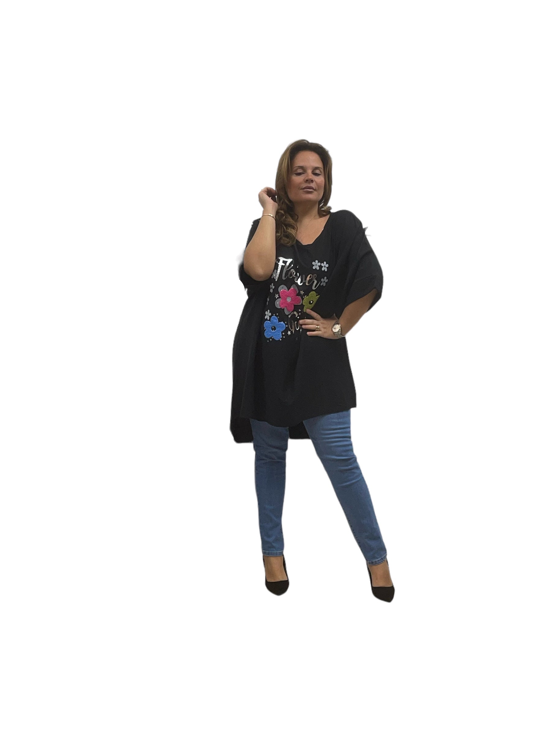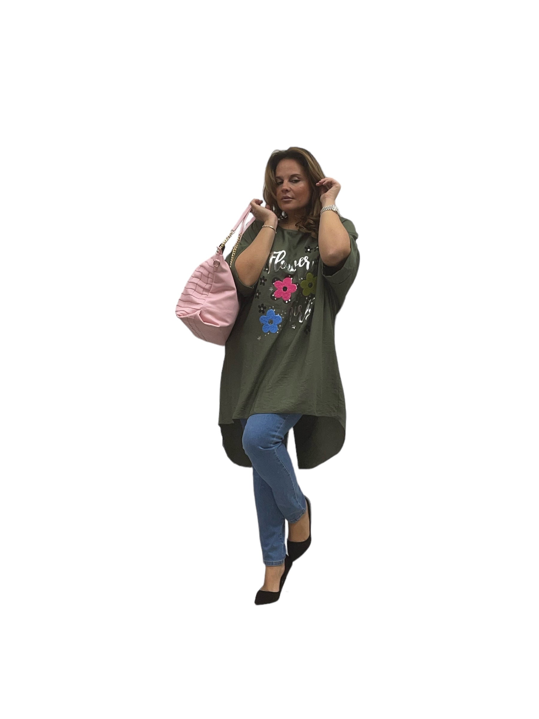 Magliettone over lungo con spacchetto dietro e fiori ricamati