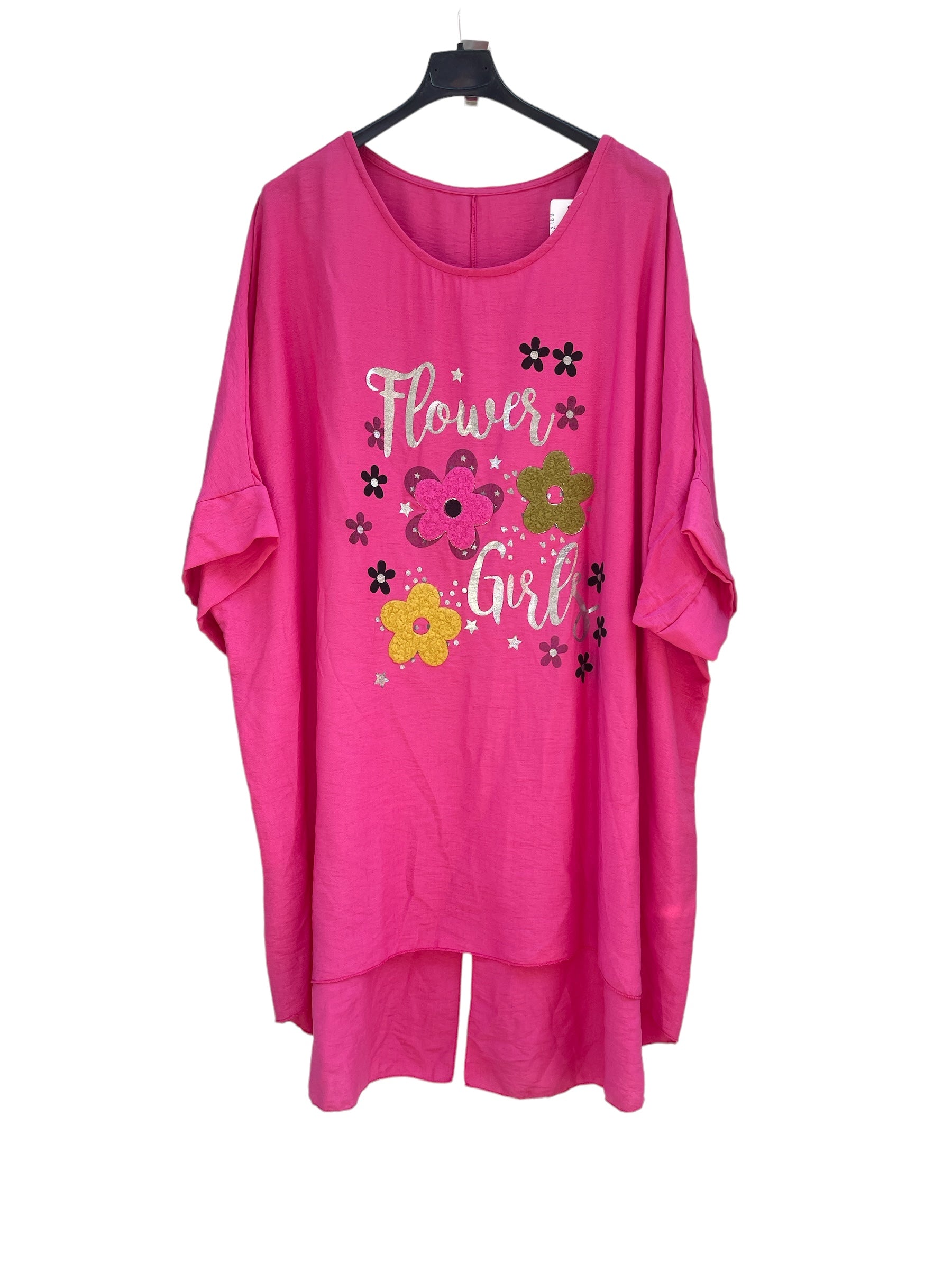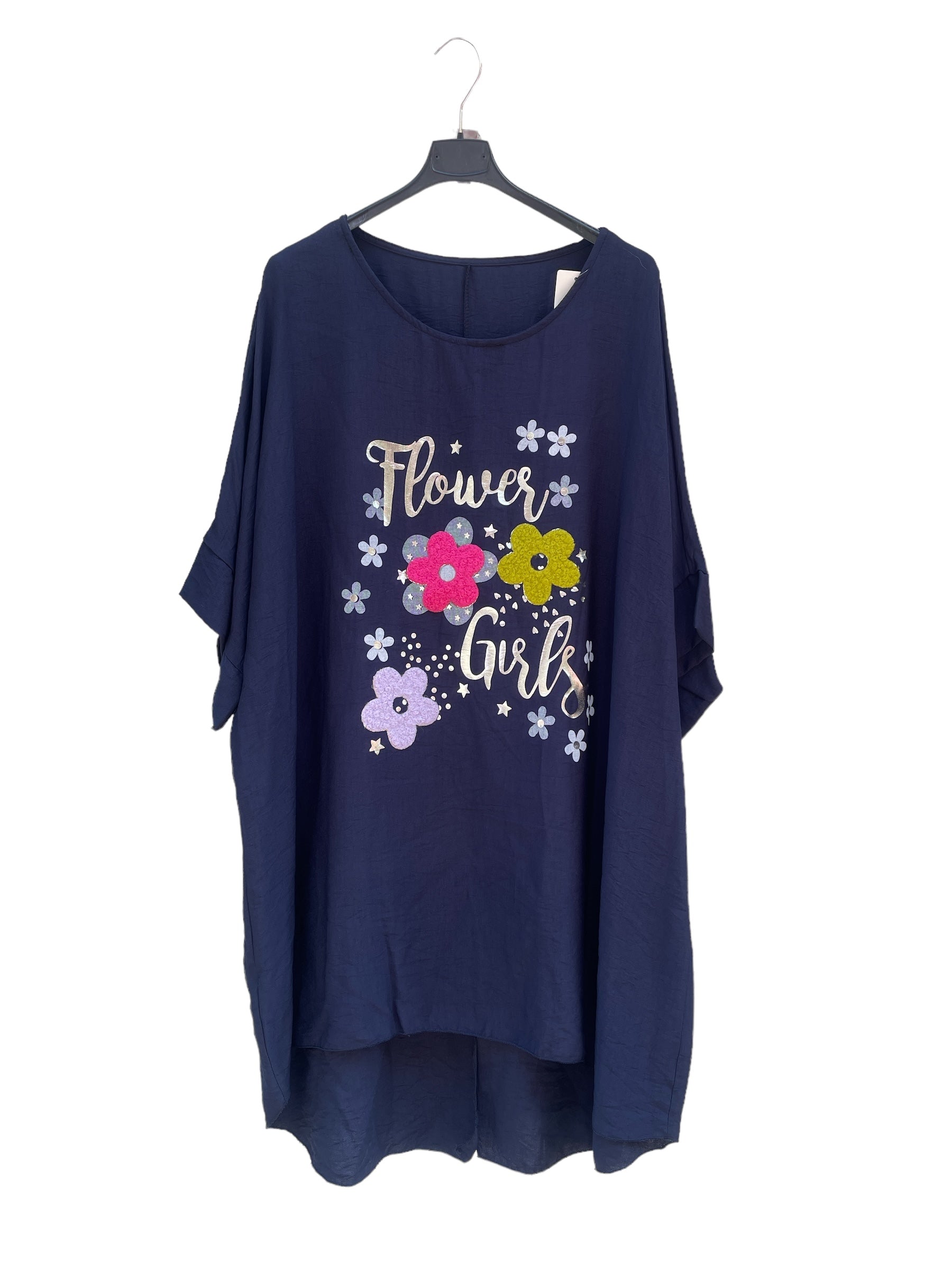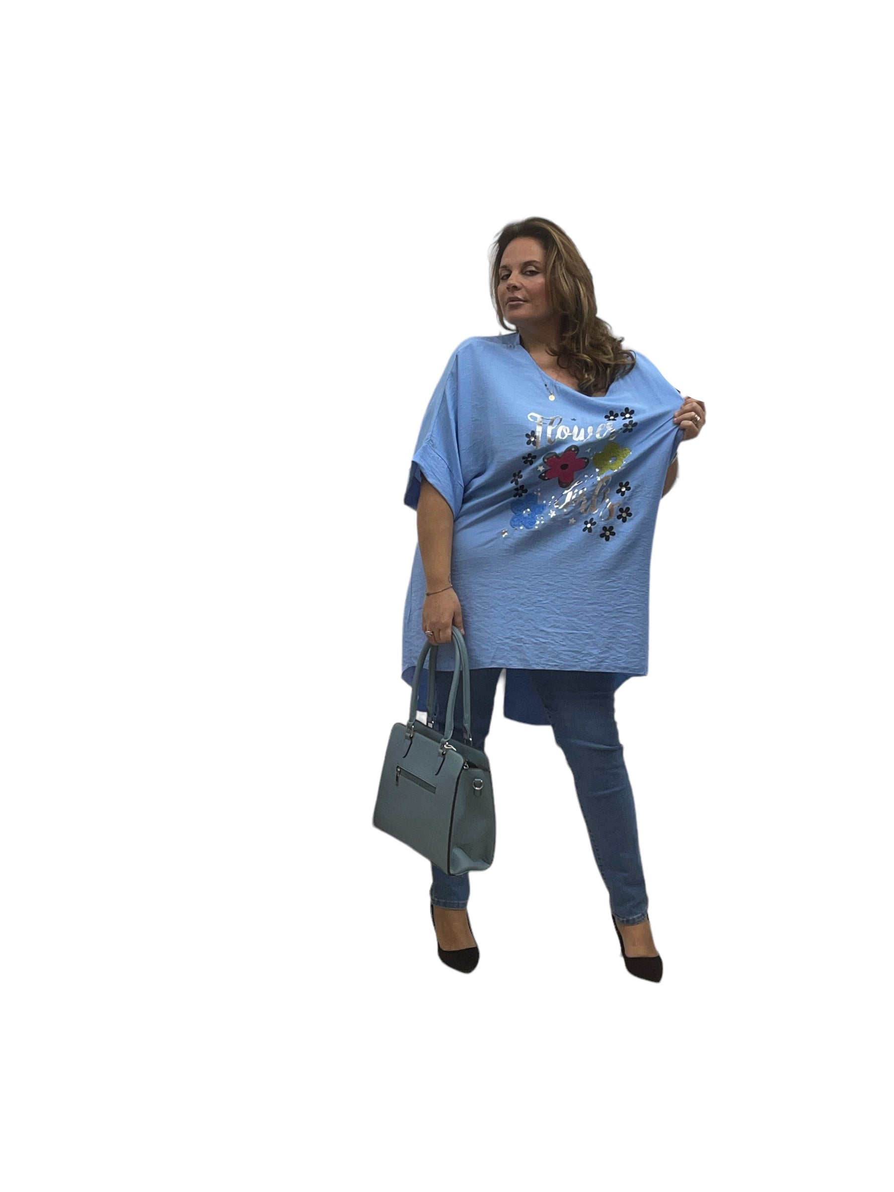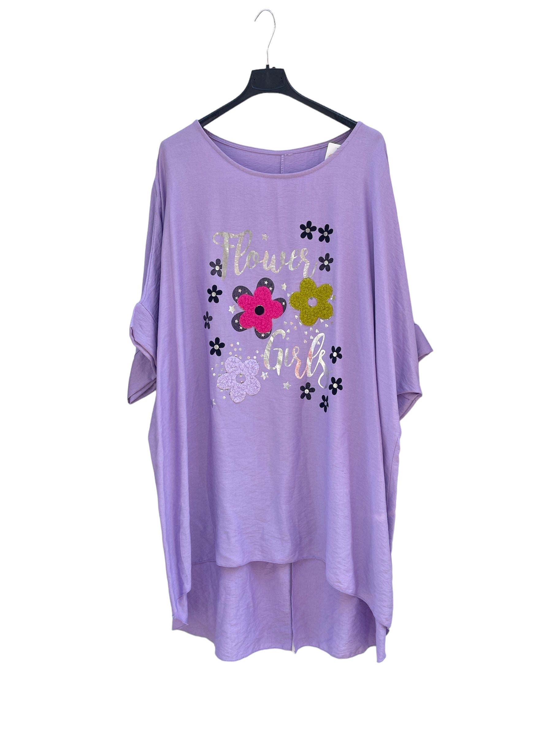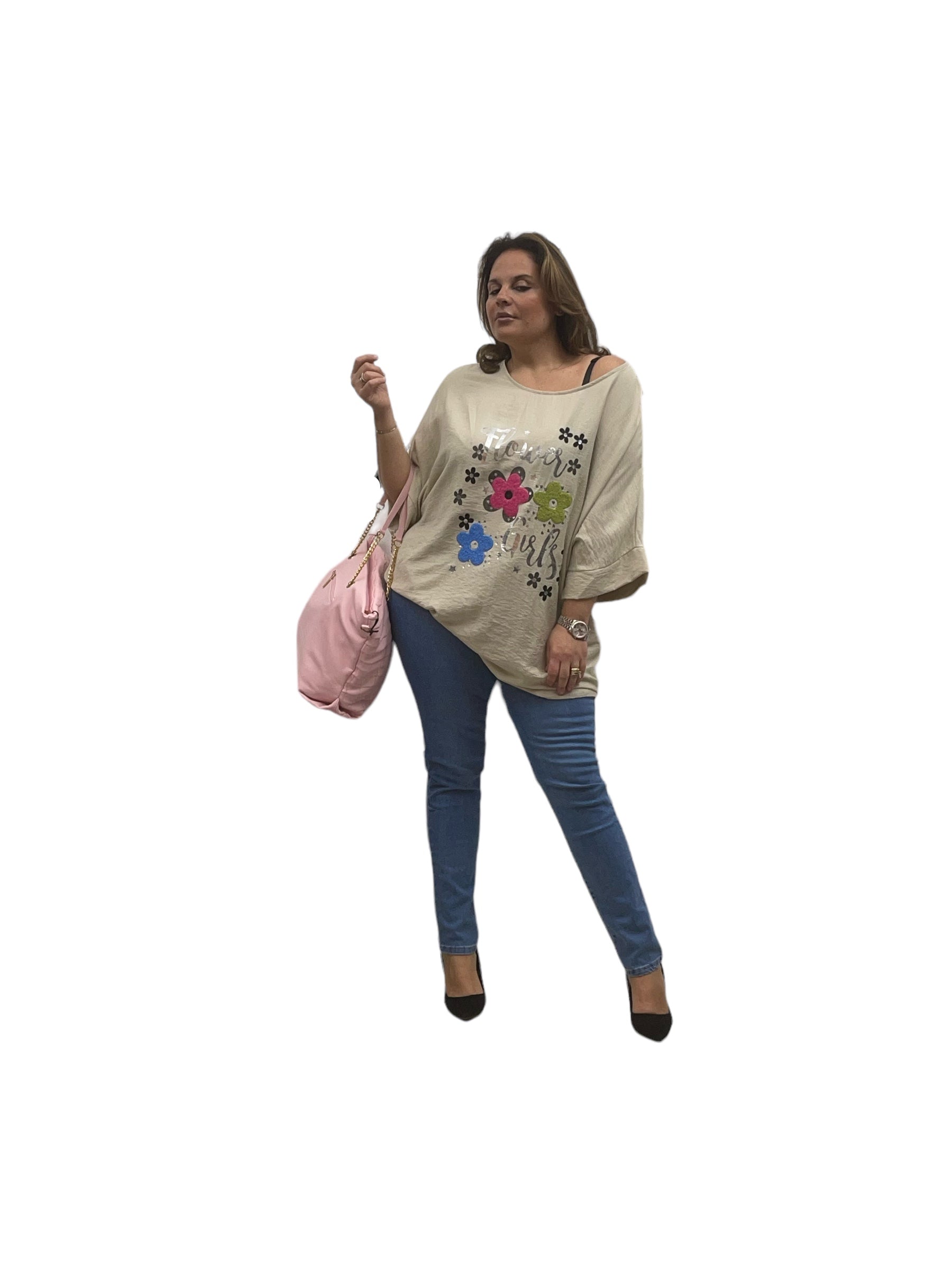 Magliettone over lungo con spacchetto dietro e fiori ricamati