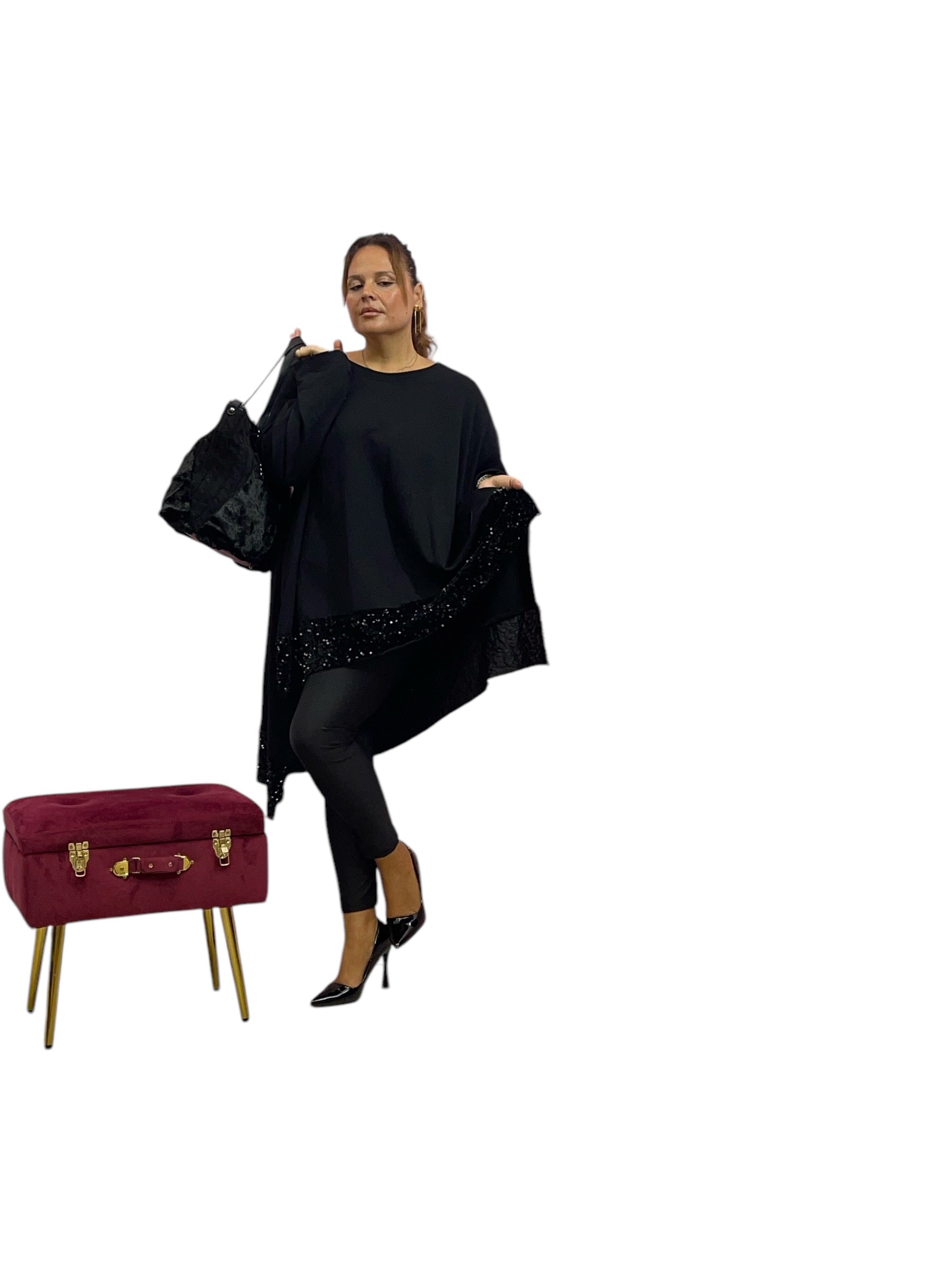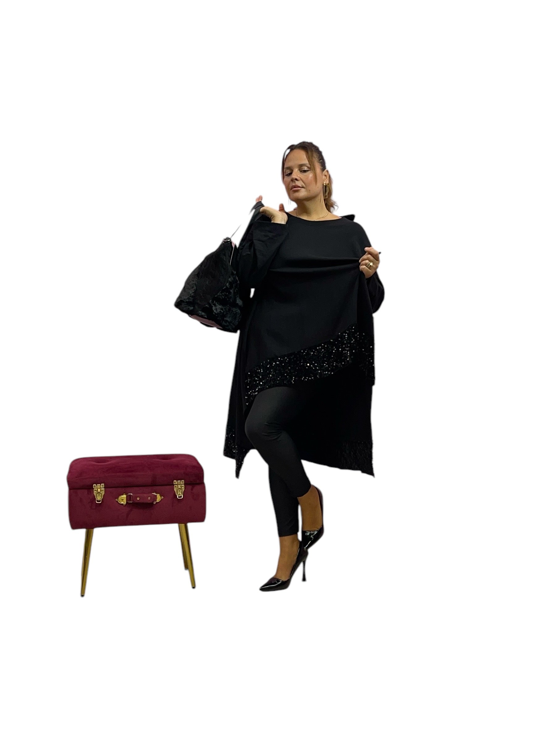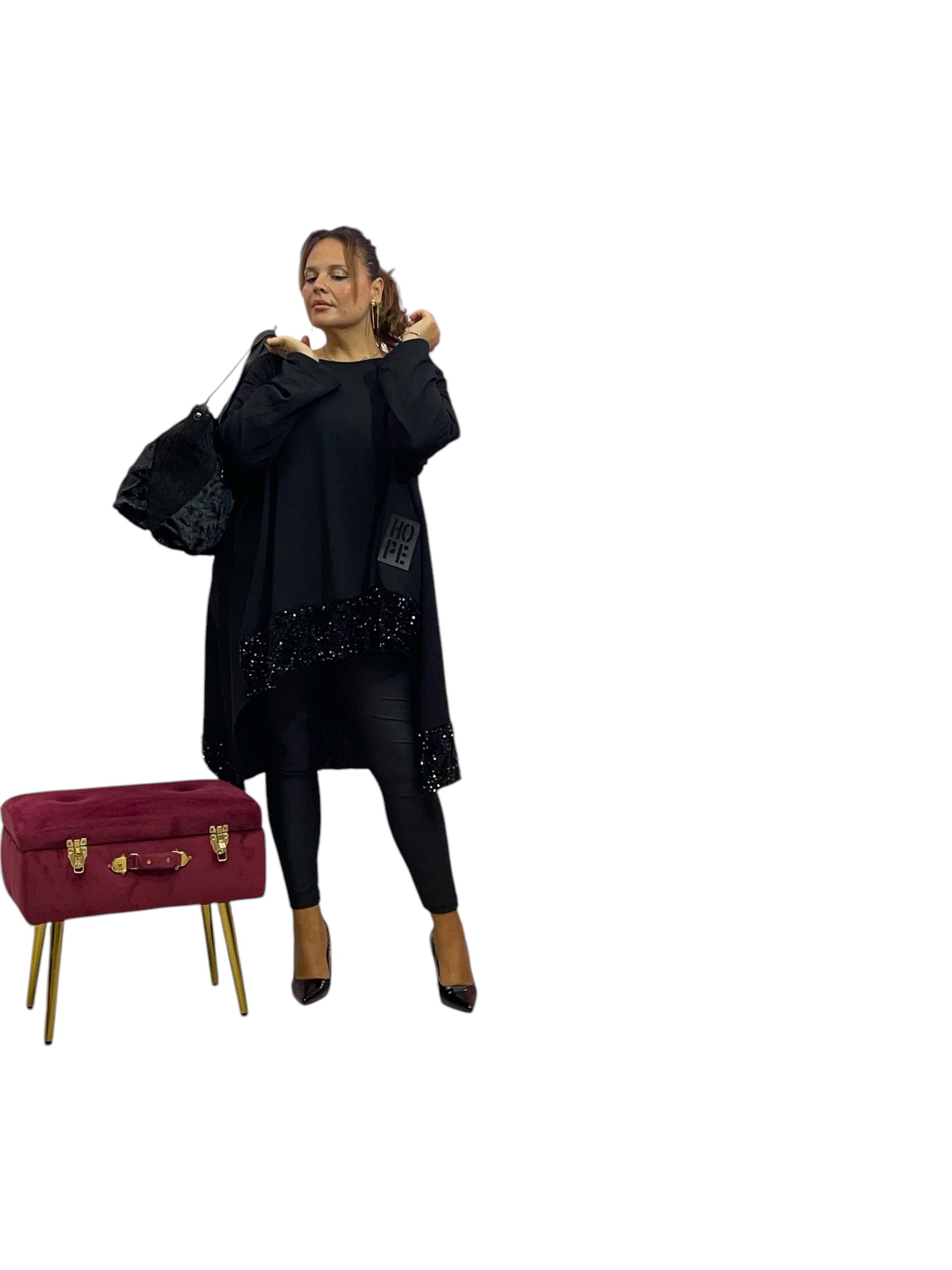 Magliettone/abito over in felpa corto avanti e lungo dietro con fascia di ciniglia e paiette e felpato internamente