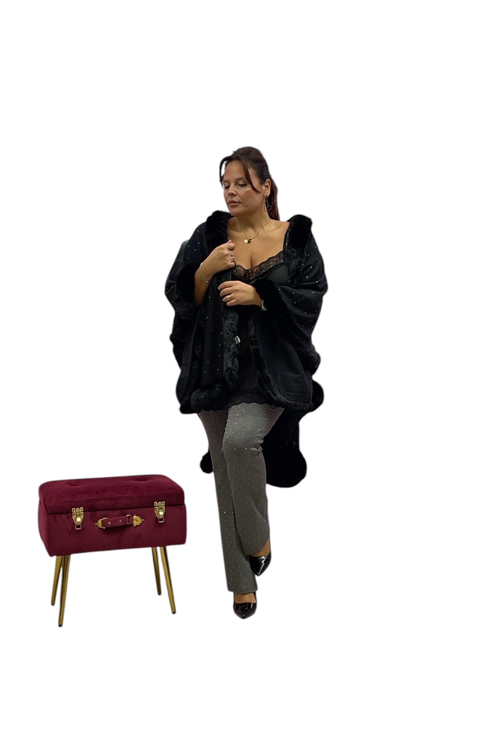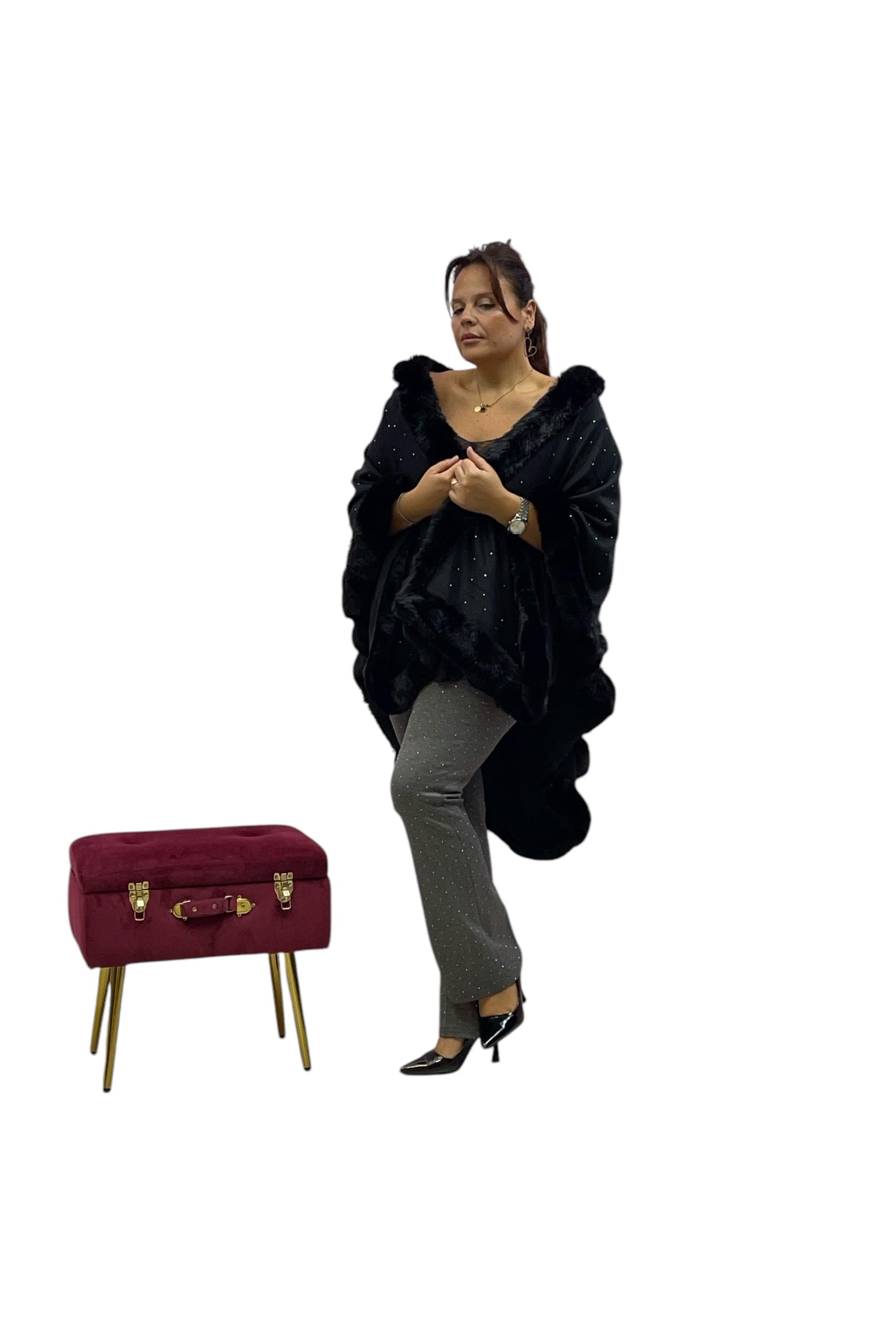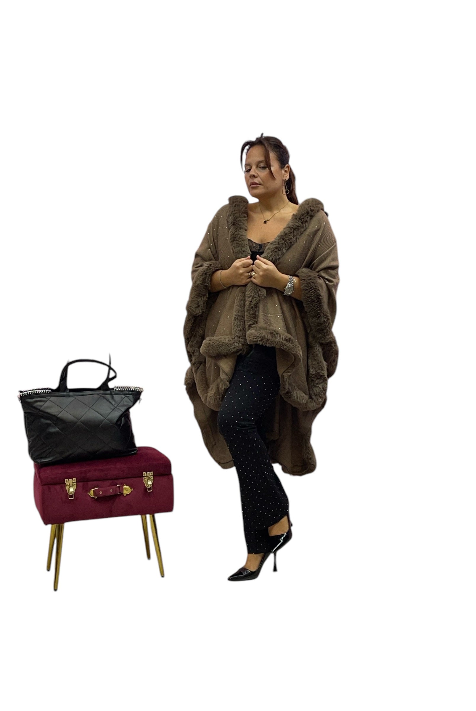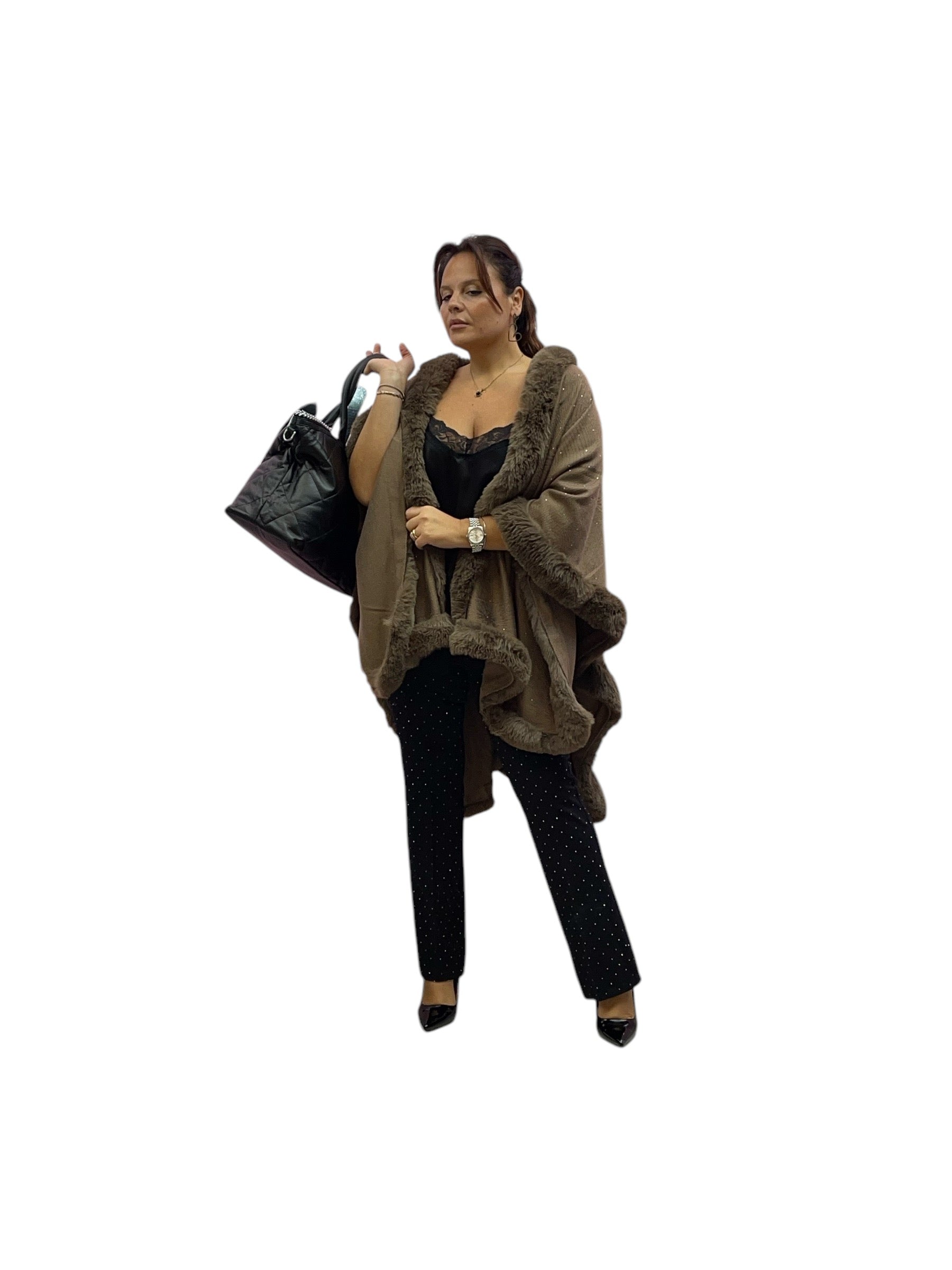 Mantella over con bordo ecopelliccia e brillantini
