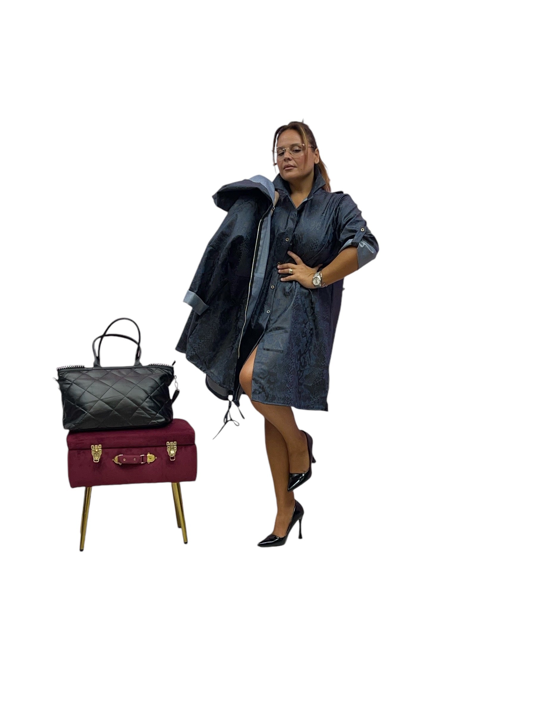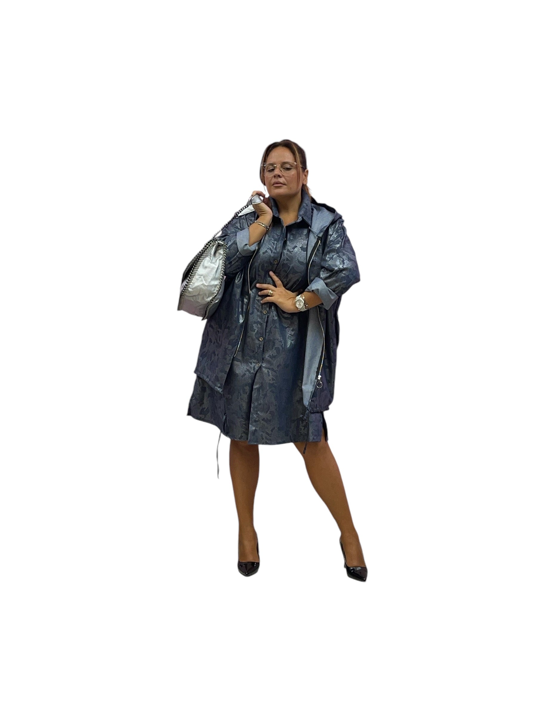 Spolverino con cappuccio tessuto jeans fantasia